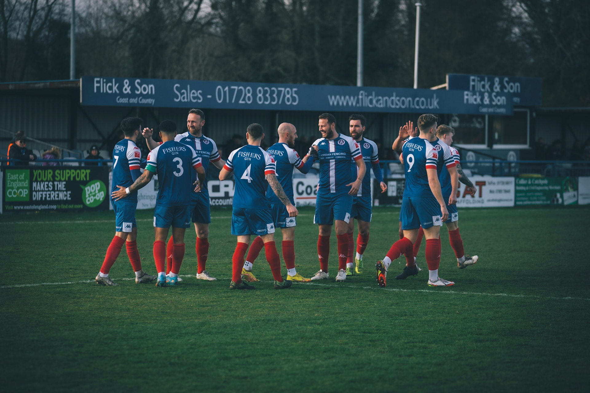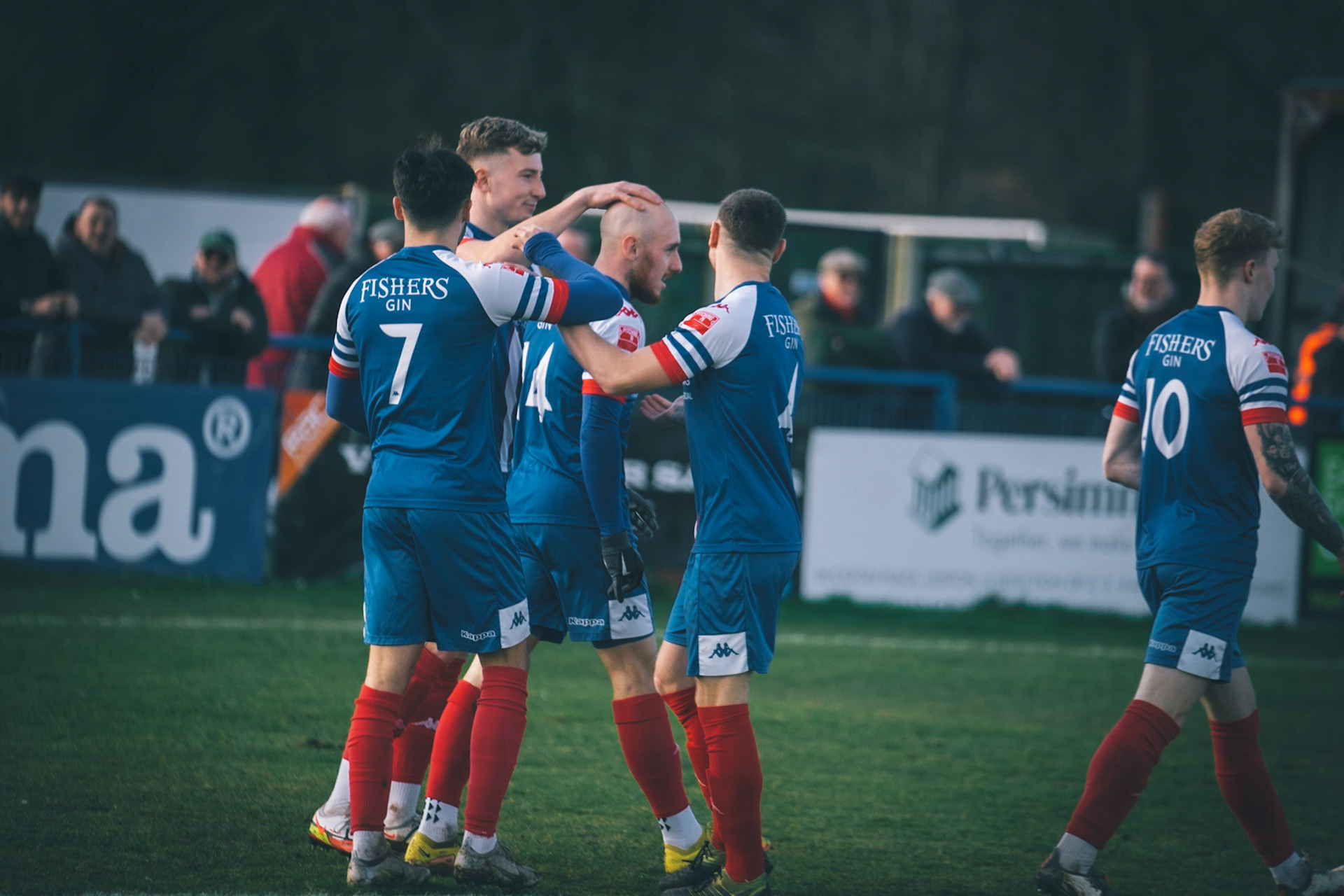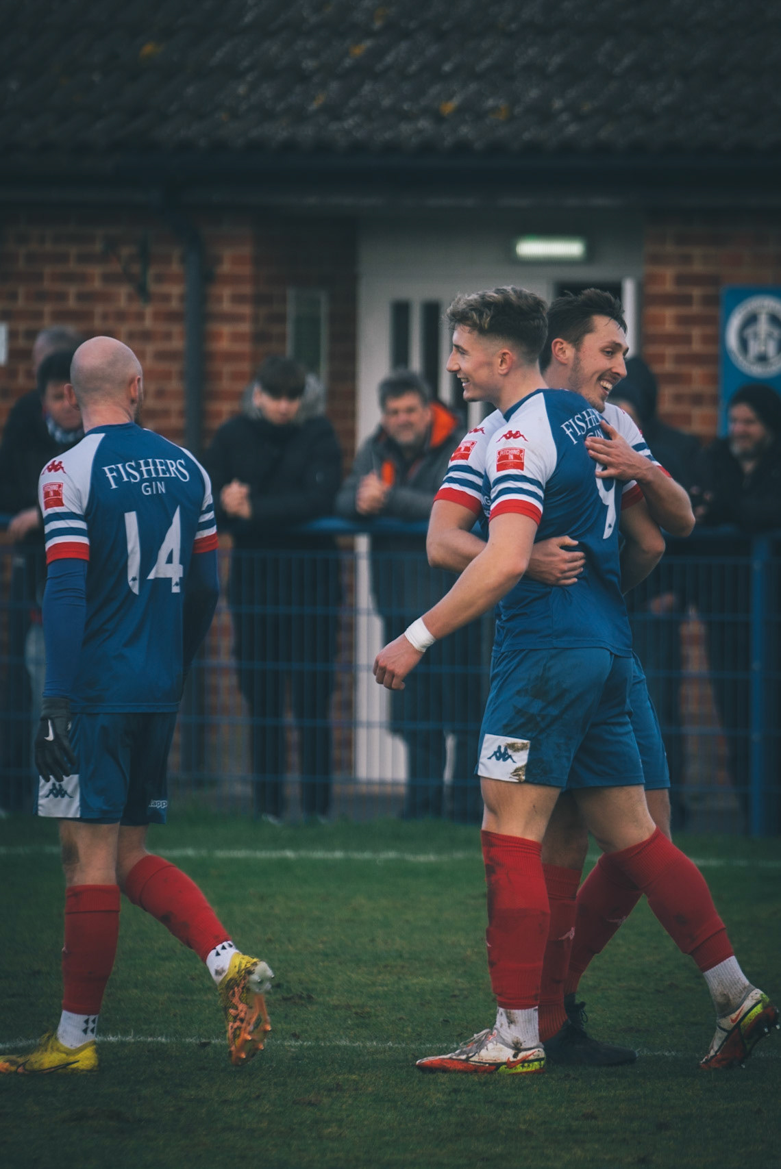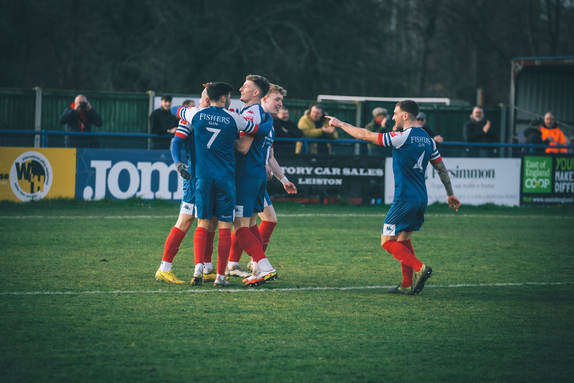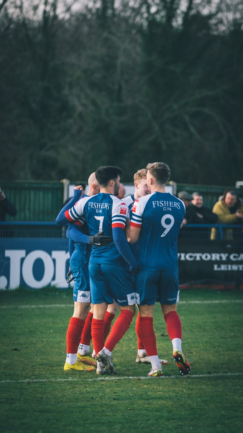 Leiston celebrating with Captain Seb Dunbar leaping on top of goal scorer Will Davies