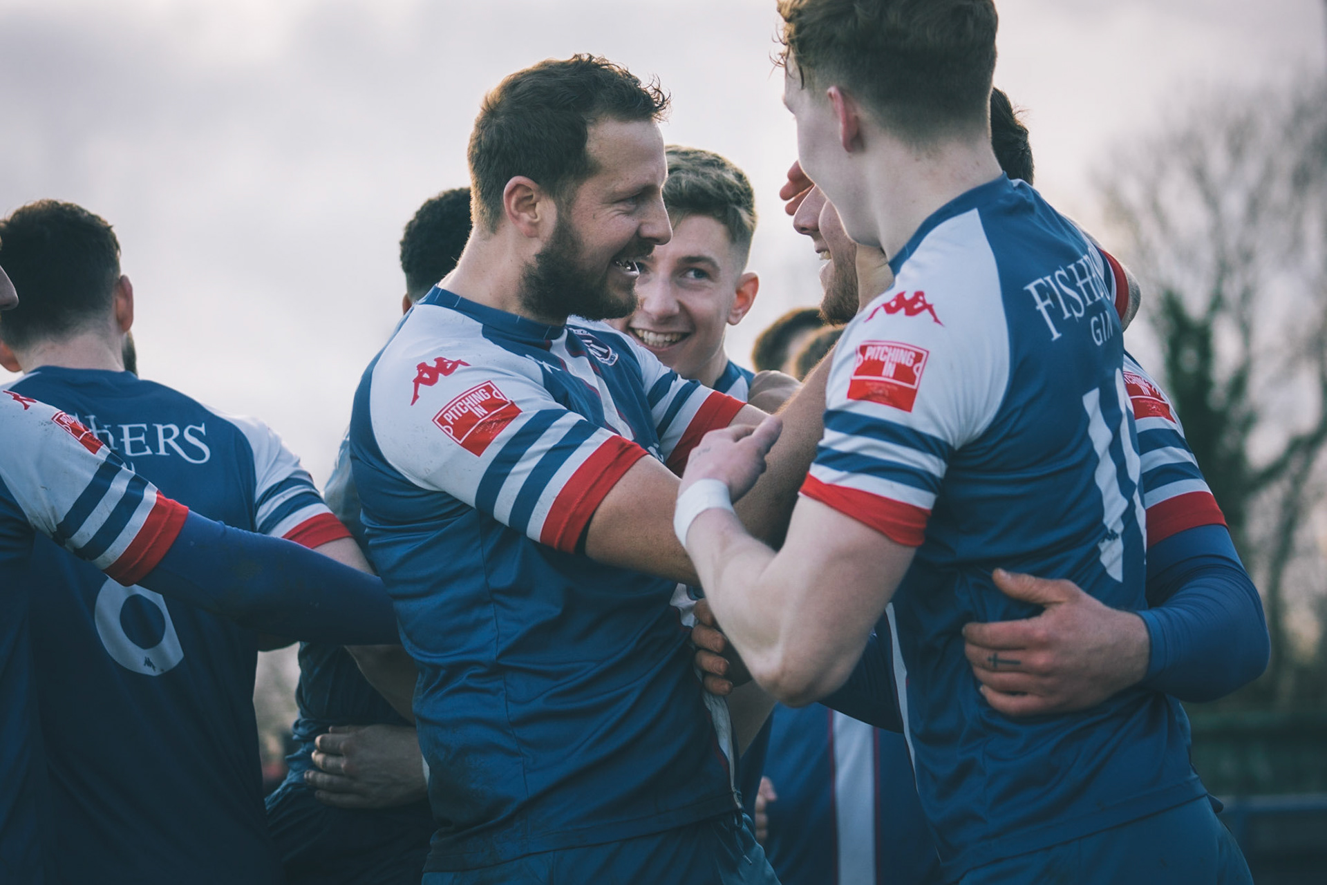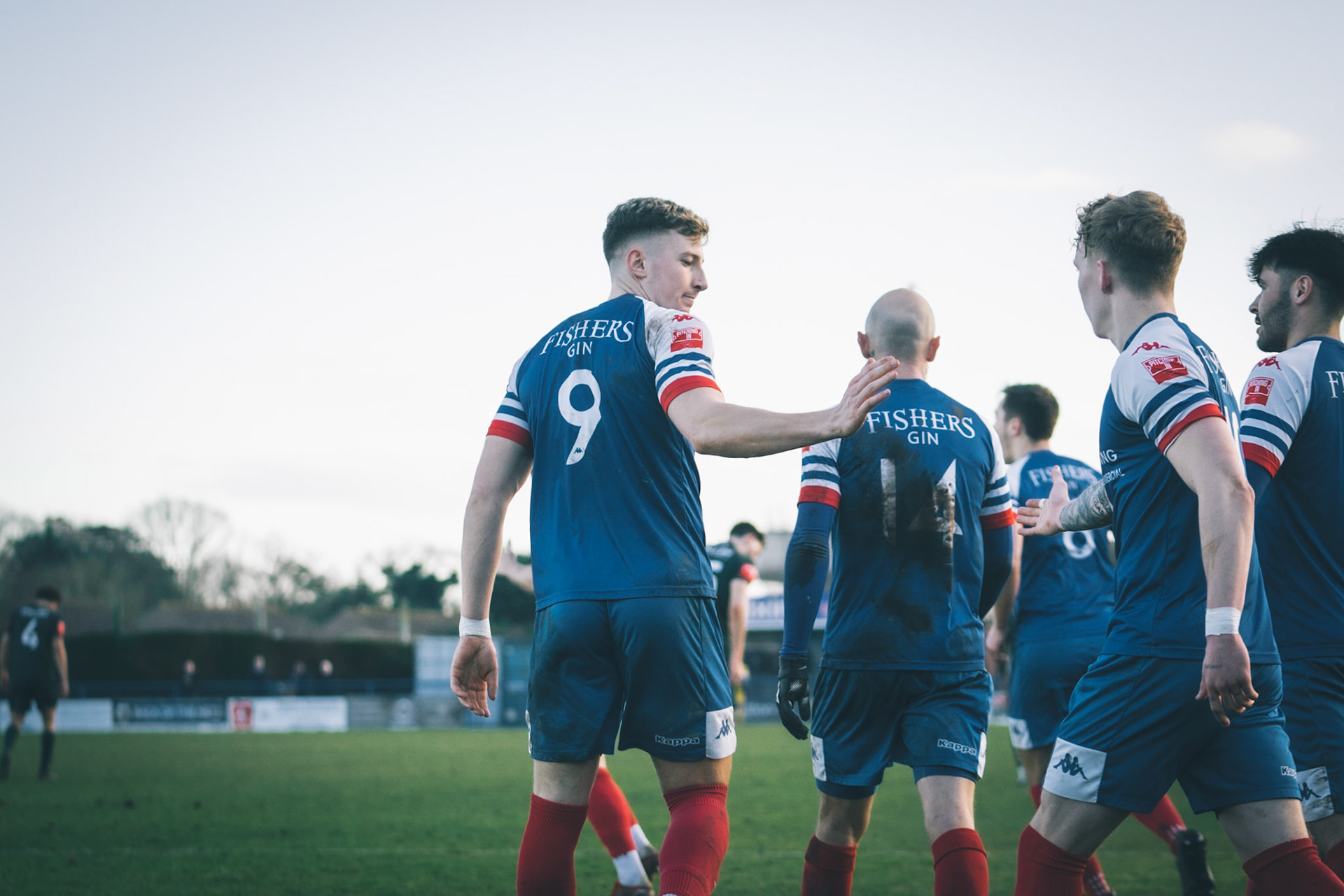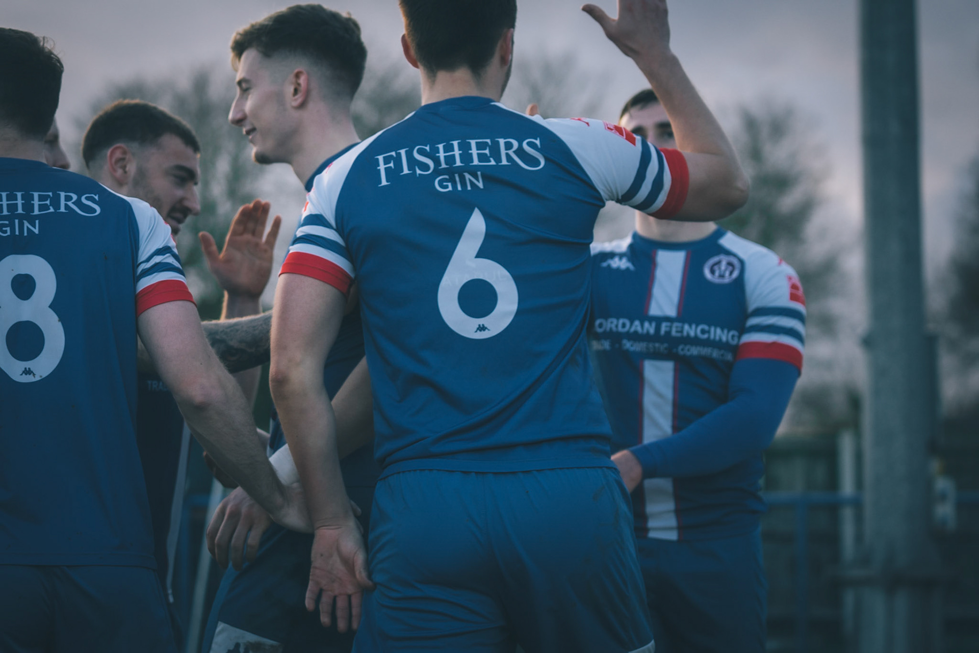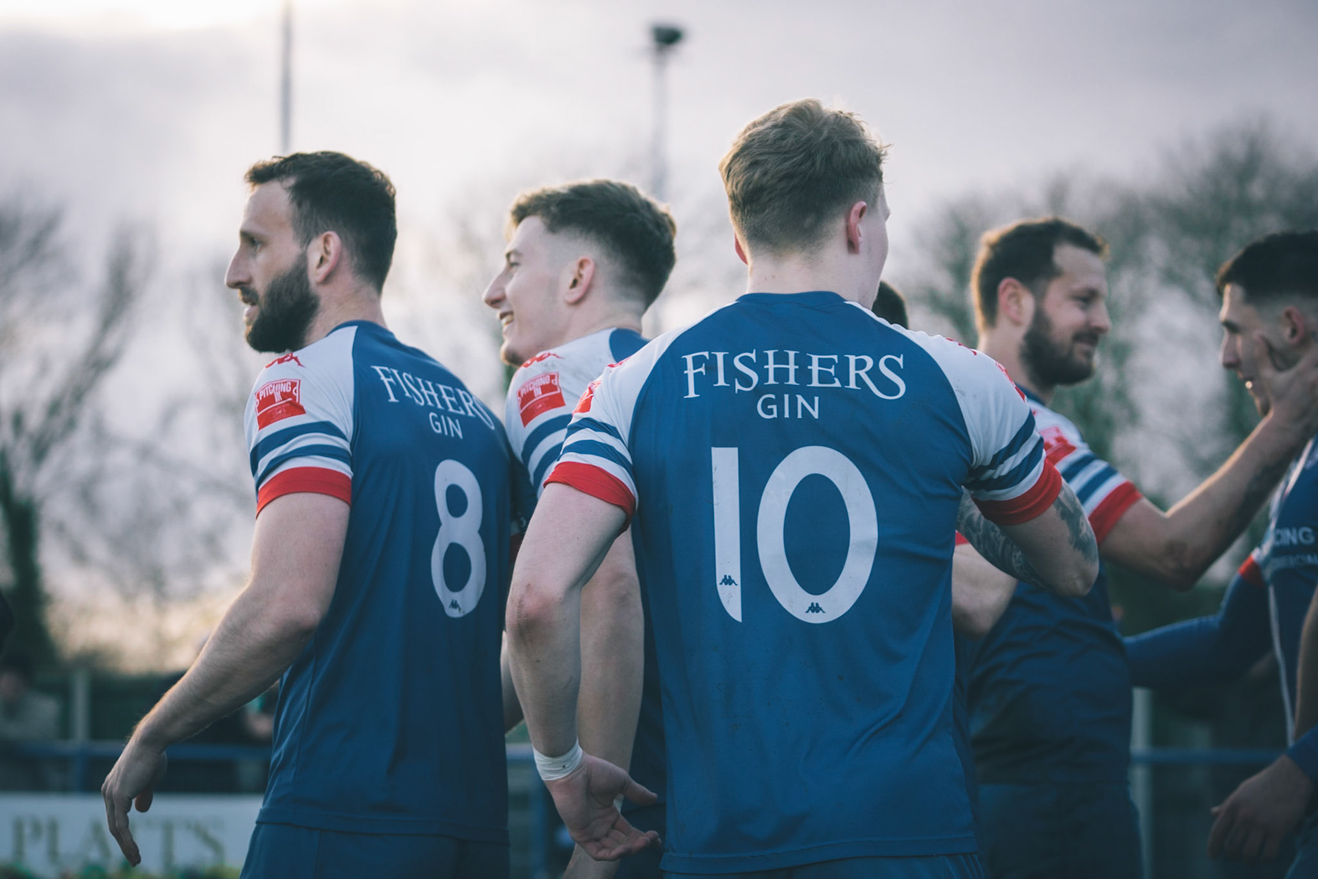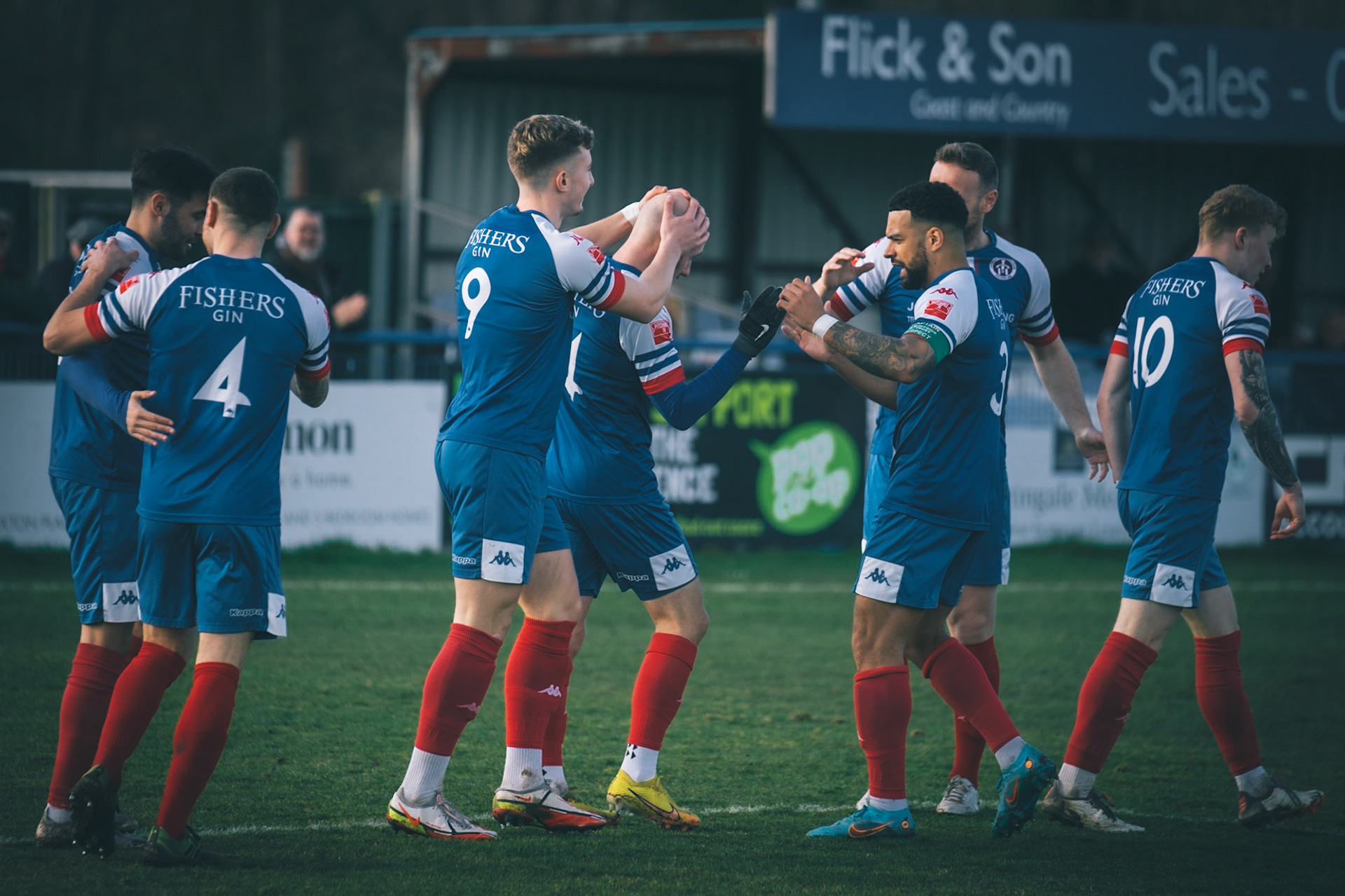 Leiston celebrating with Captain Seb Dunbar leaping on top of goal scorer Will Davies