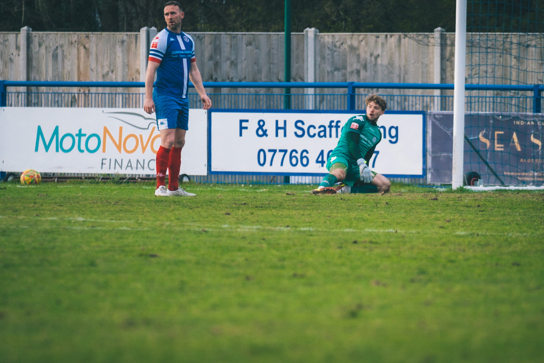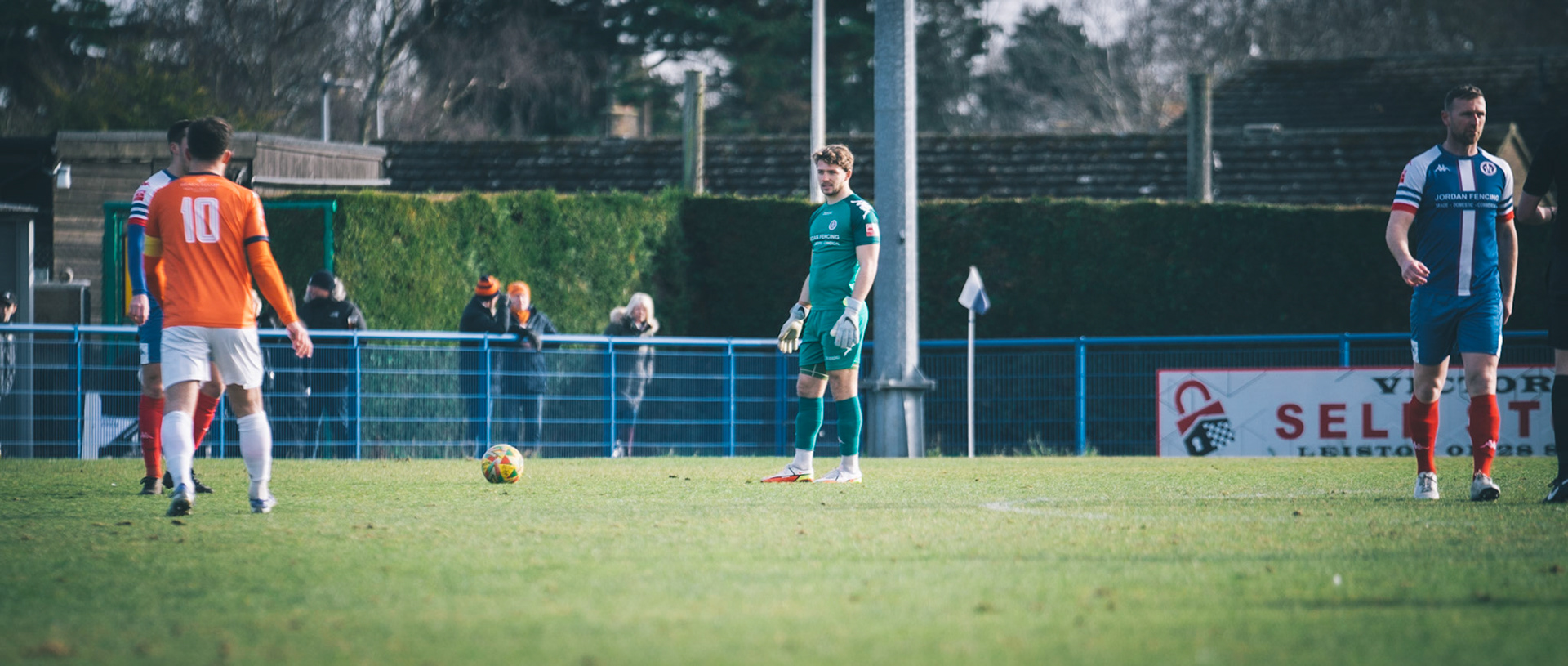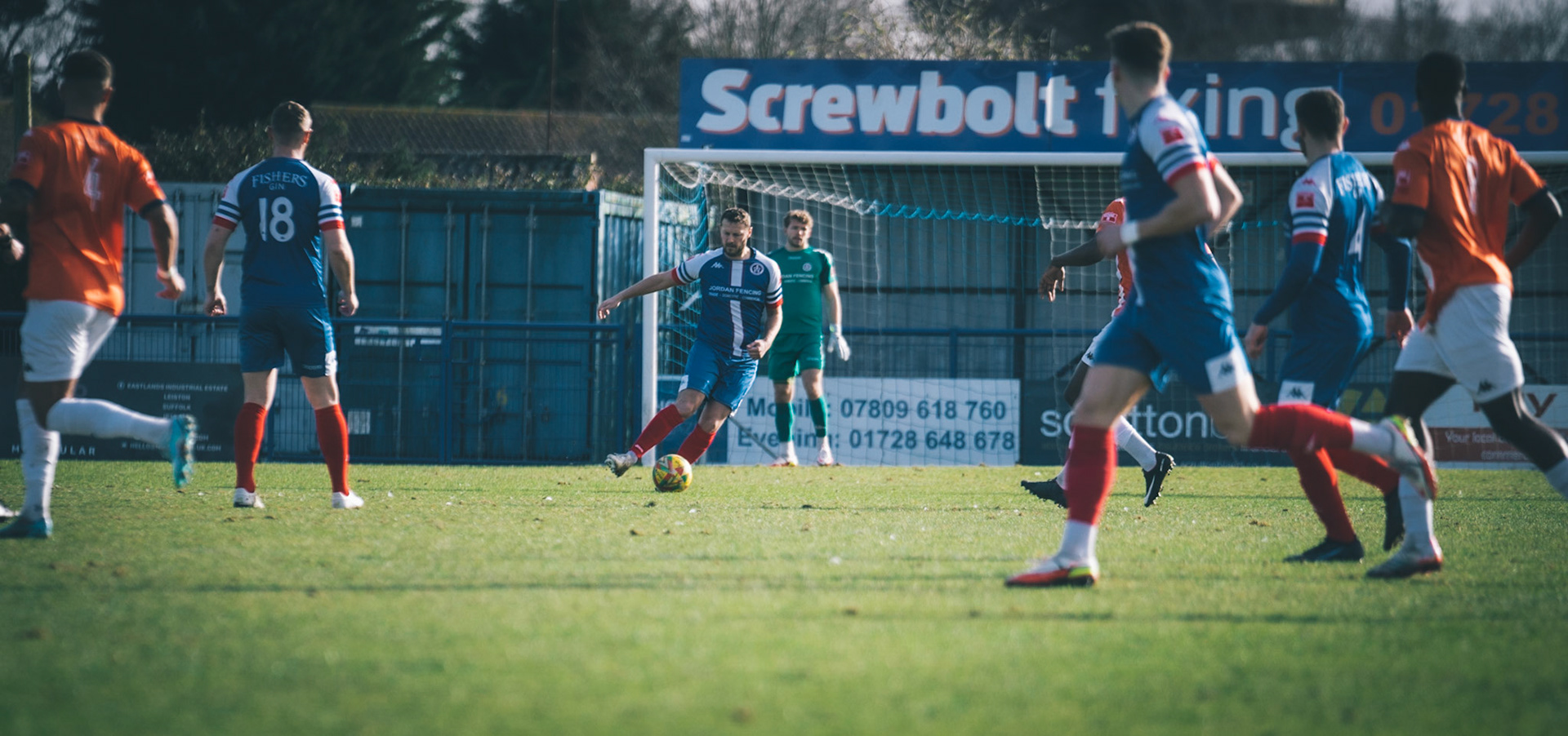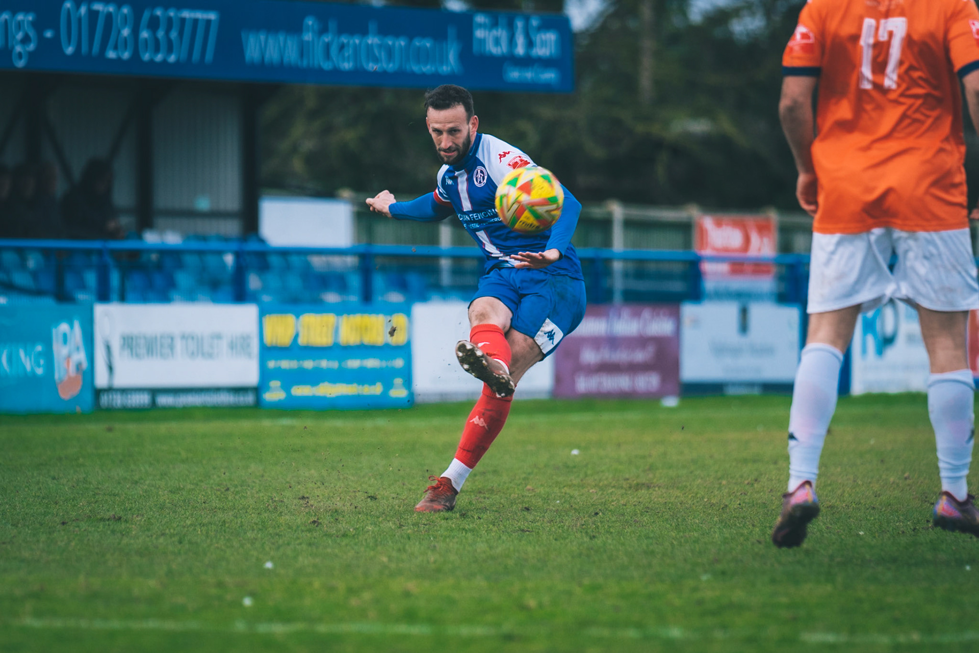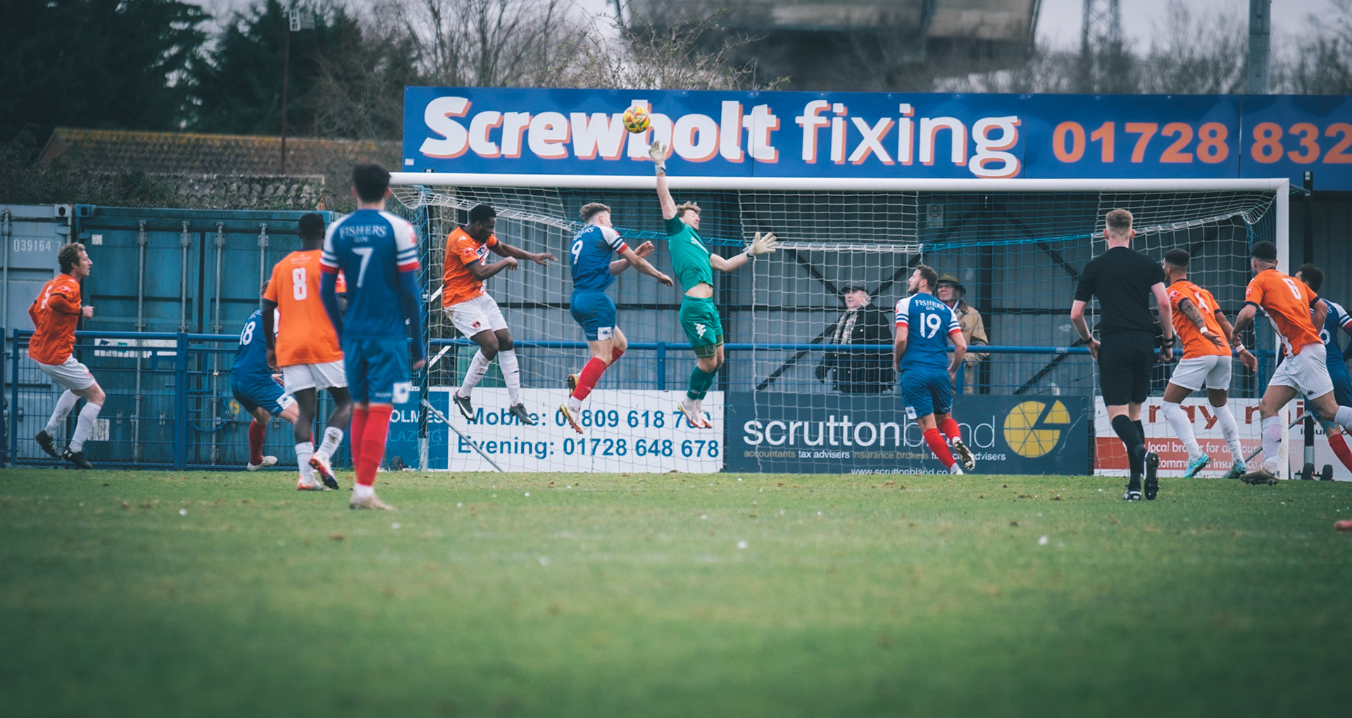 Adam Mills striking the ball with the stratford g.k pulling off a good save to keep it 0-0