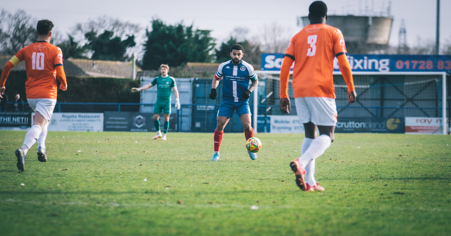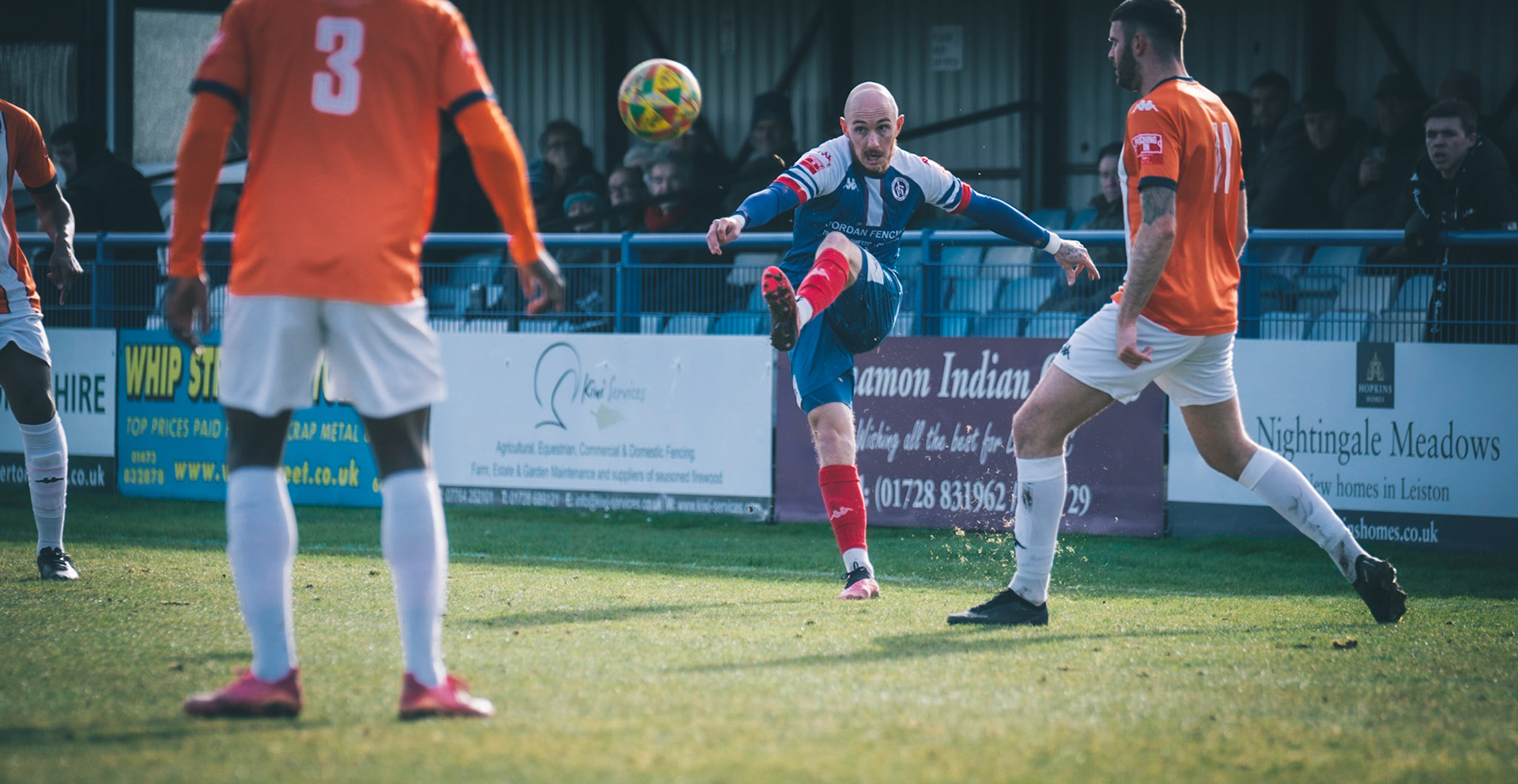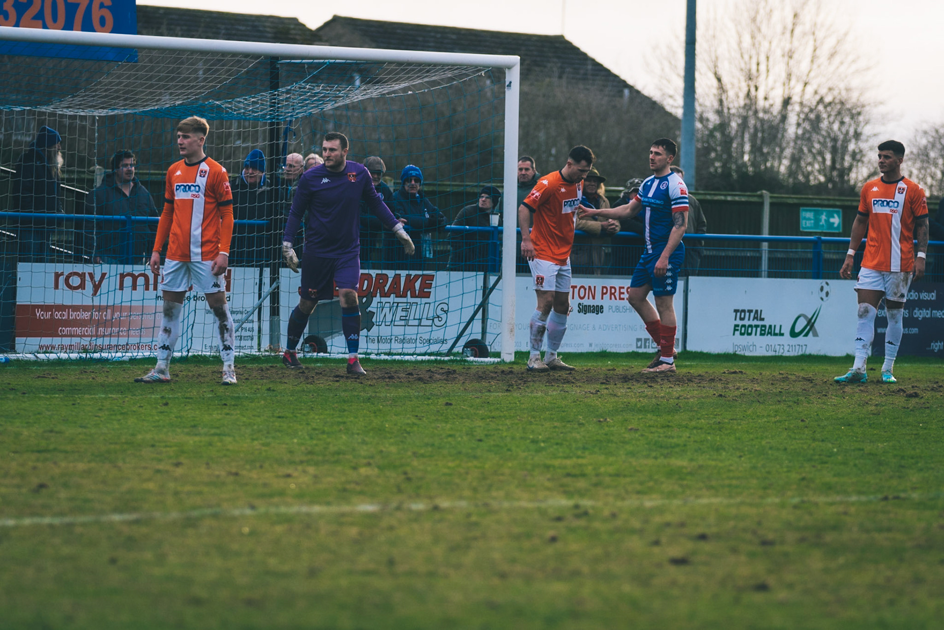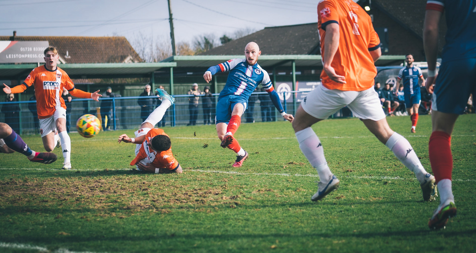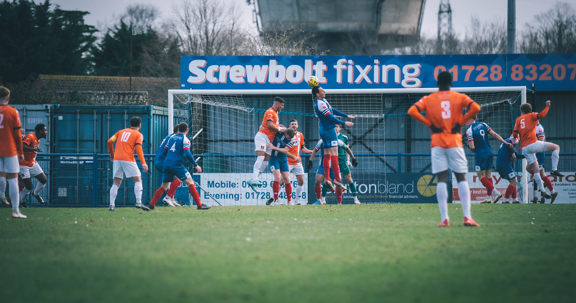 Adam Mills striking the ball with the stratford g.k pulling off a good save to keep it 0-0