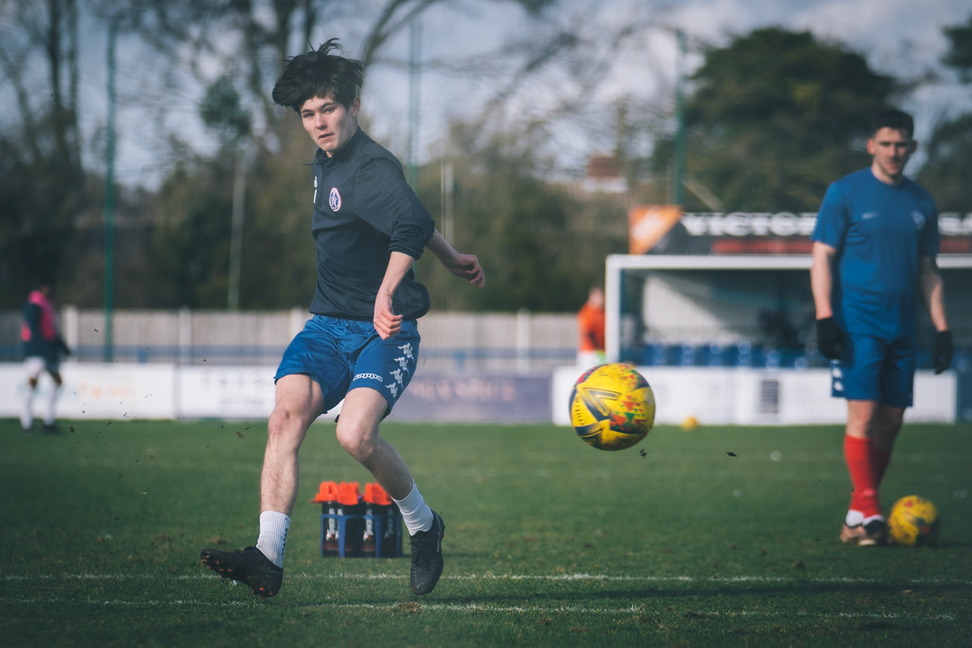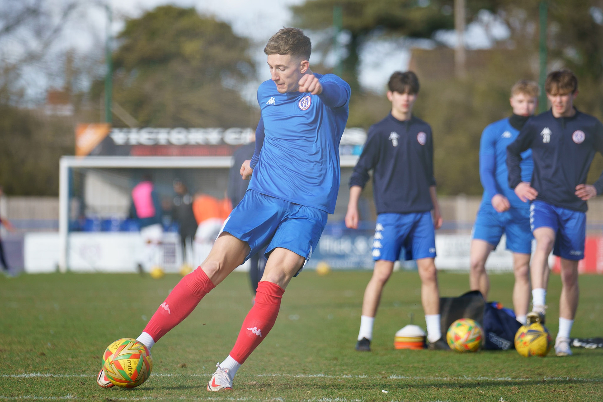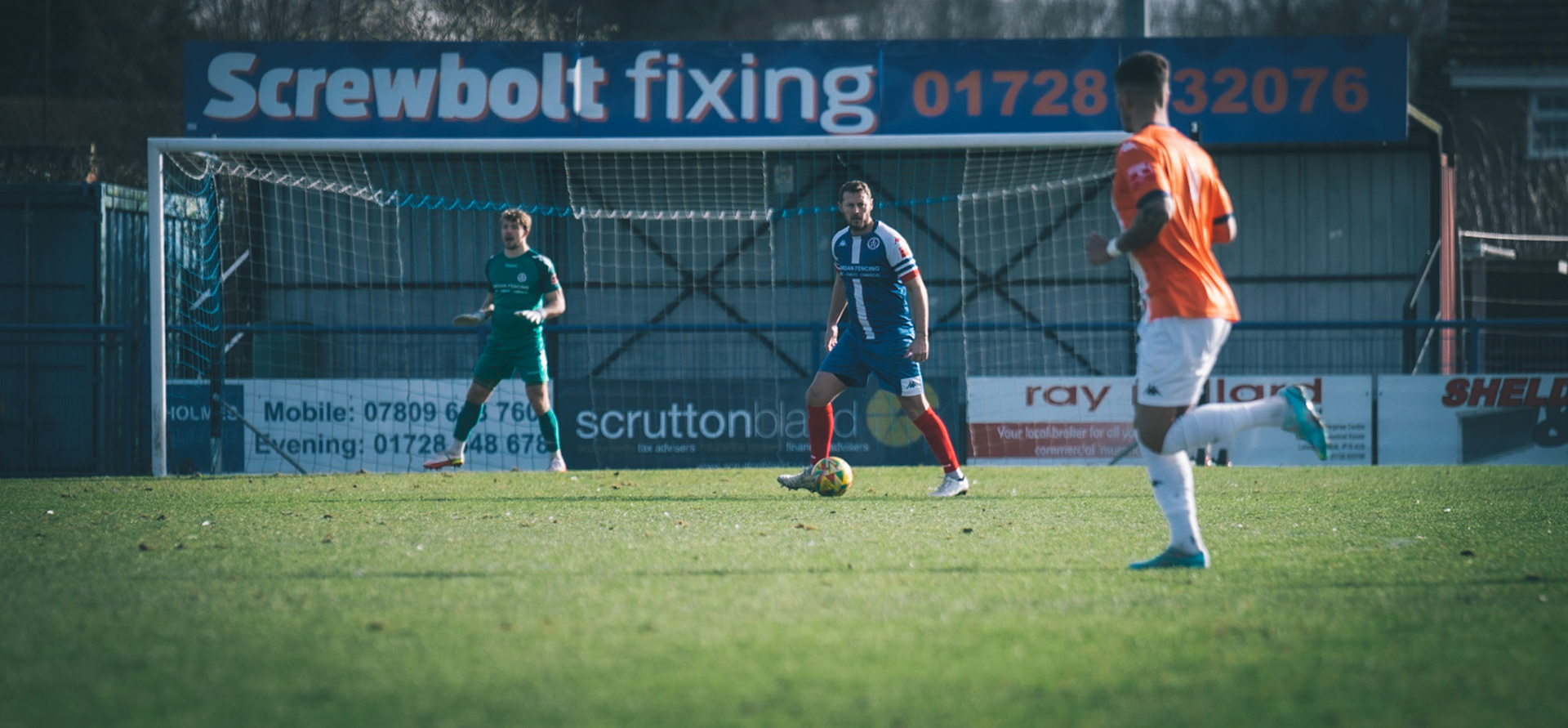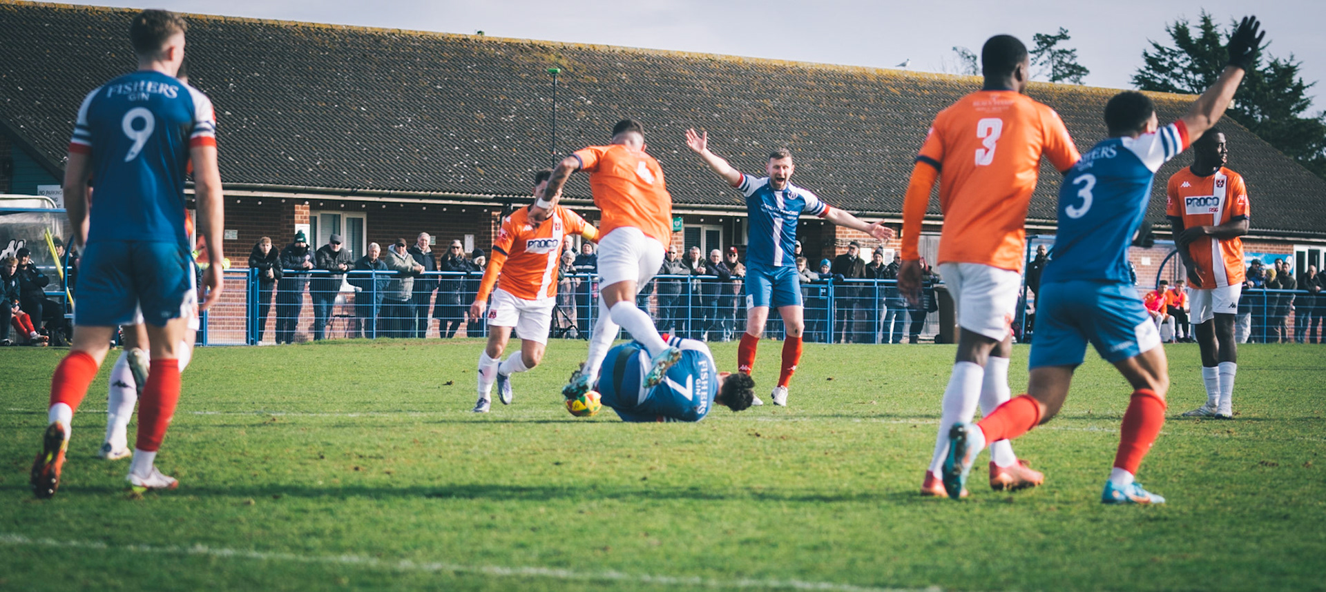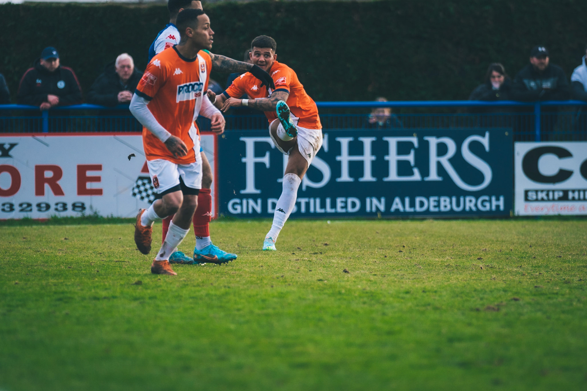 Adam Mills striking the ball with the stratford g.k pulling off a good save to keep it 0-0