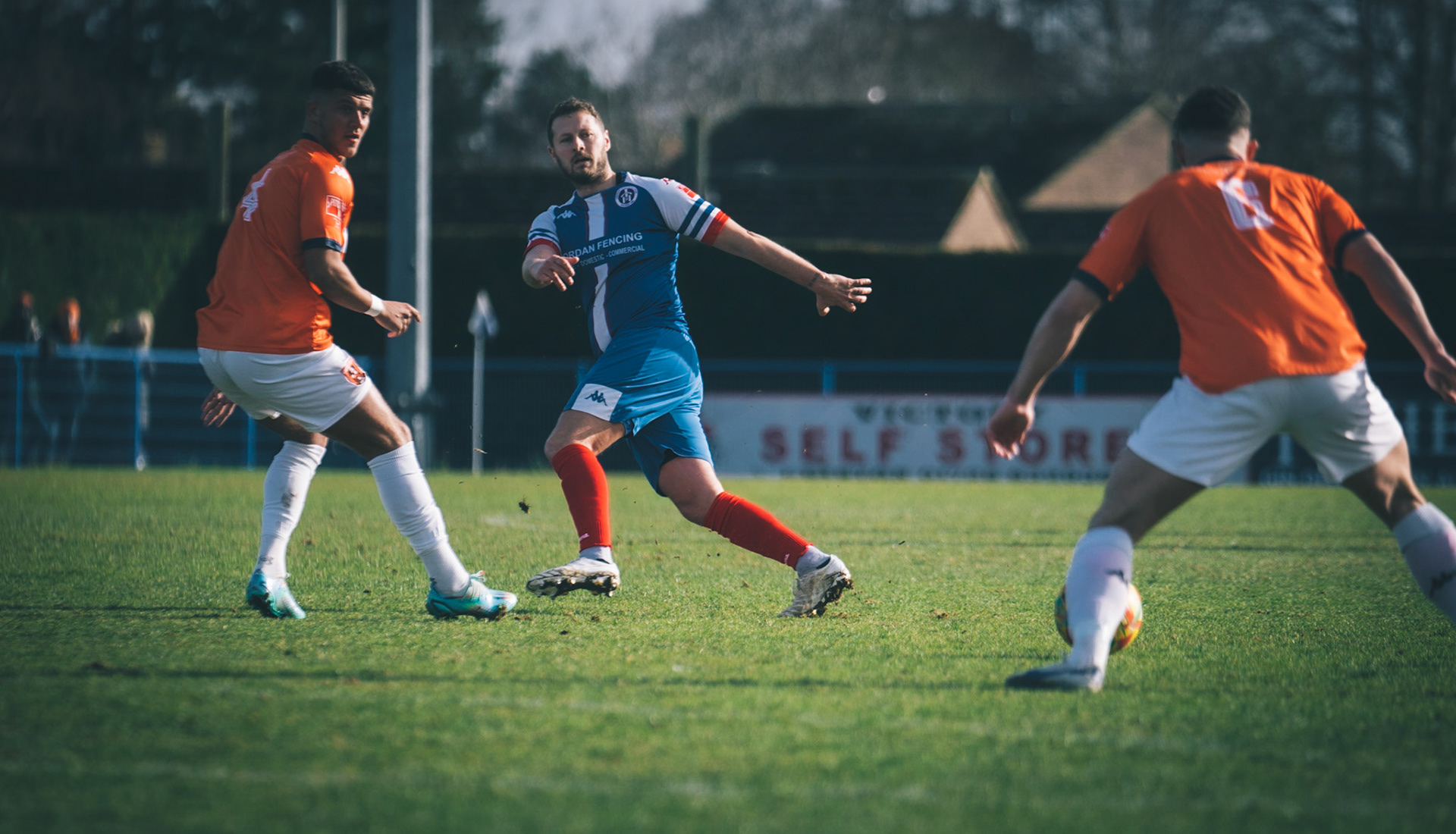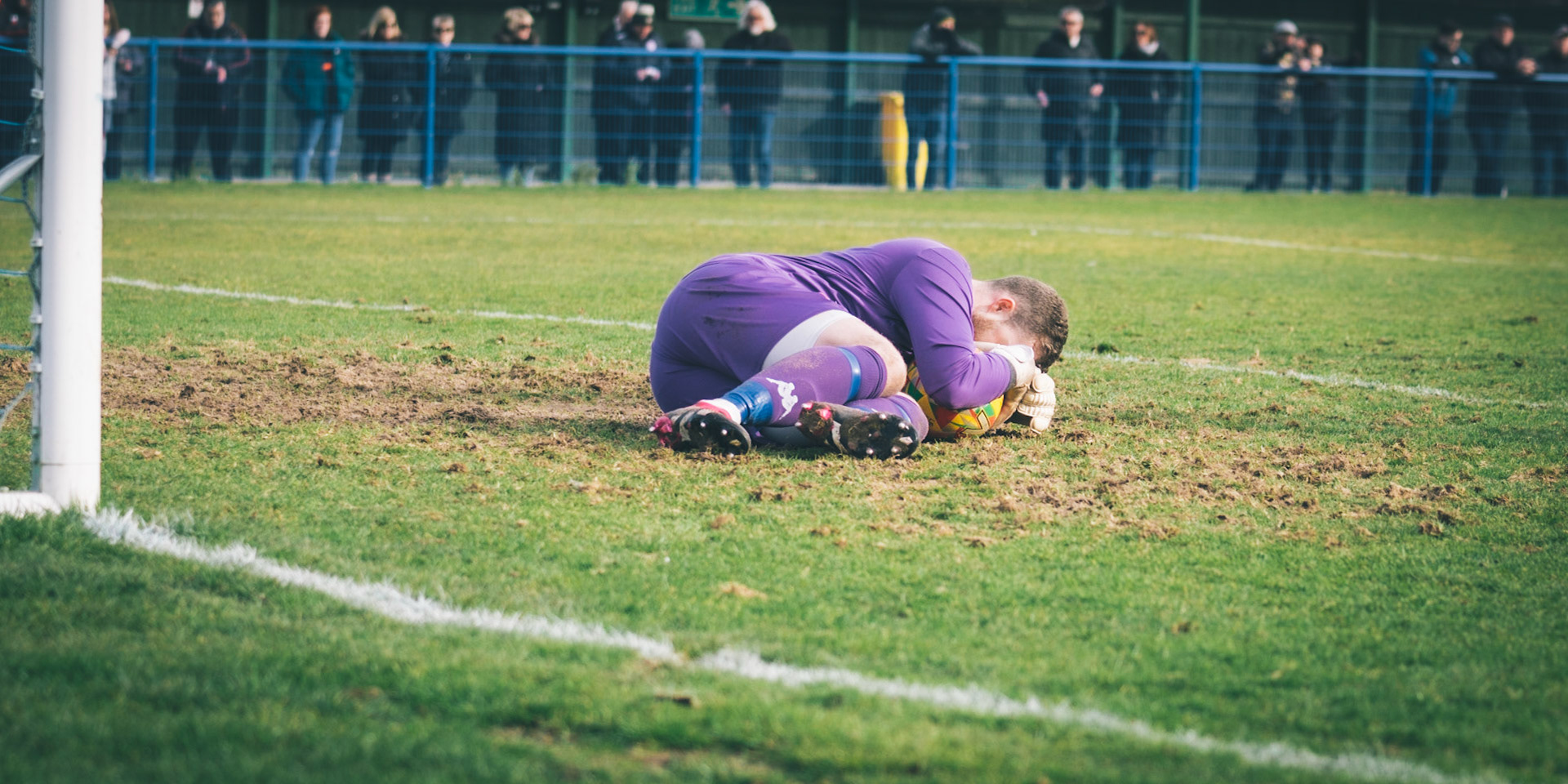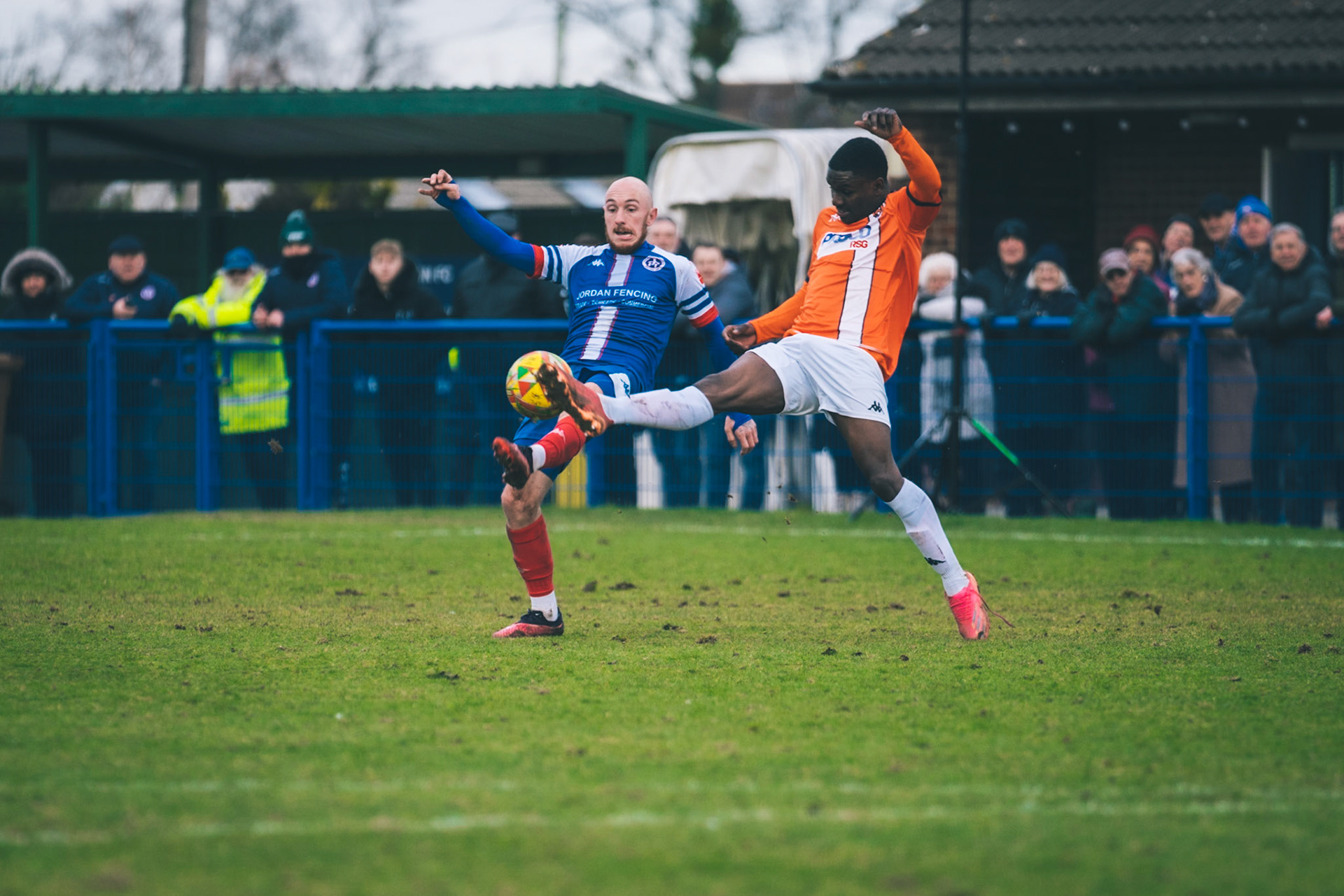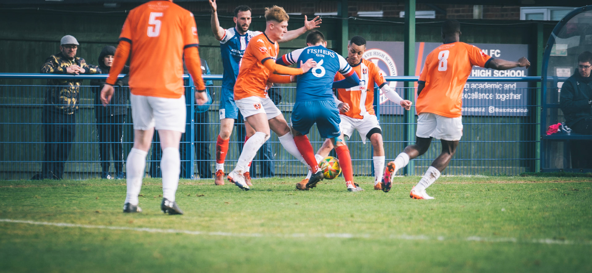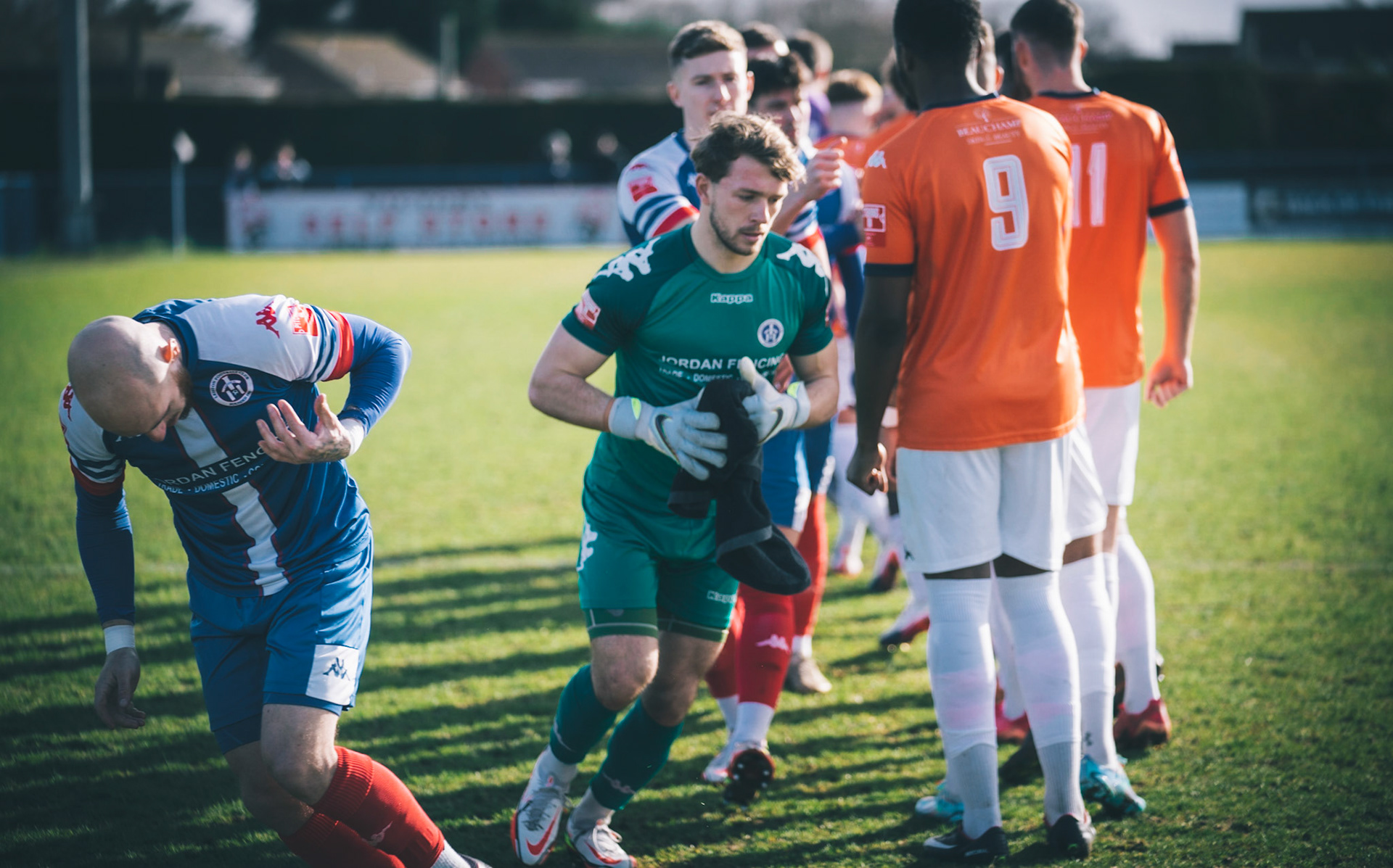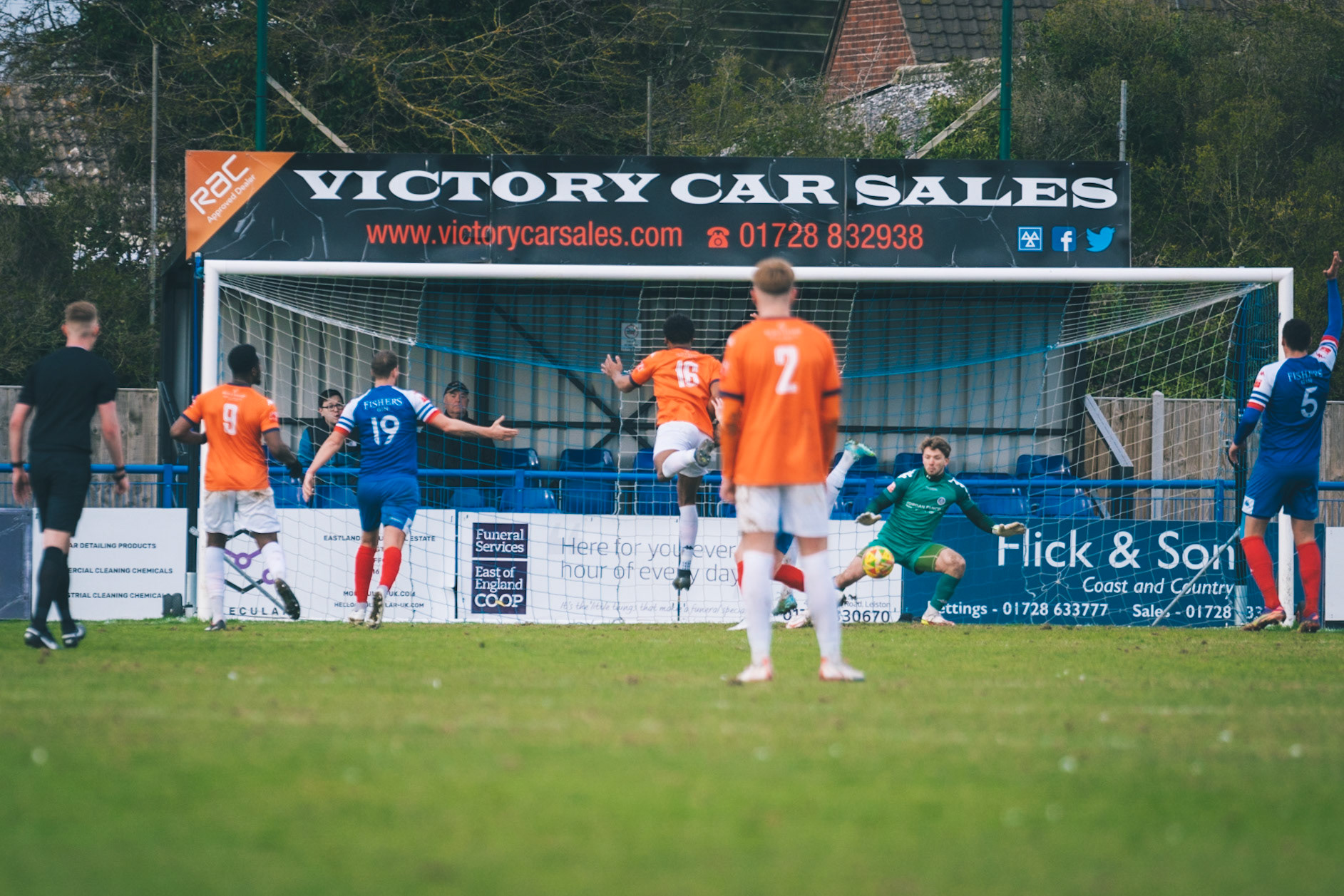 Adam Mills striking the ball with the stratford g.k pulling off a good save to keep it 0-0