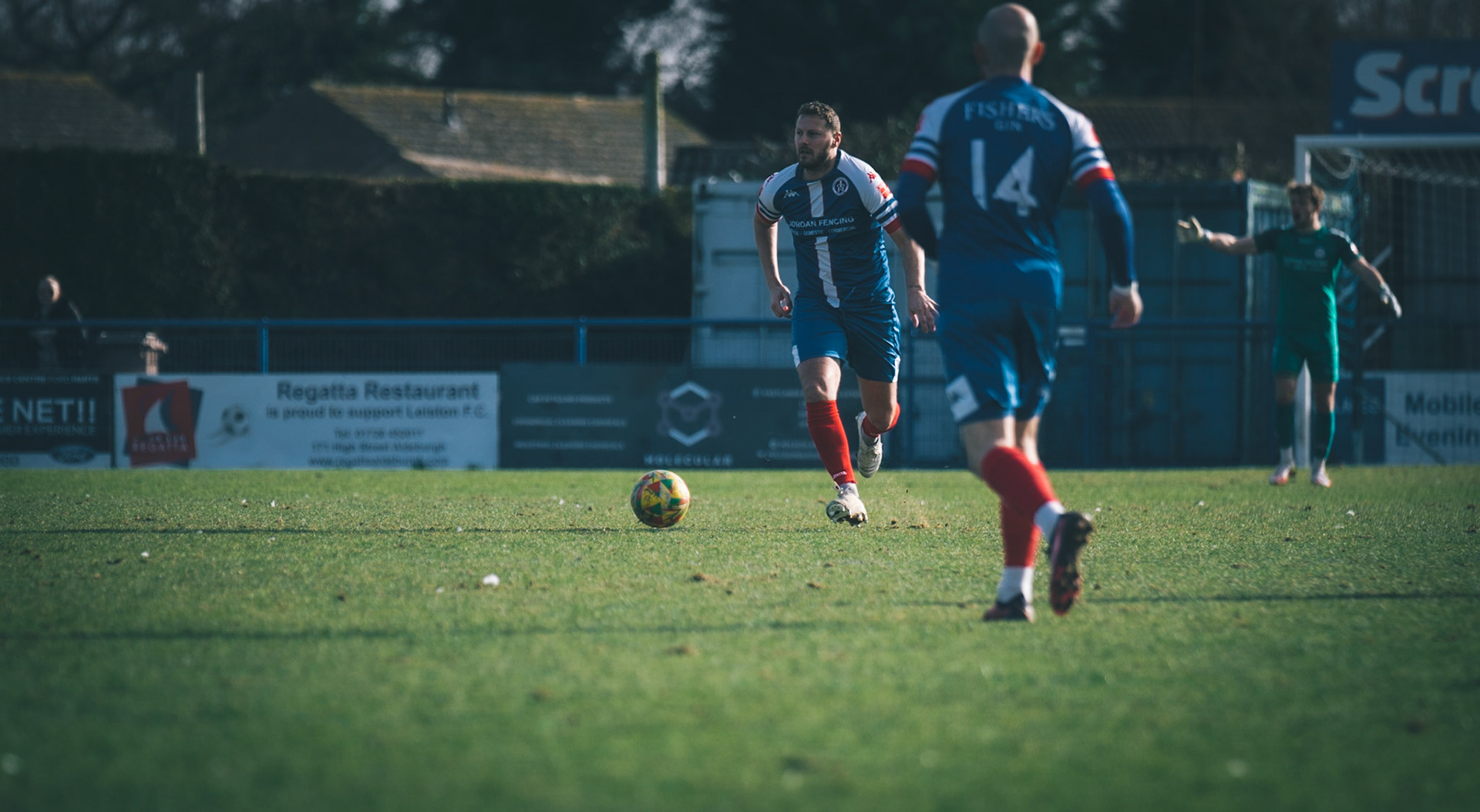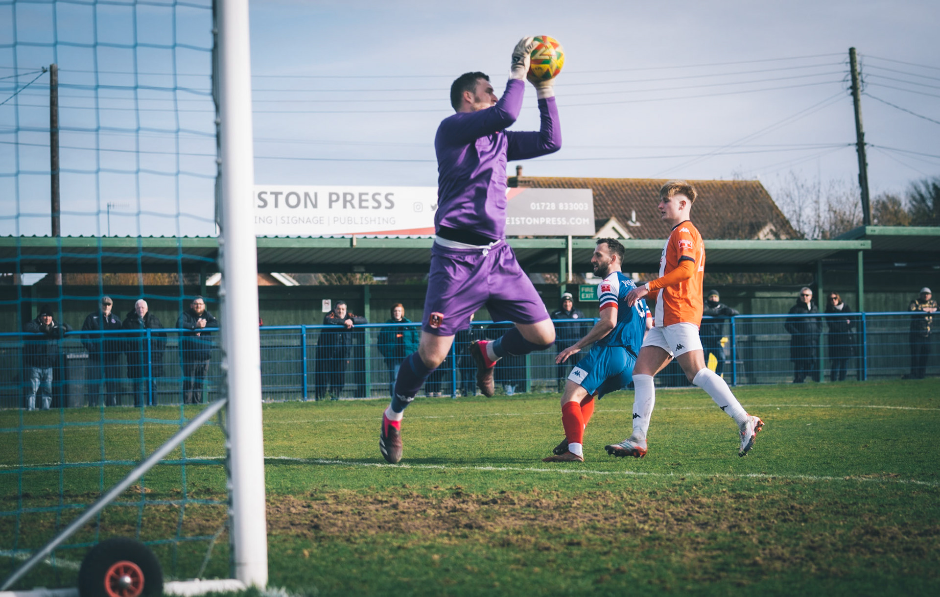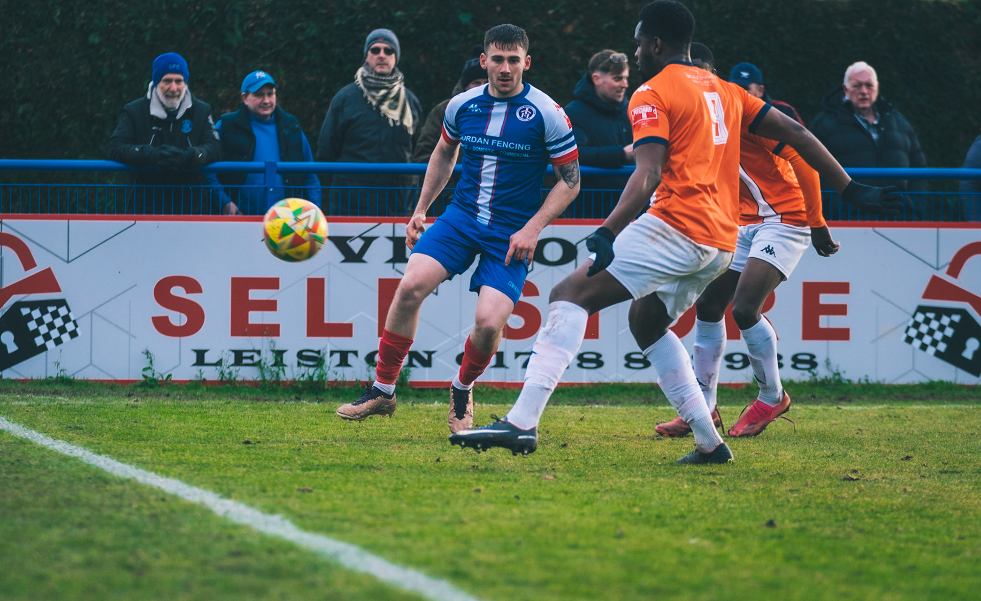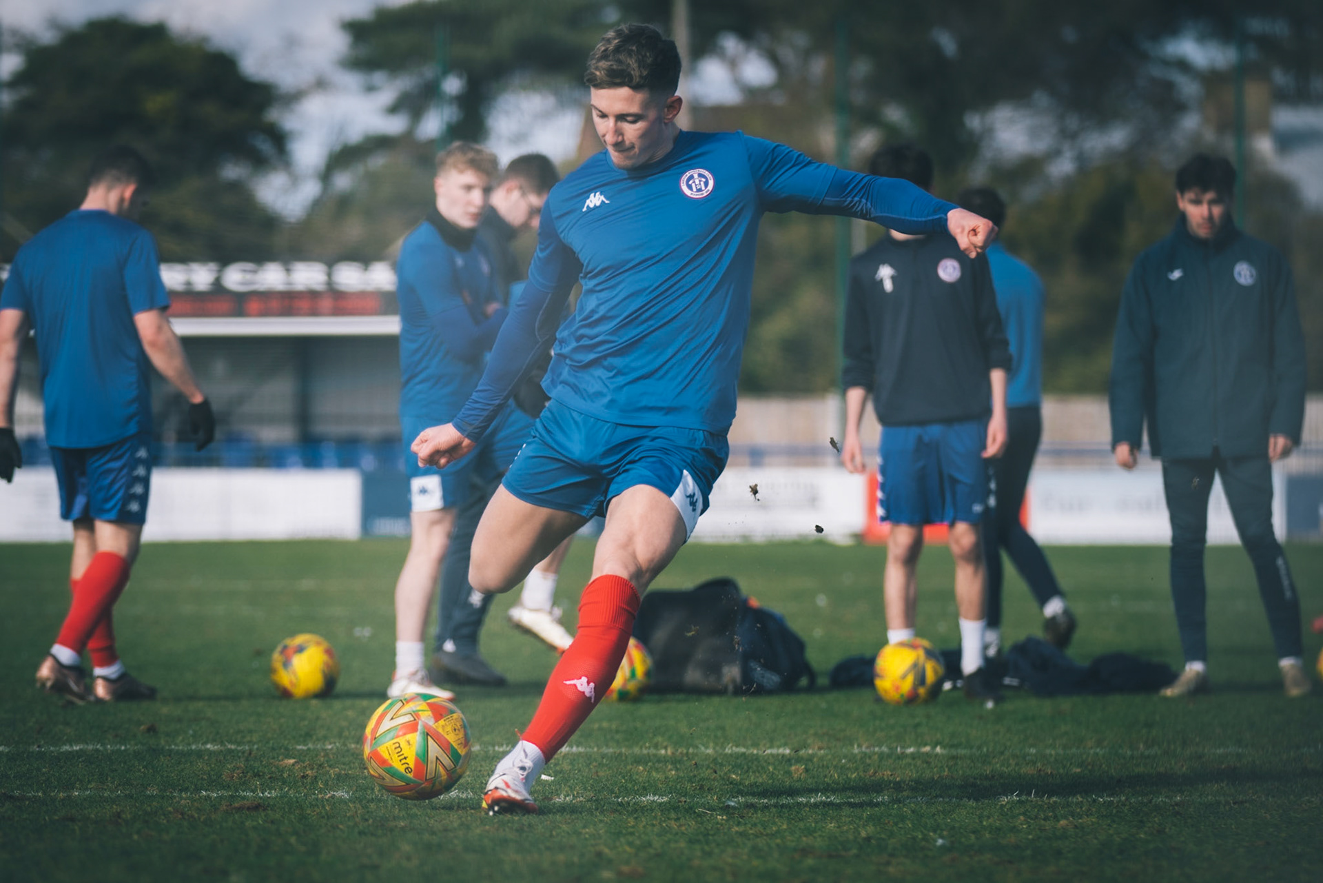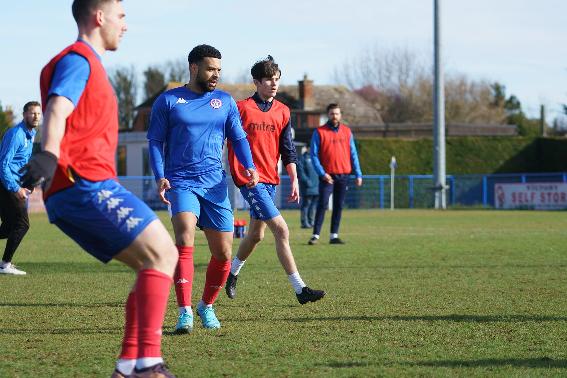 Adam Mills striking the ball with the stratford g.k pulling off a good save to keep it 0-0