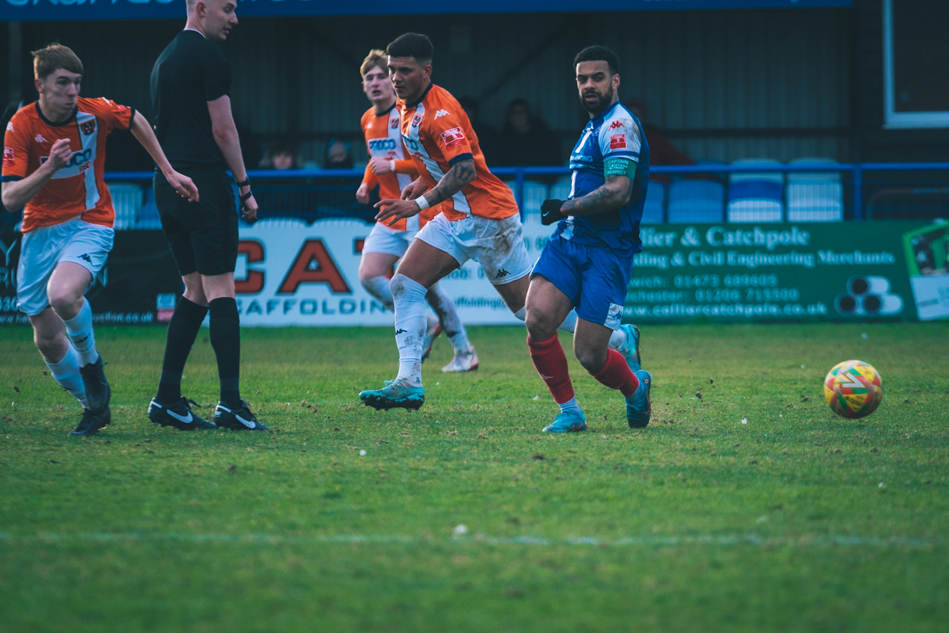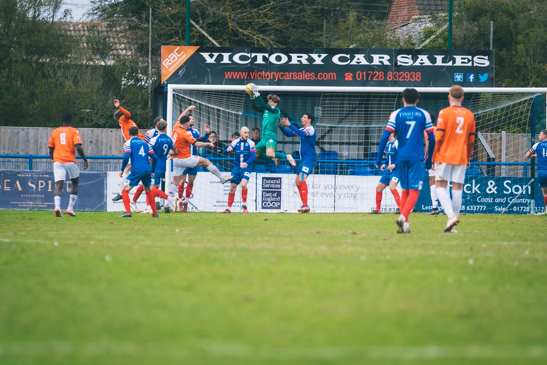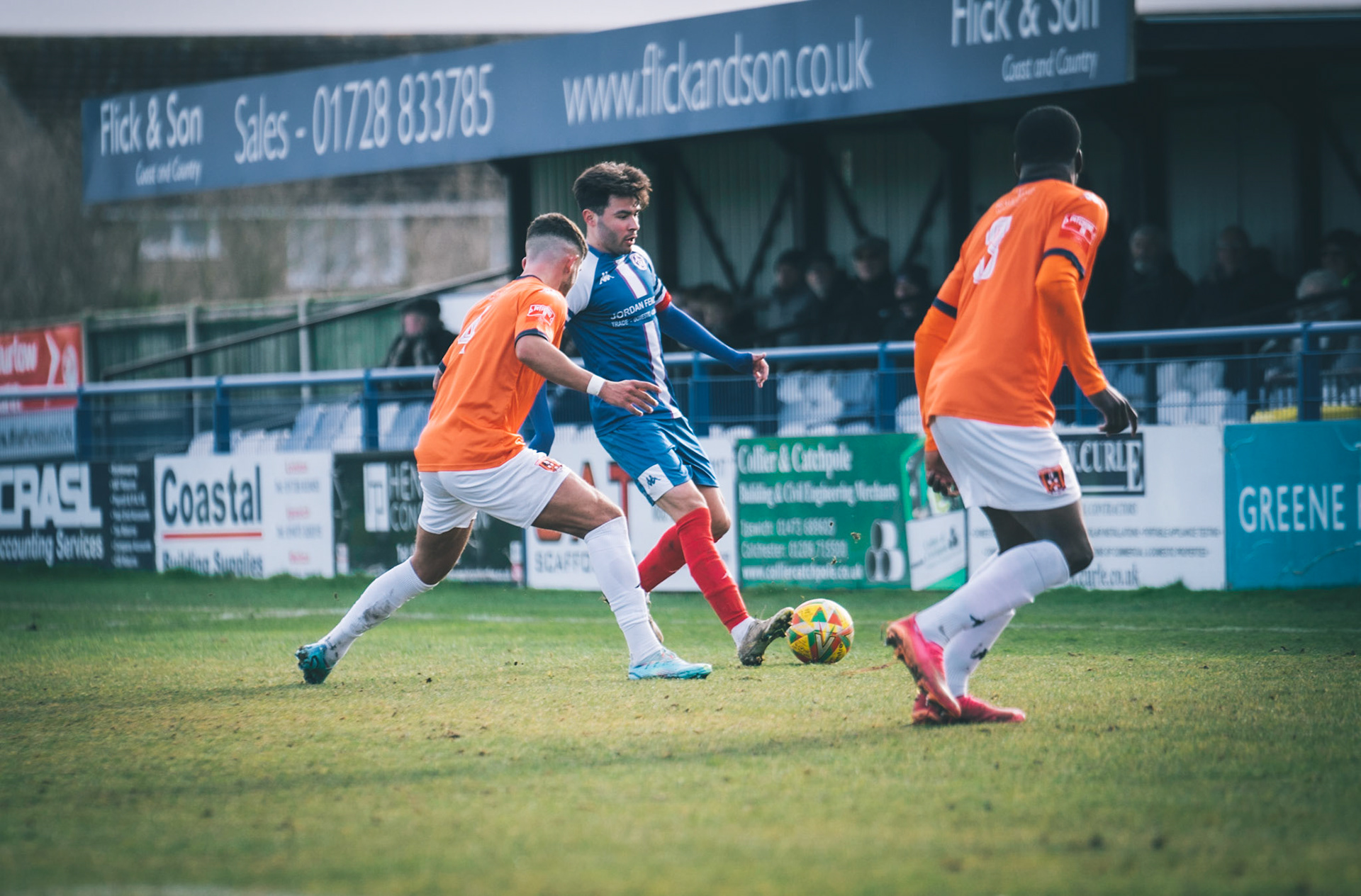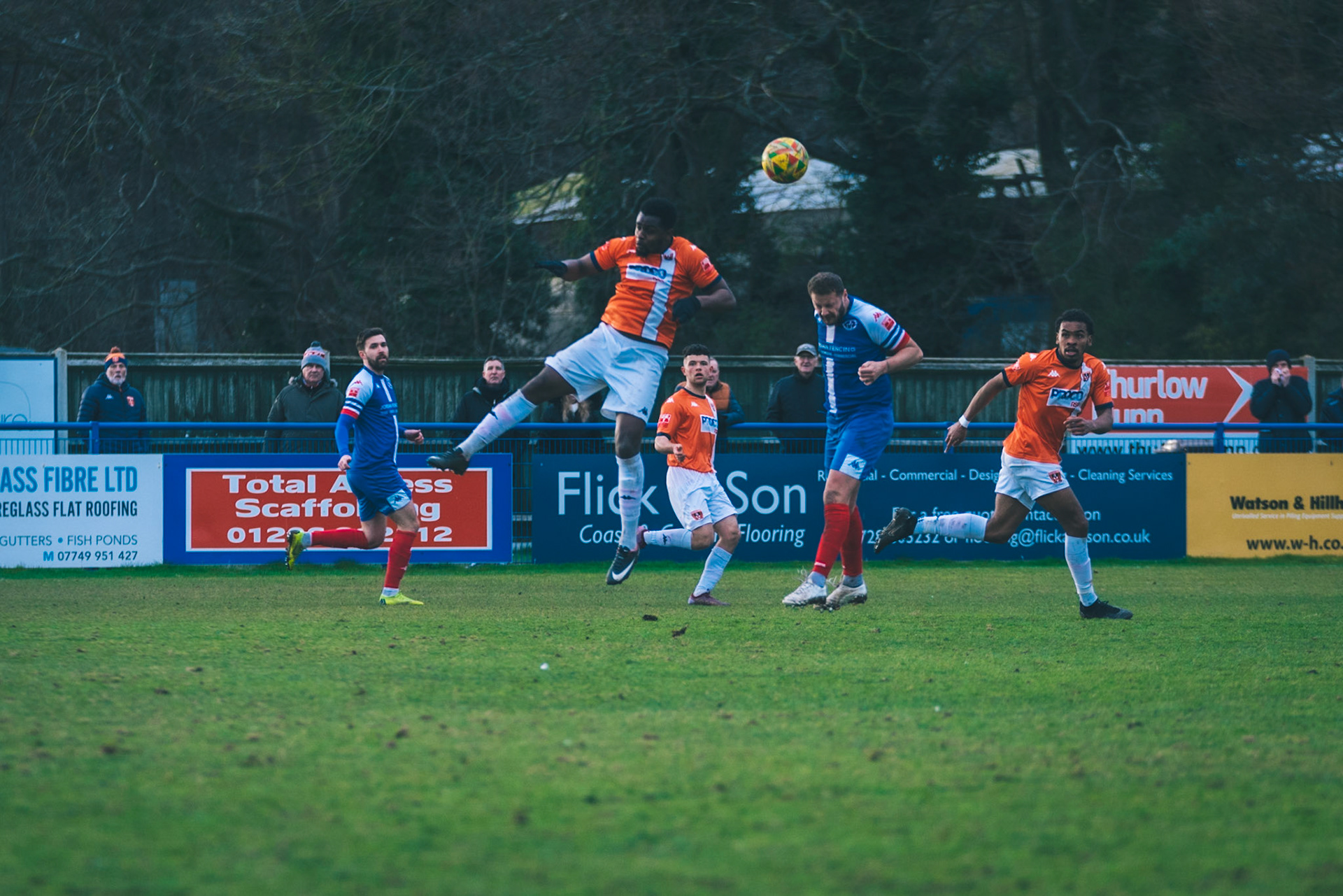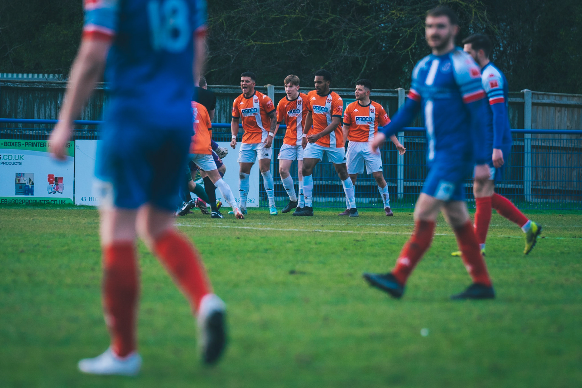 Adam Mills striking the ball with the stratford g.k pulling off a good save to keep it 0-0