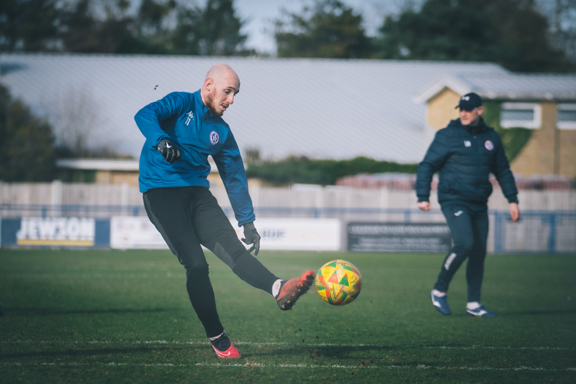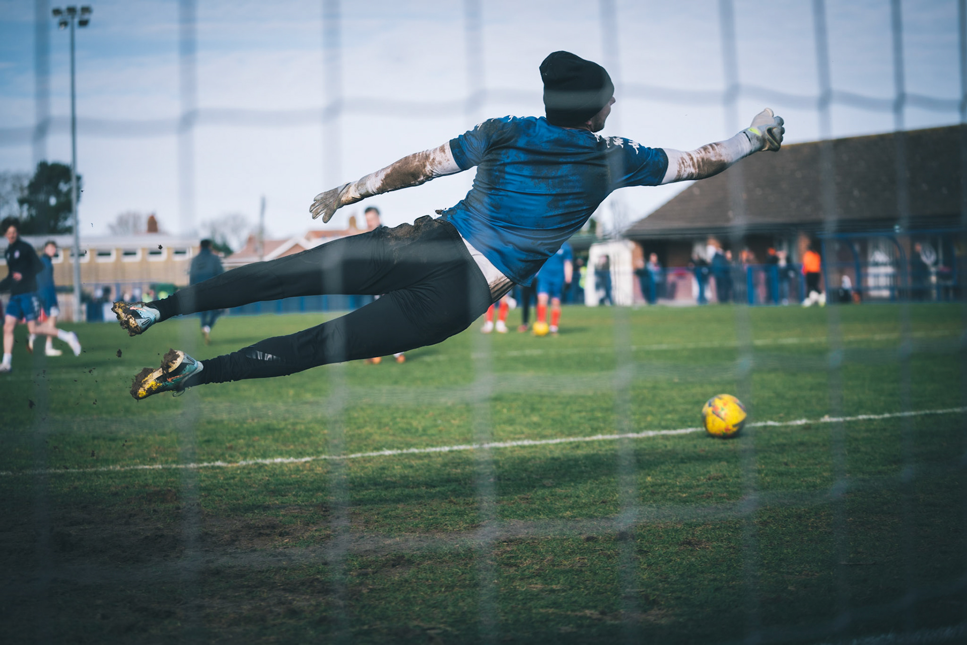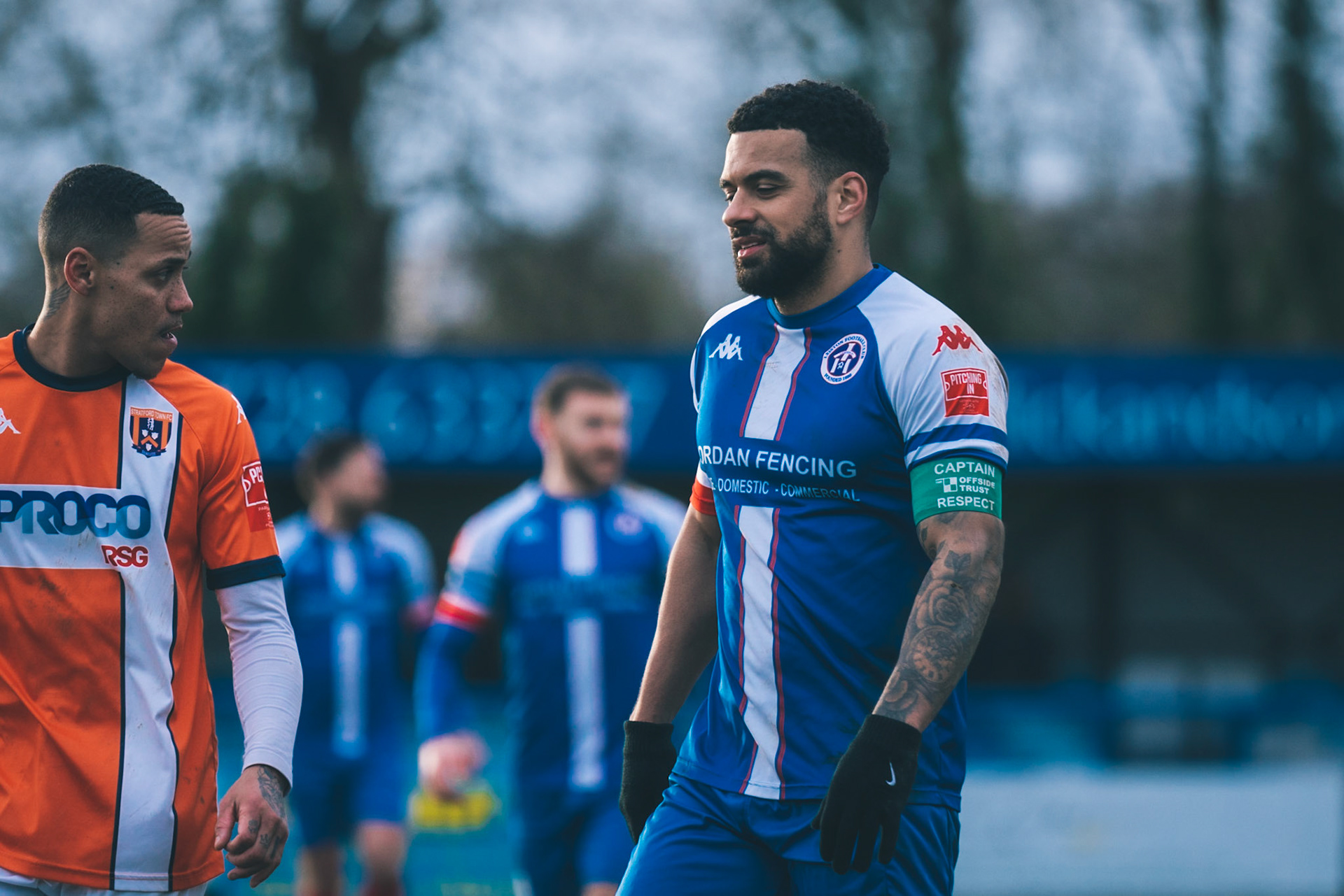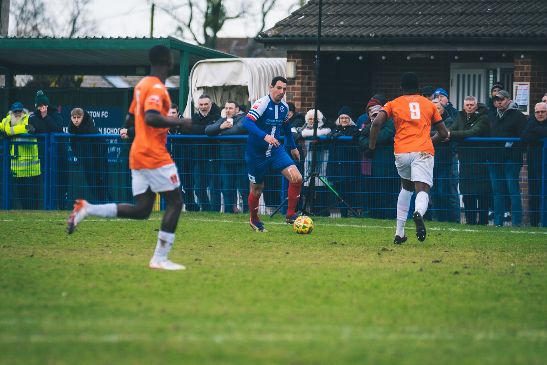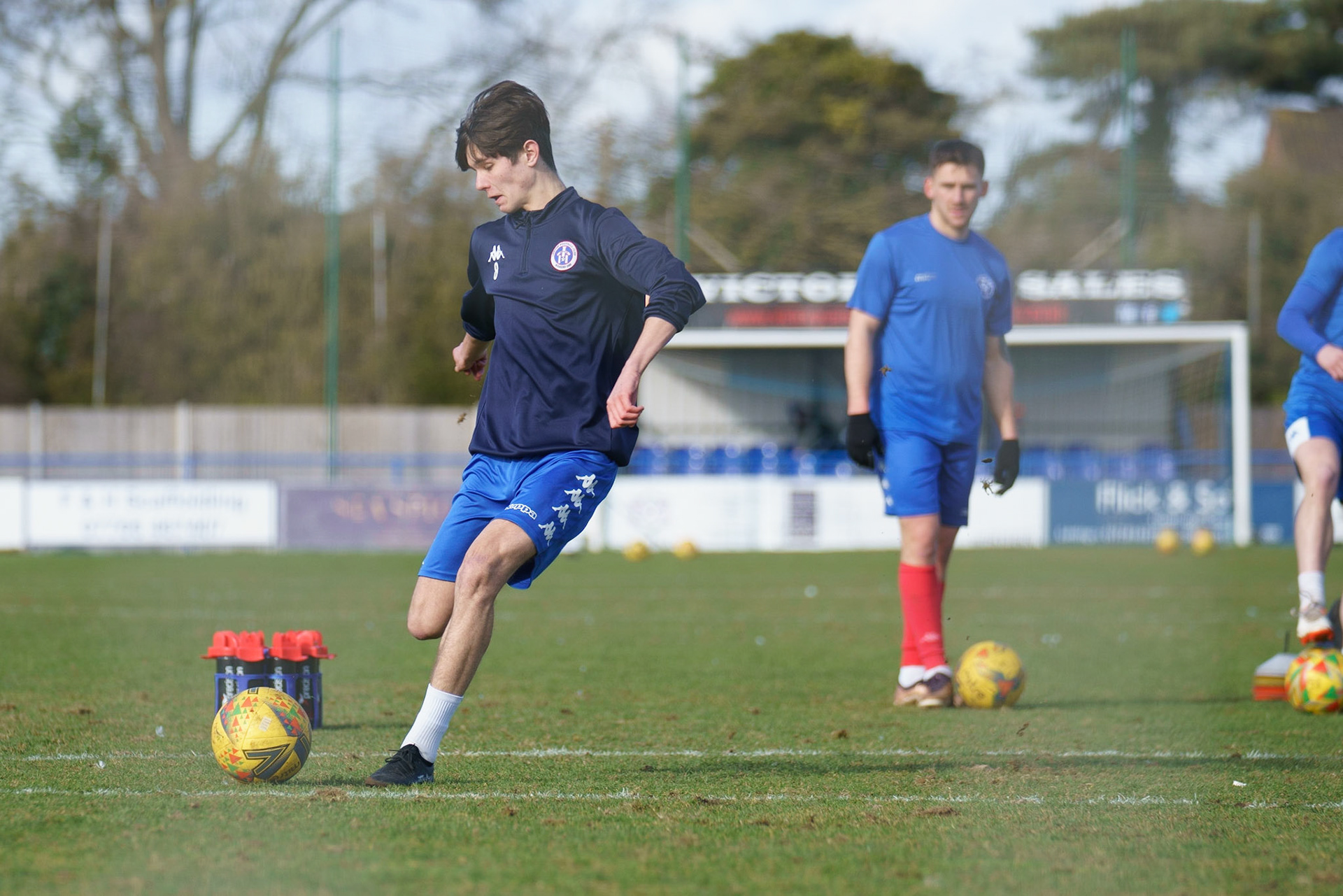 Adam Mills striking the ball with the stratford g.k pulling off a good save to keep it 0-0