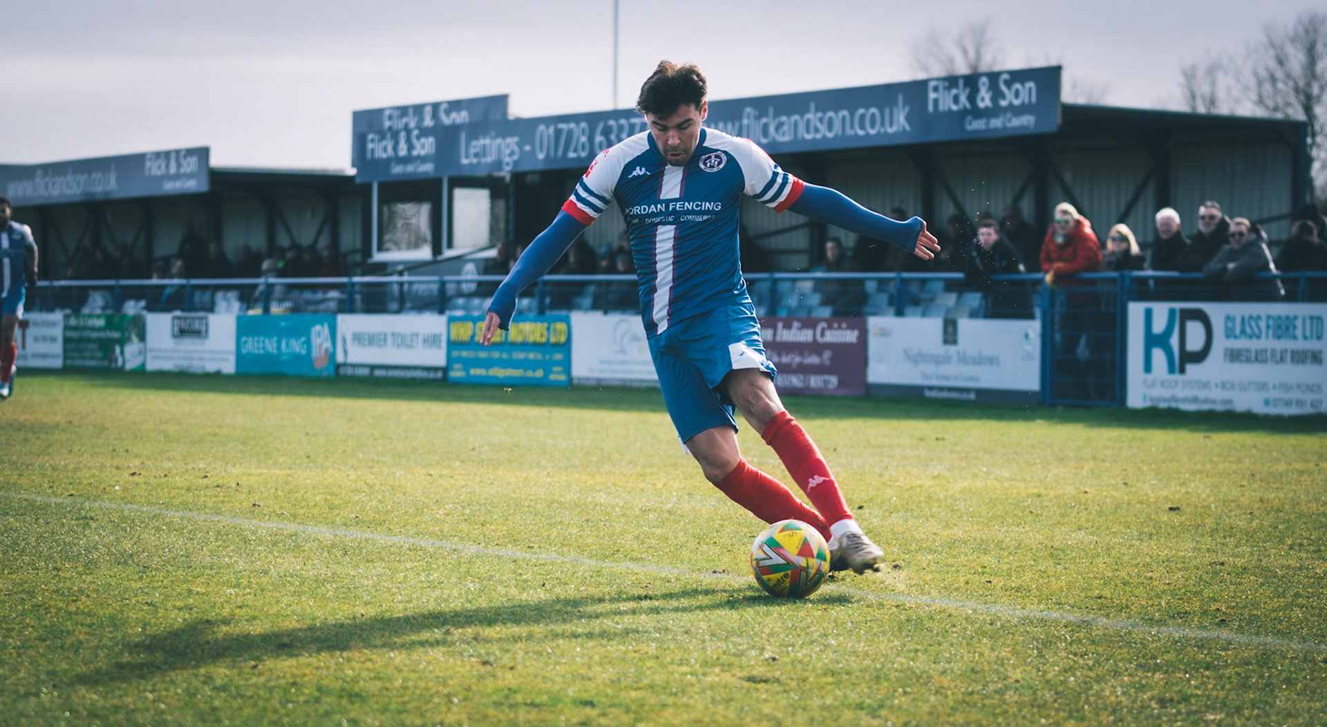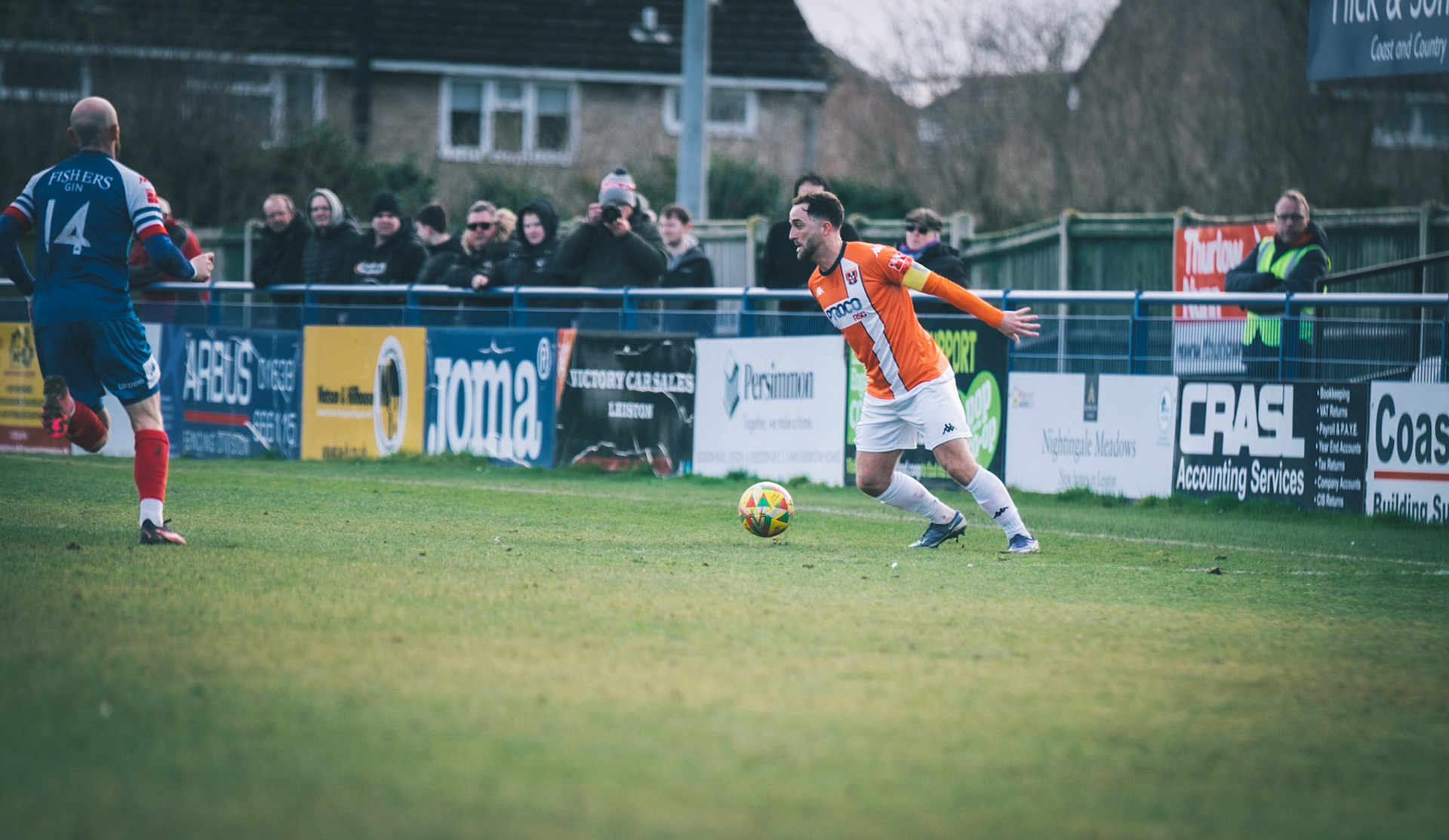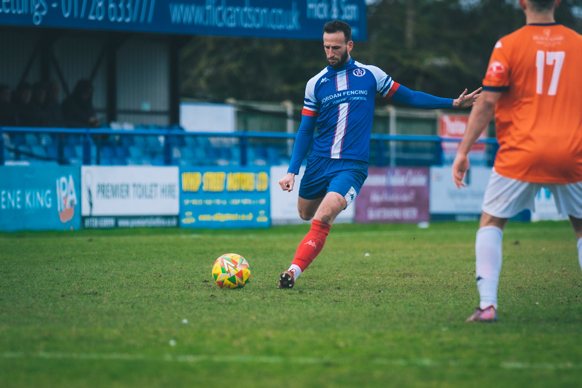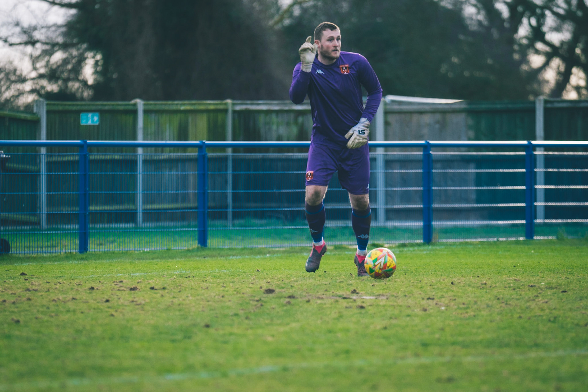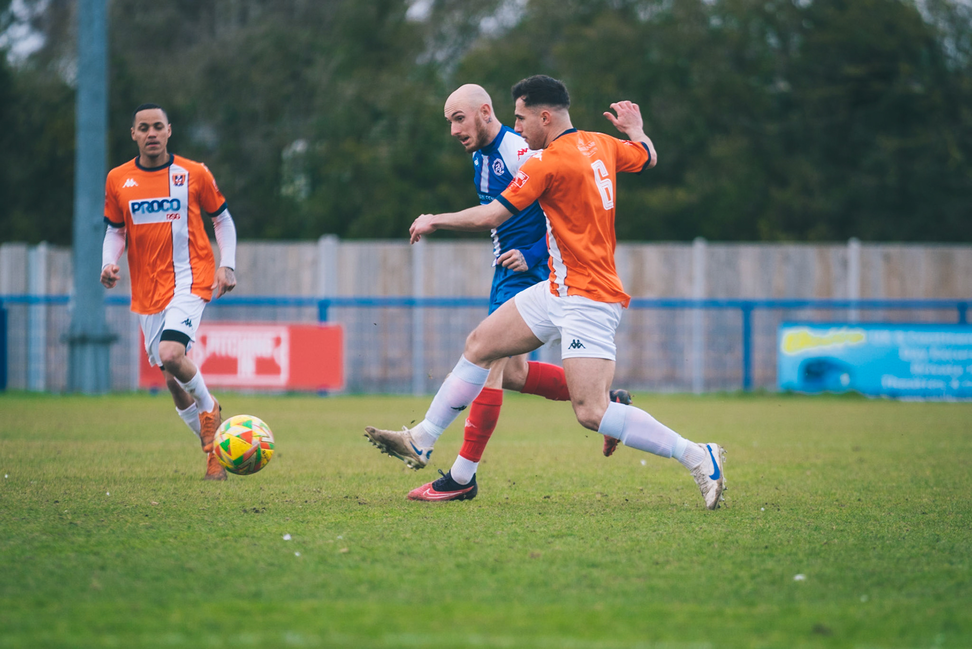 Adam Mills striking the ball with the stratford g.k pulling off a good save to keep it 0-0