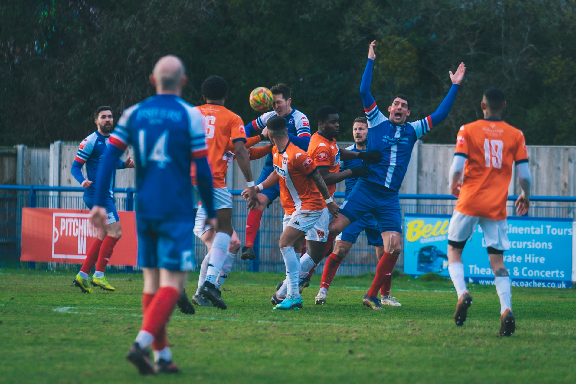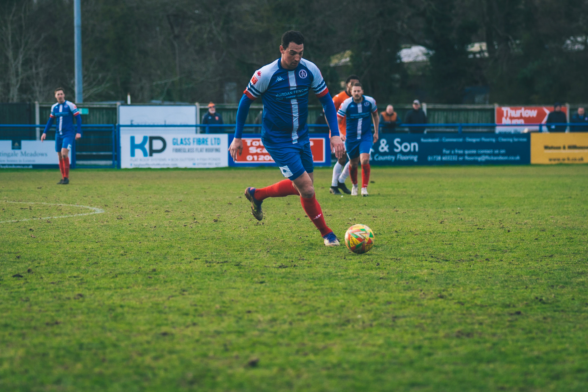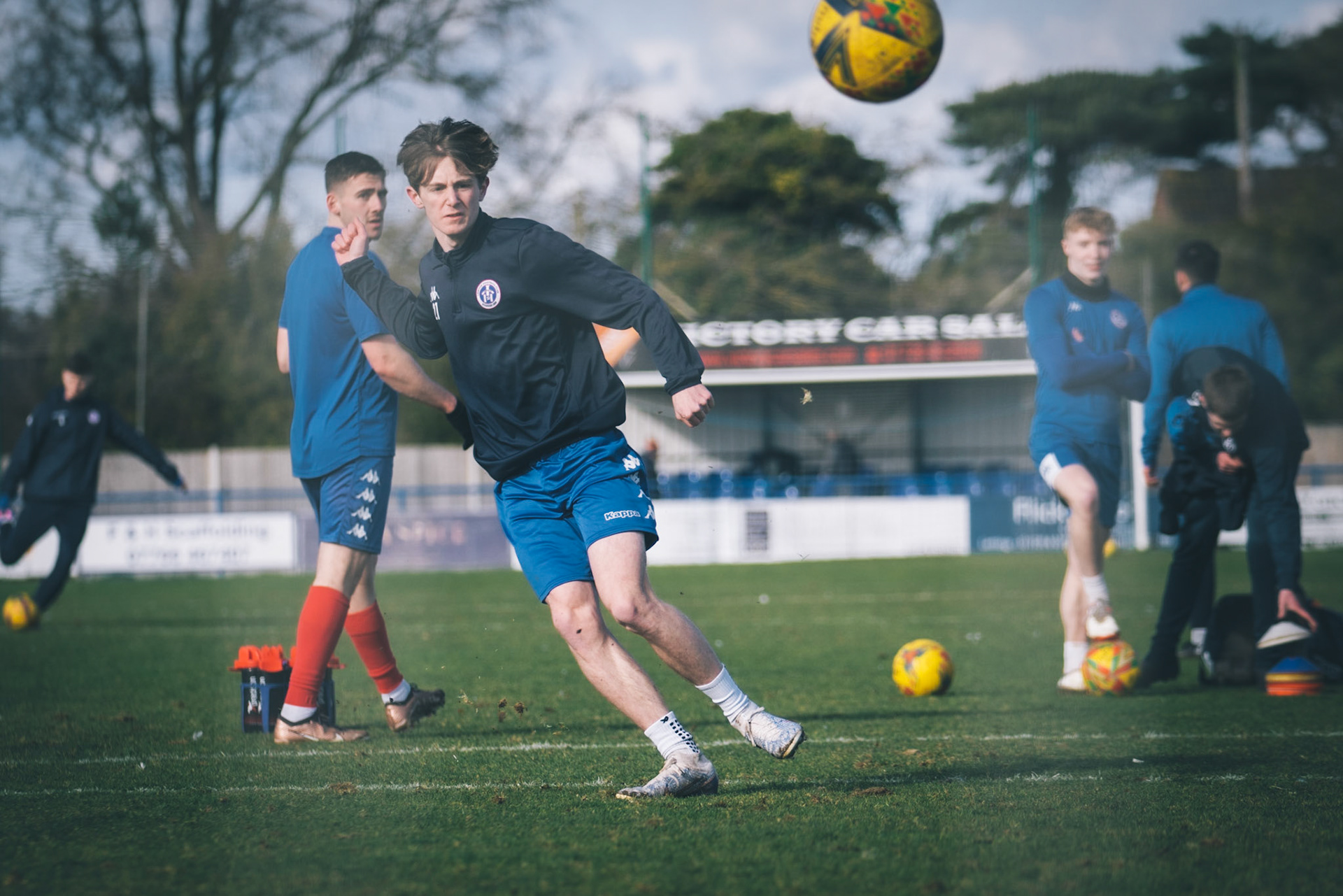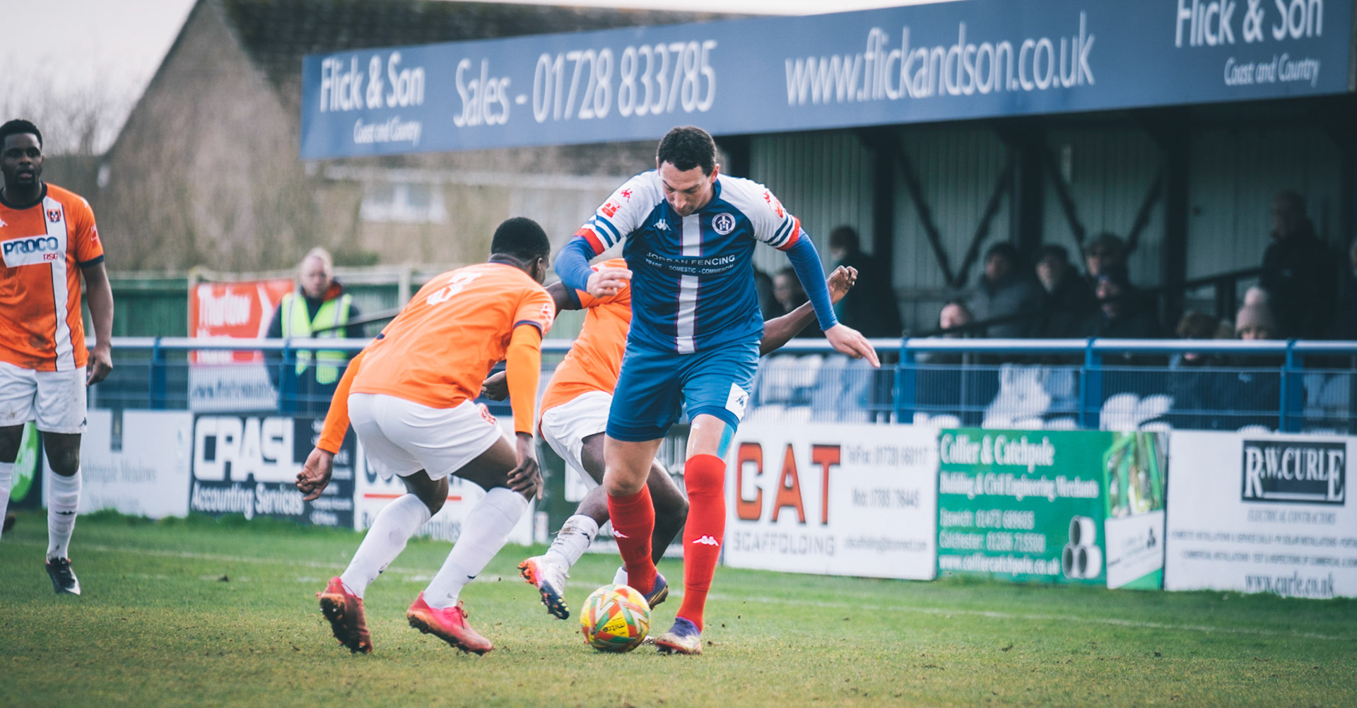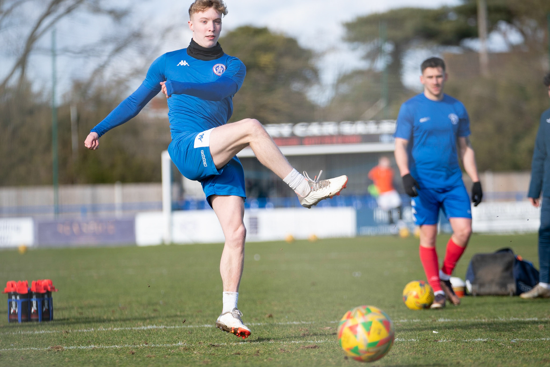 Adam Mills striking the ball with the stratford g.k pulling off a good save to keep it 0-0