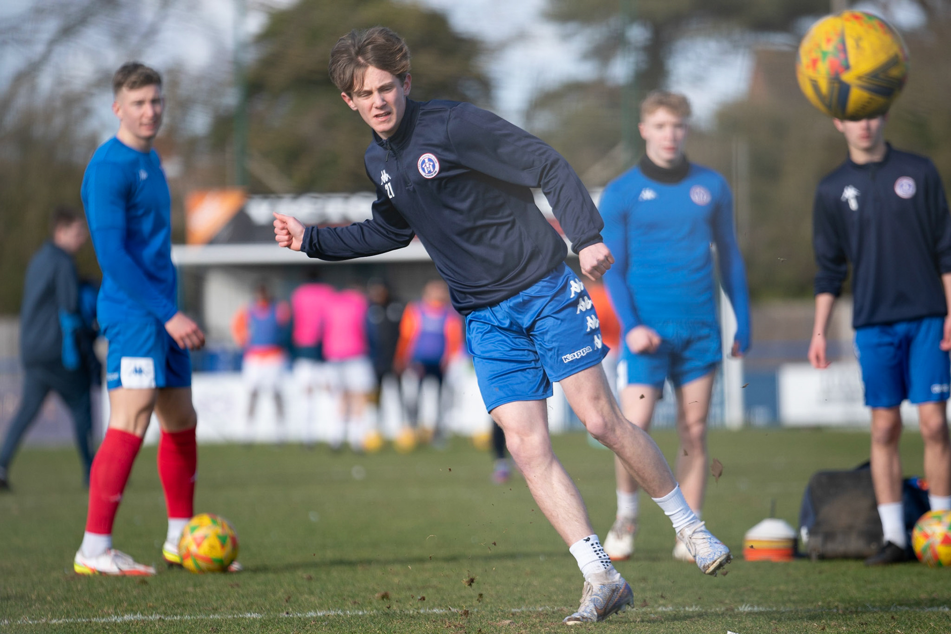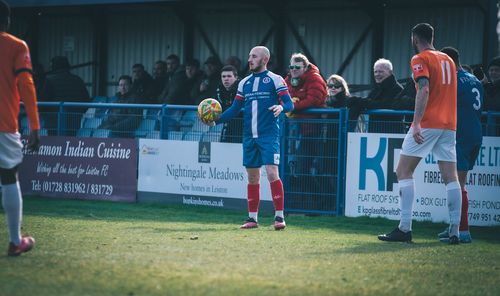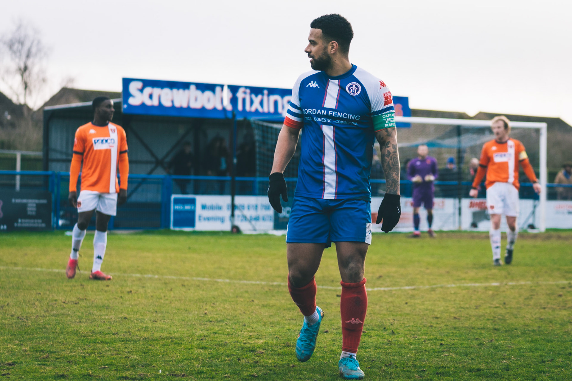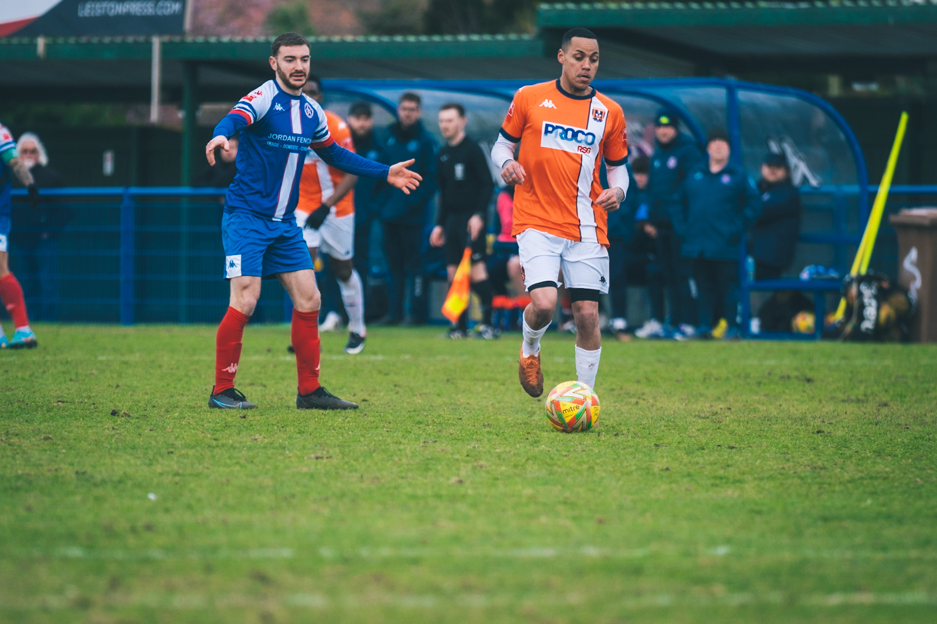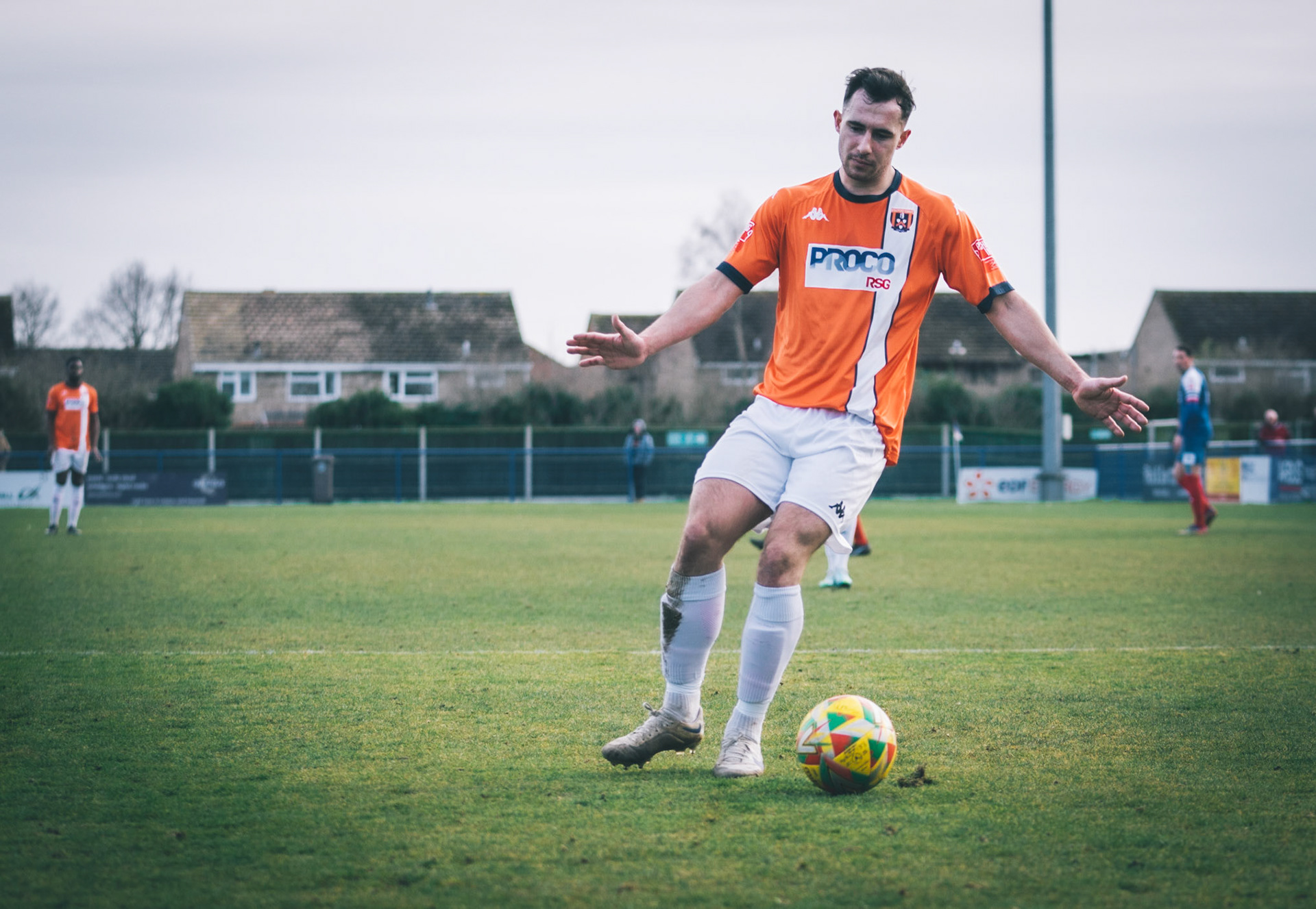 Adam Mills striking the ball with the stratford g.k pulling off a good save to keep it 0-0