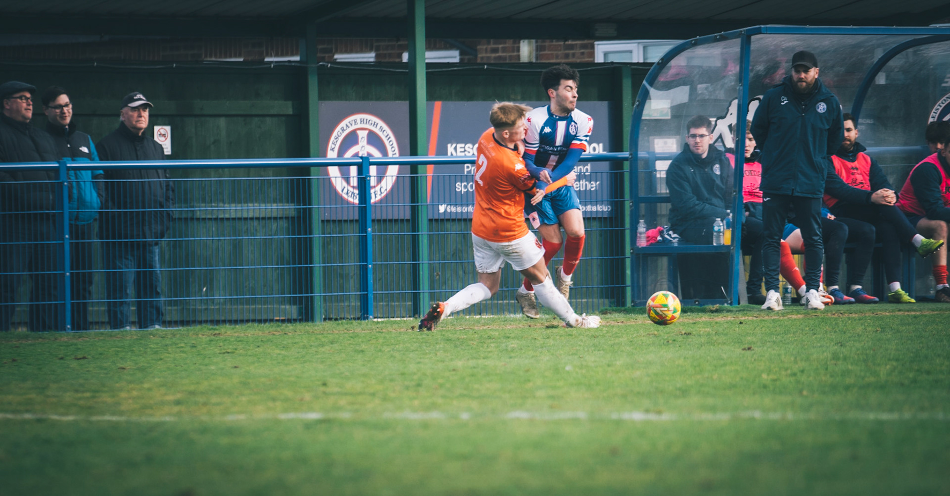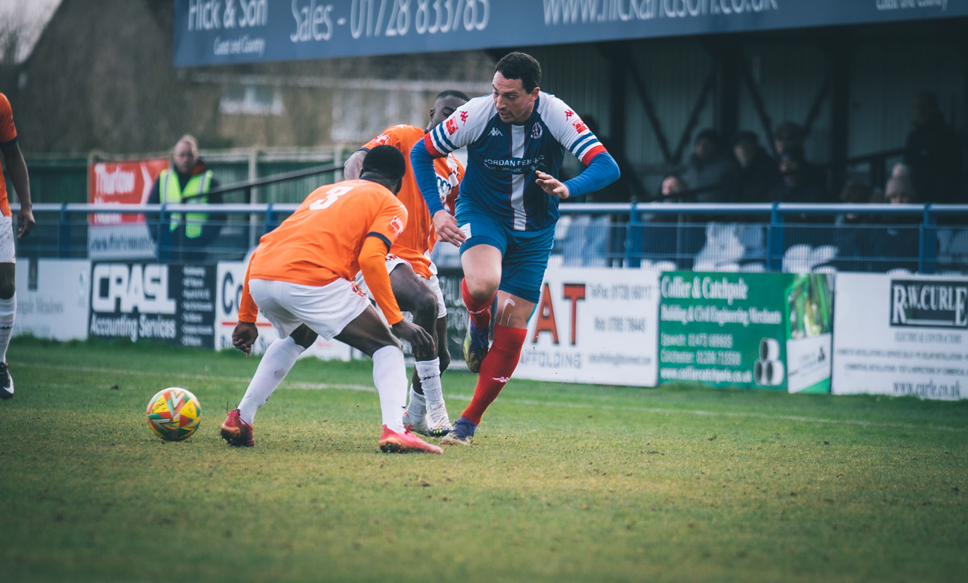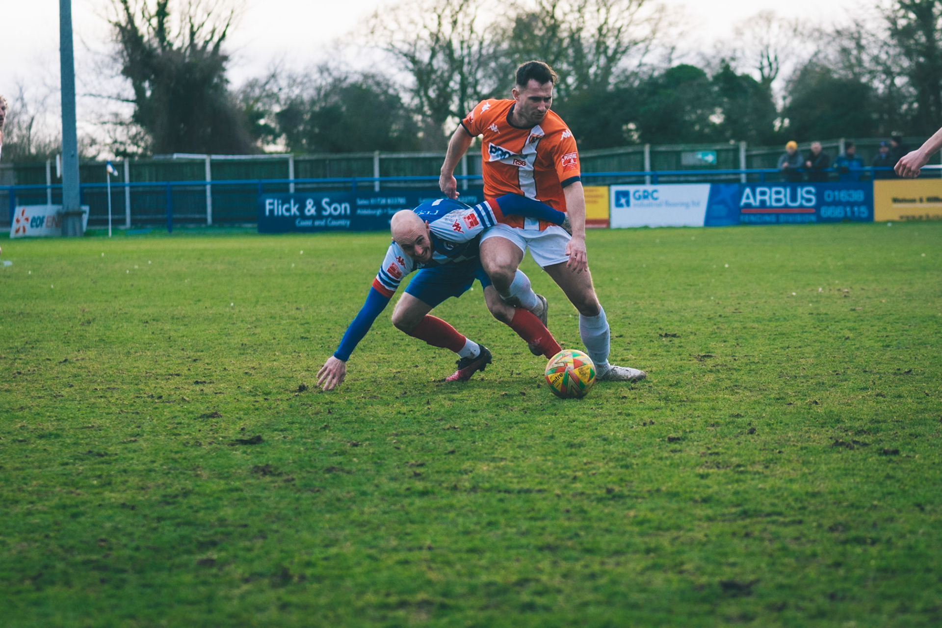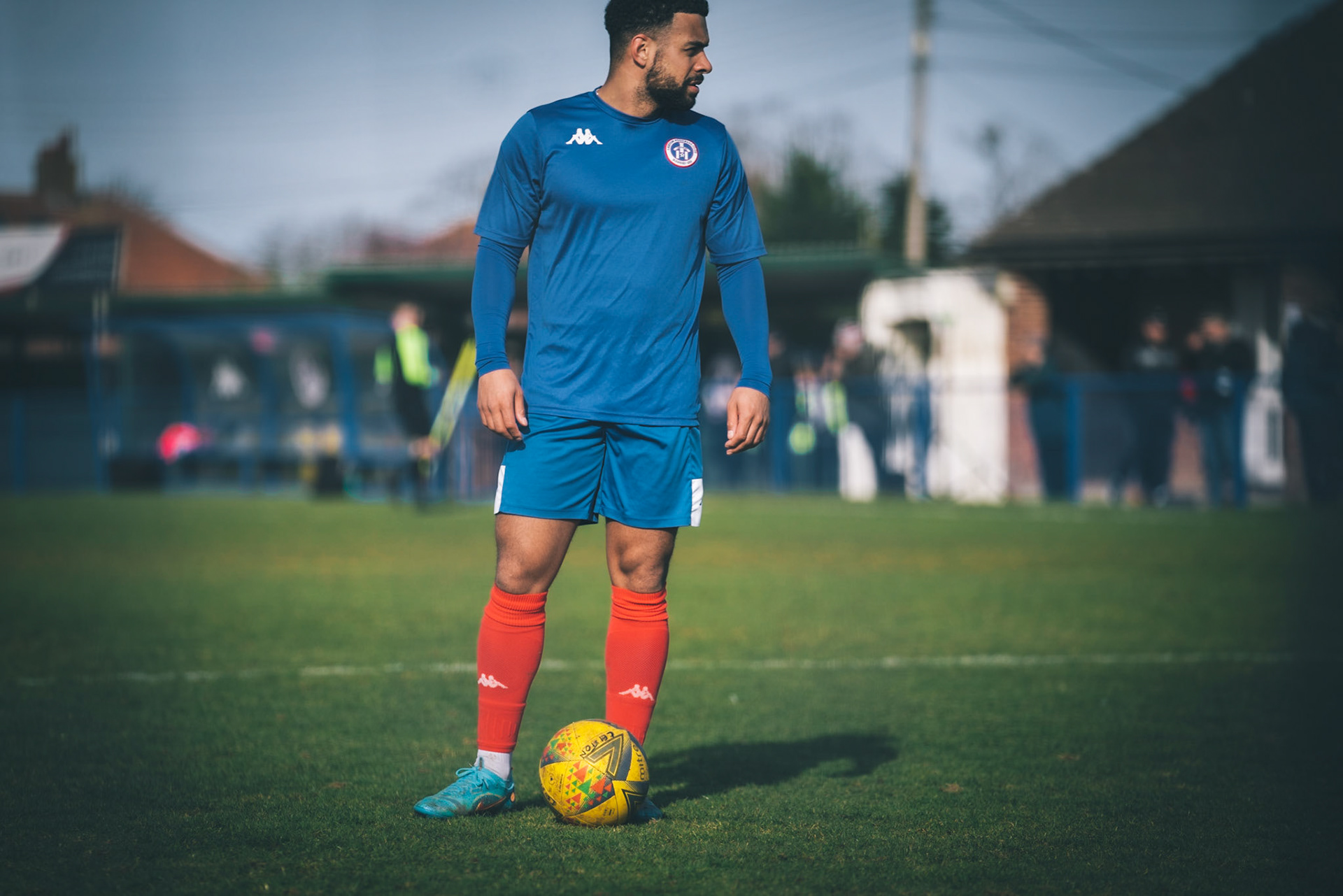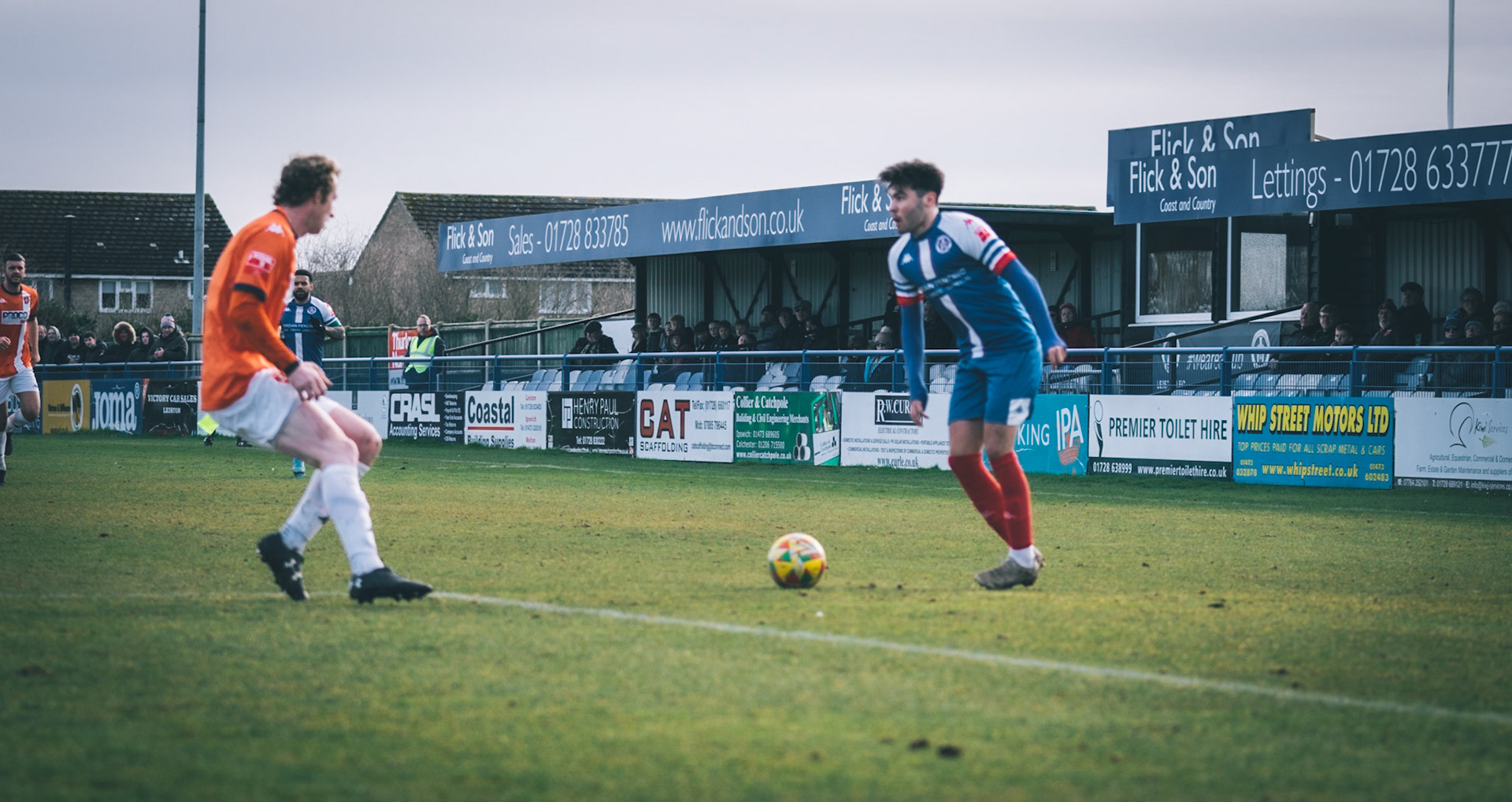 Adam Mills striking the ball with the stratford g.k pulling off a good save to keep it 0-0