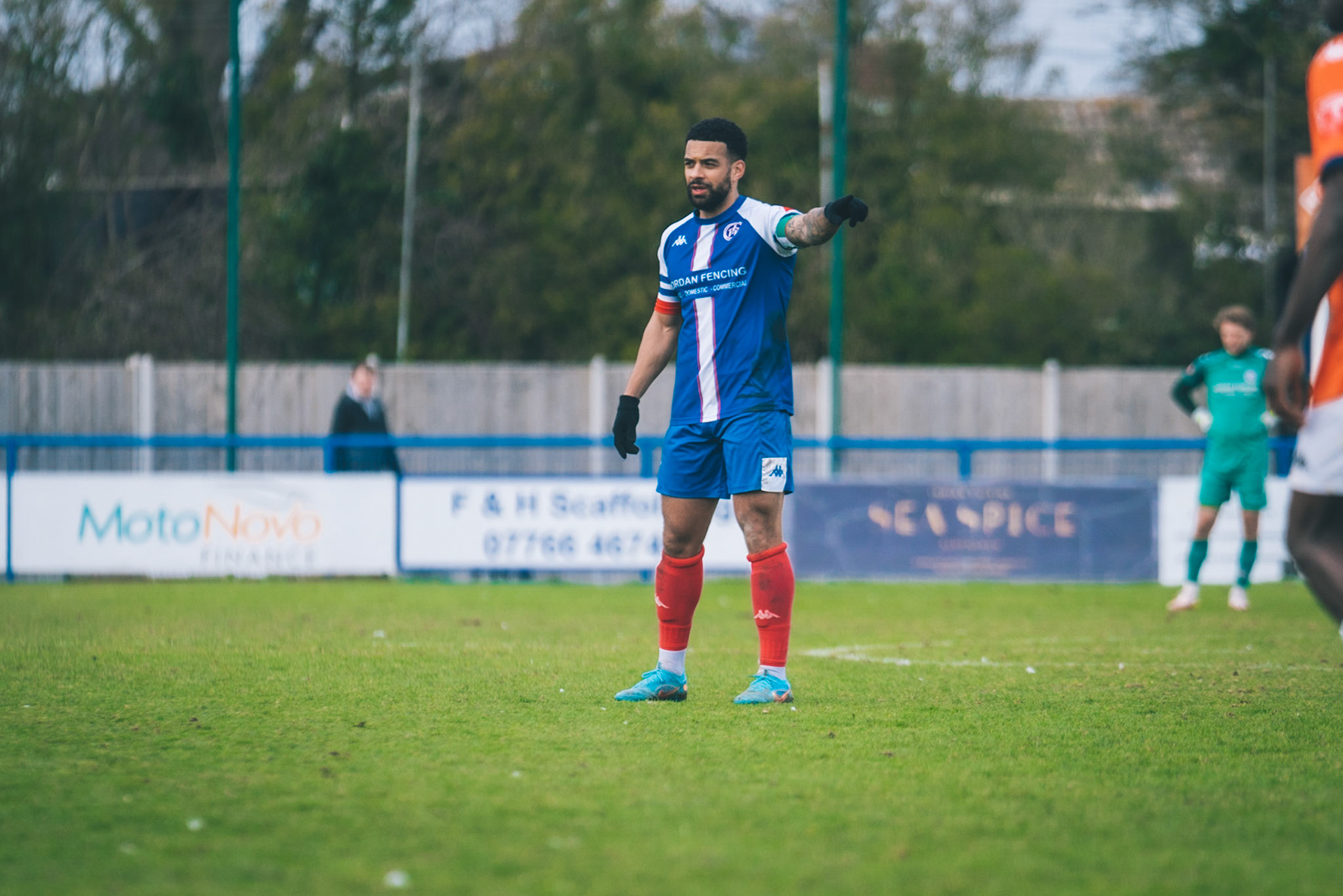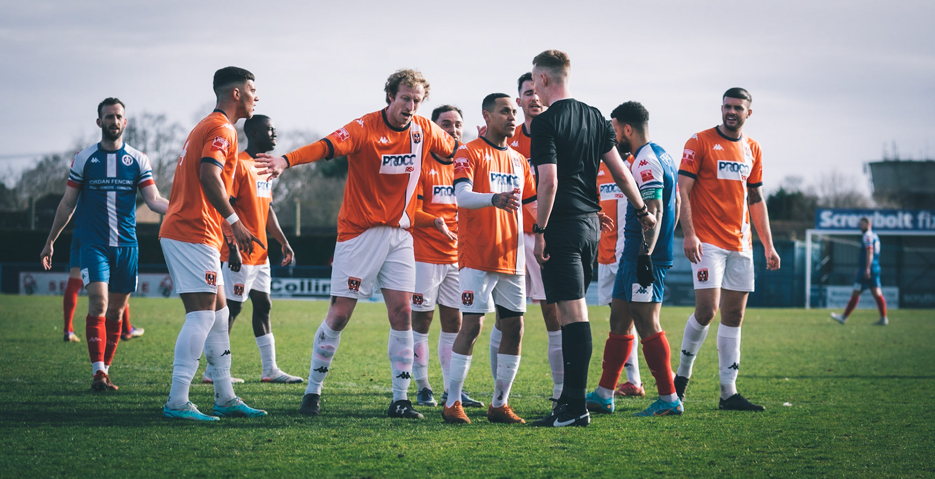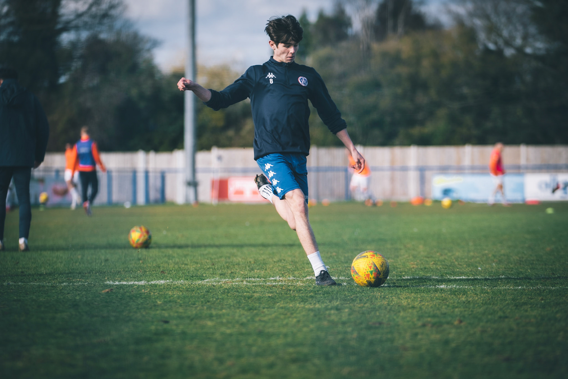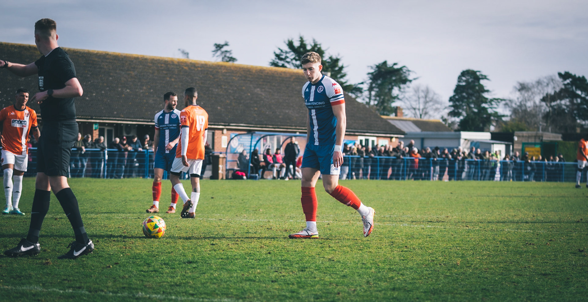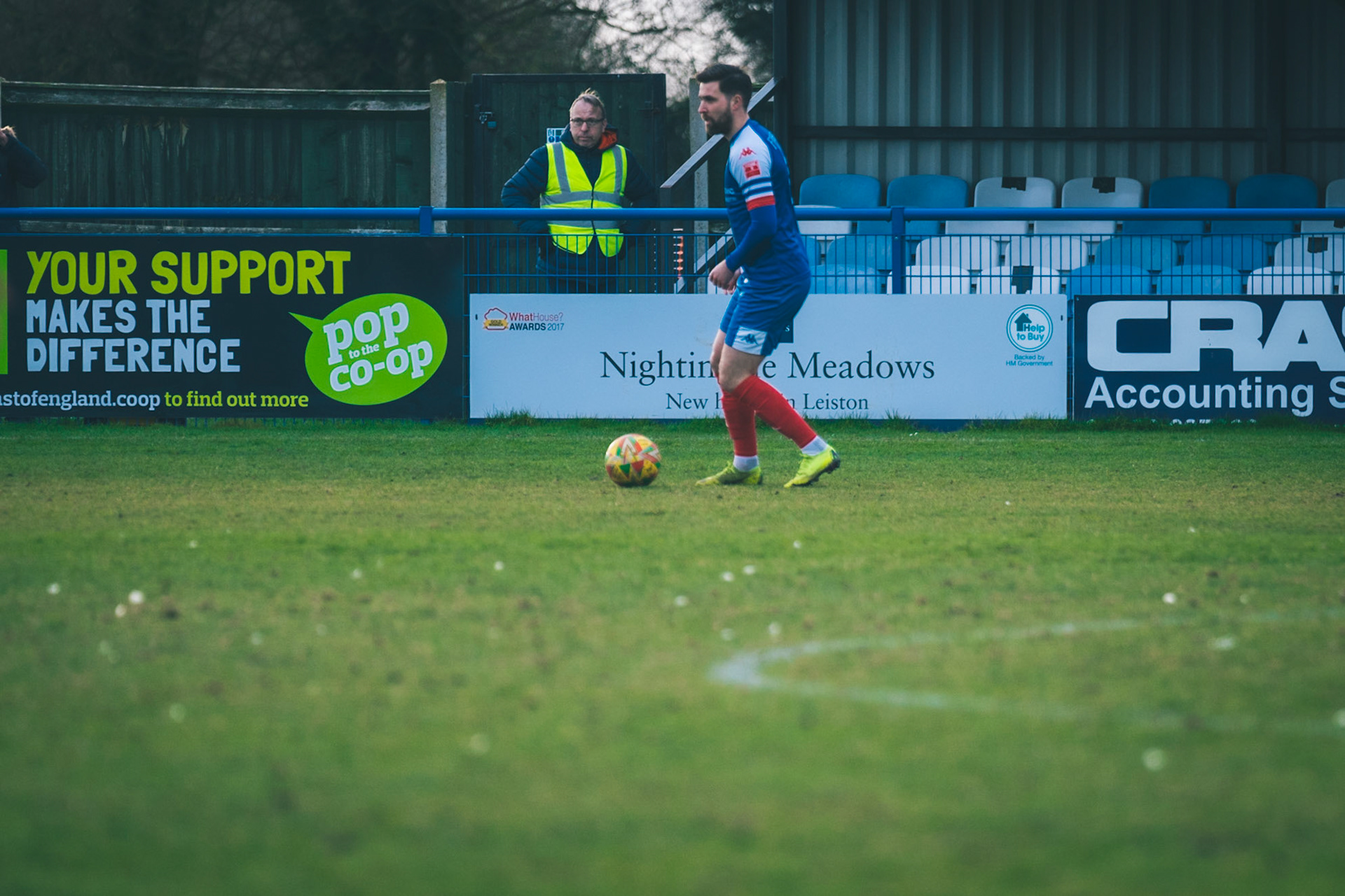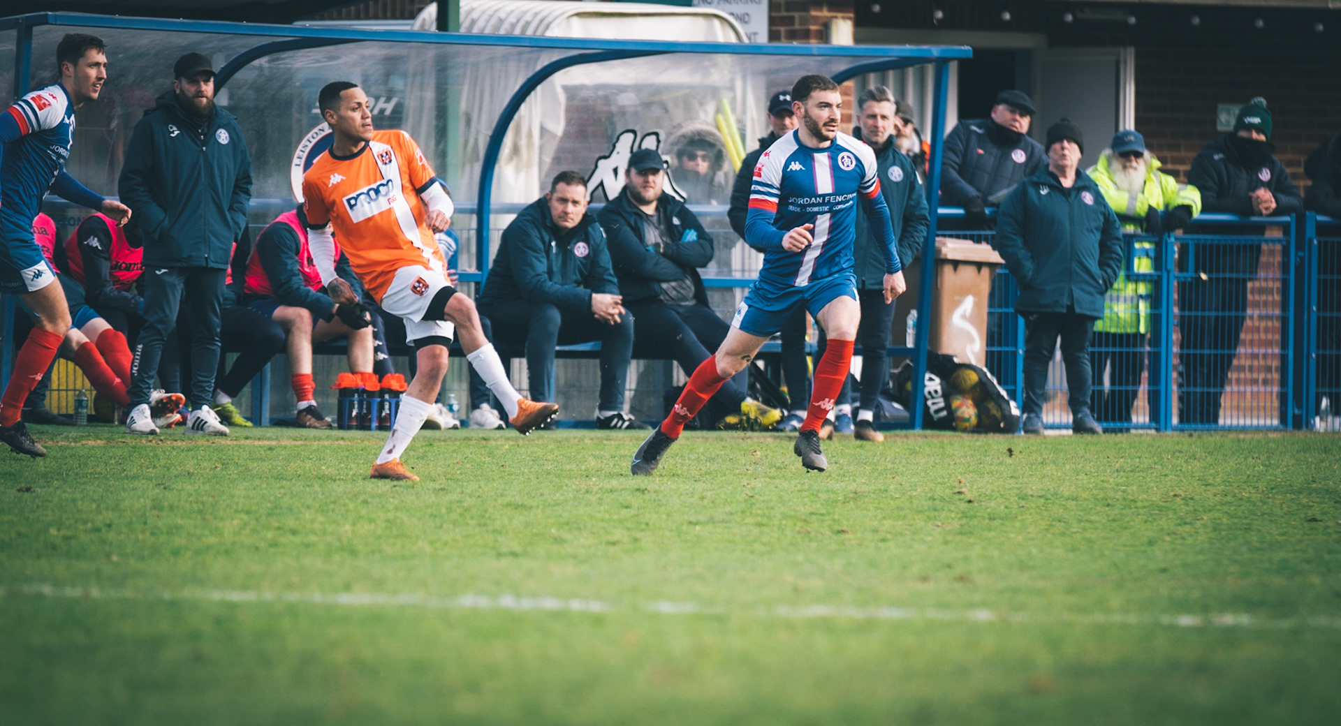 Adam Mills striking the ball with the stratford g.k pulling off a good save to keep it 0-0