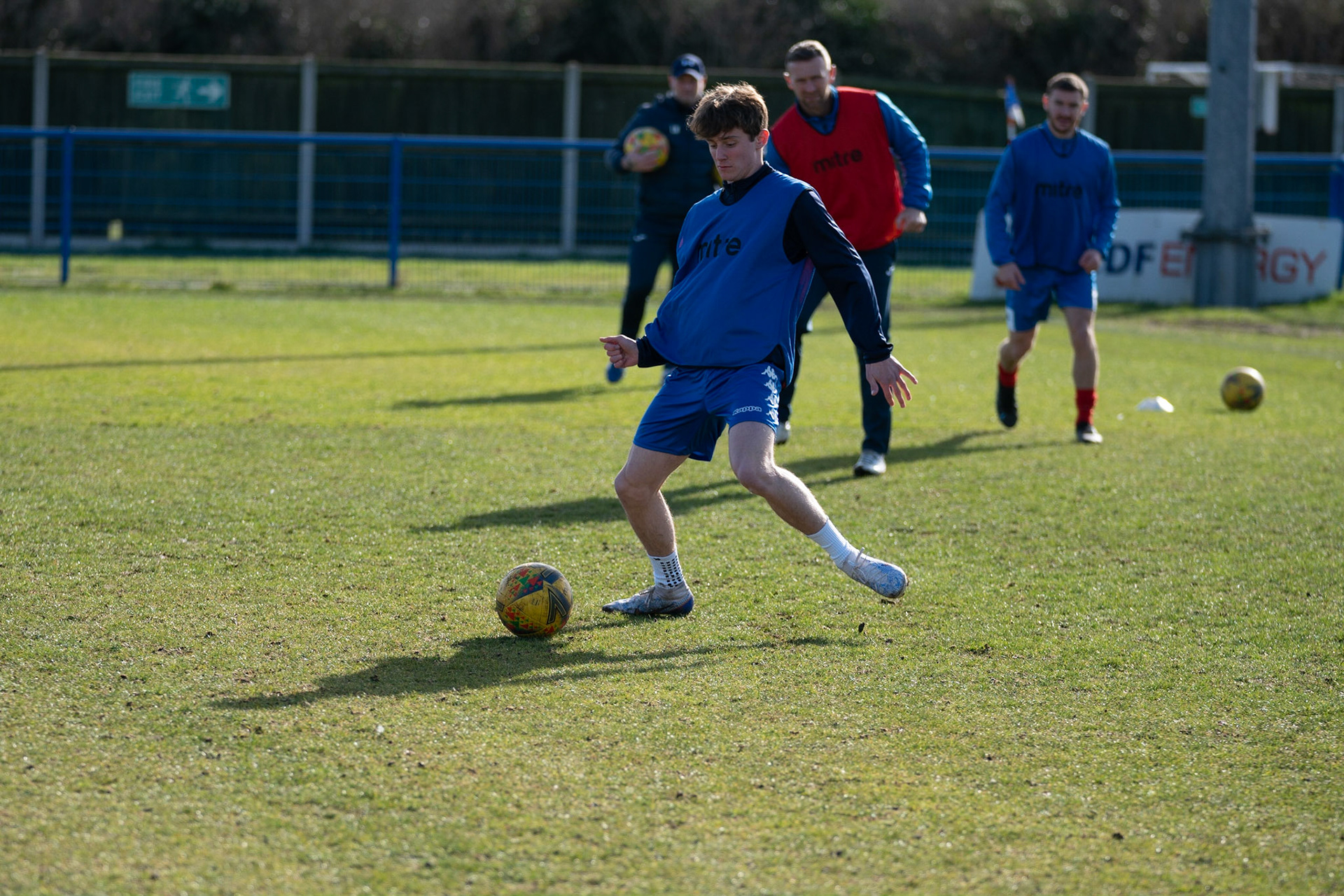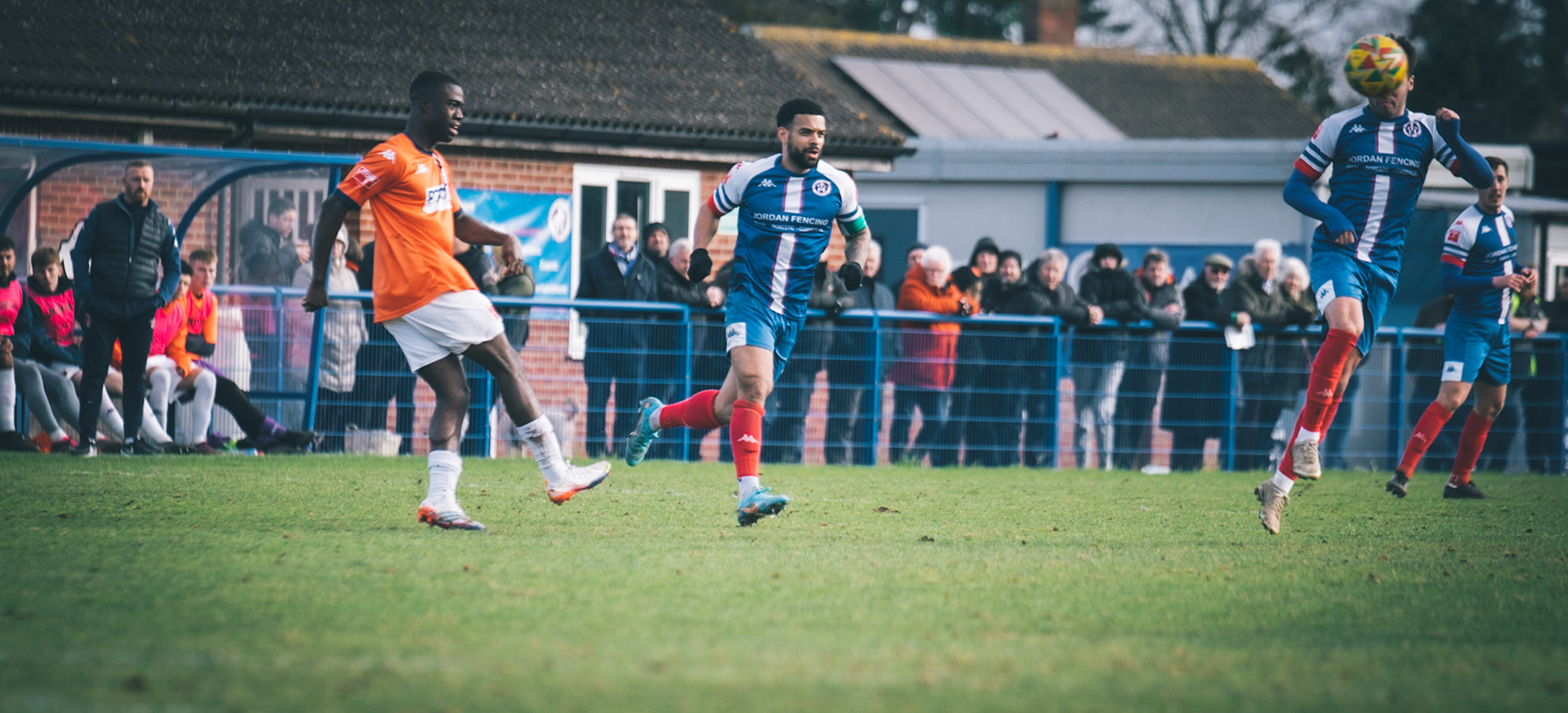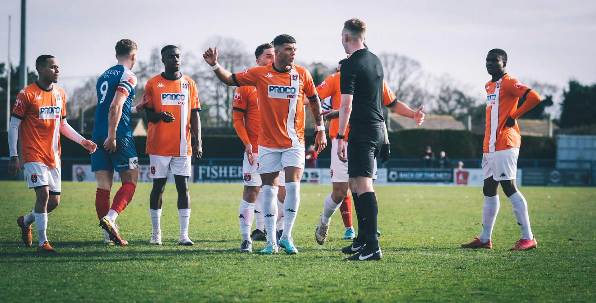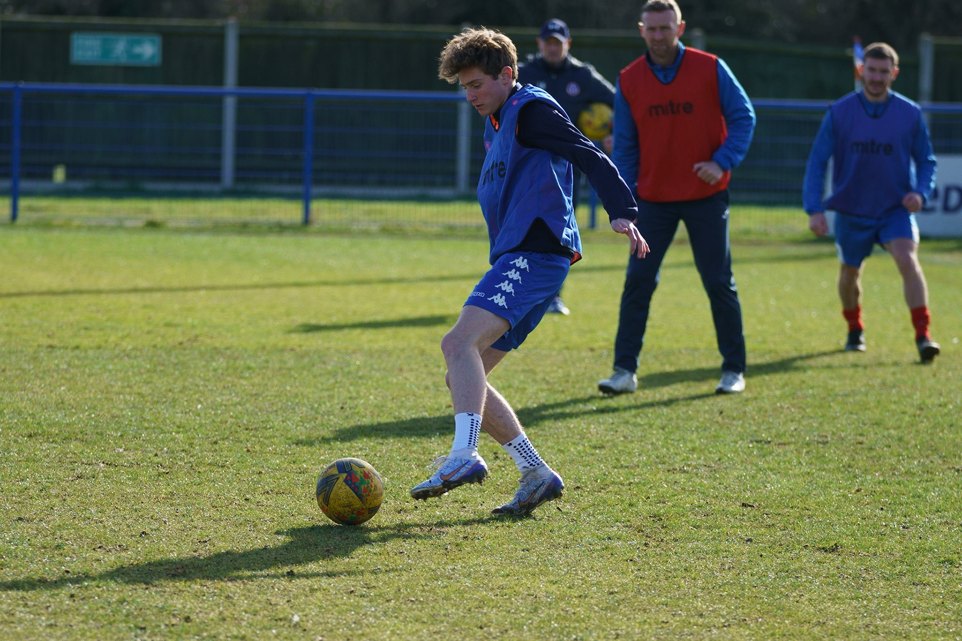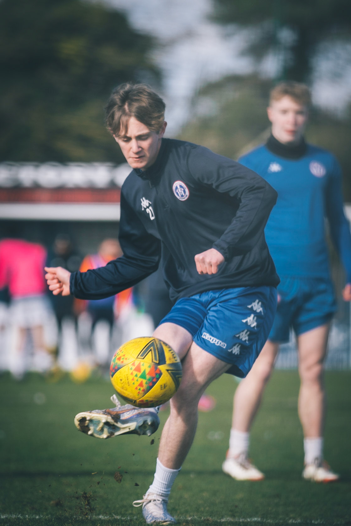 Adam Mills striking the ball with the stratford g.k pulling off a good save to keep it 0-0