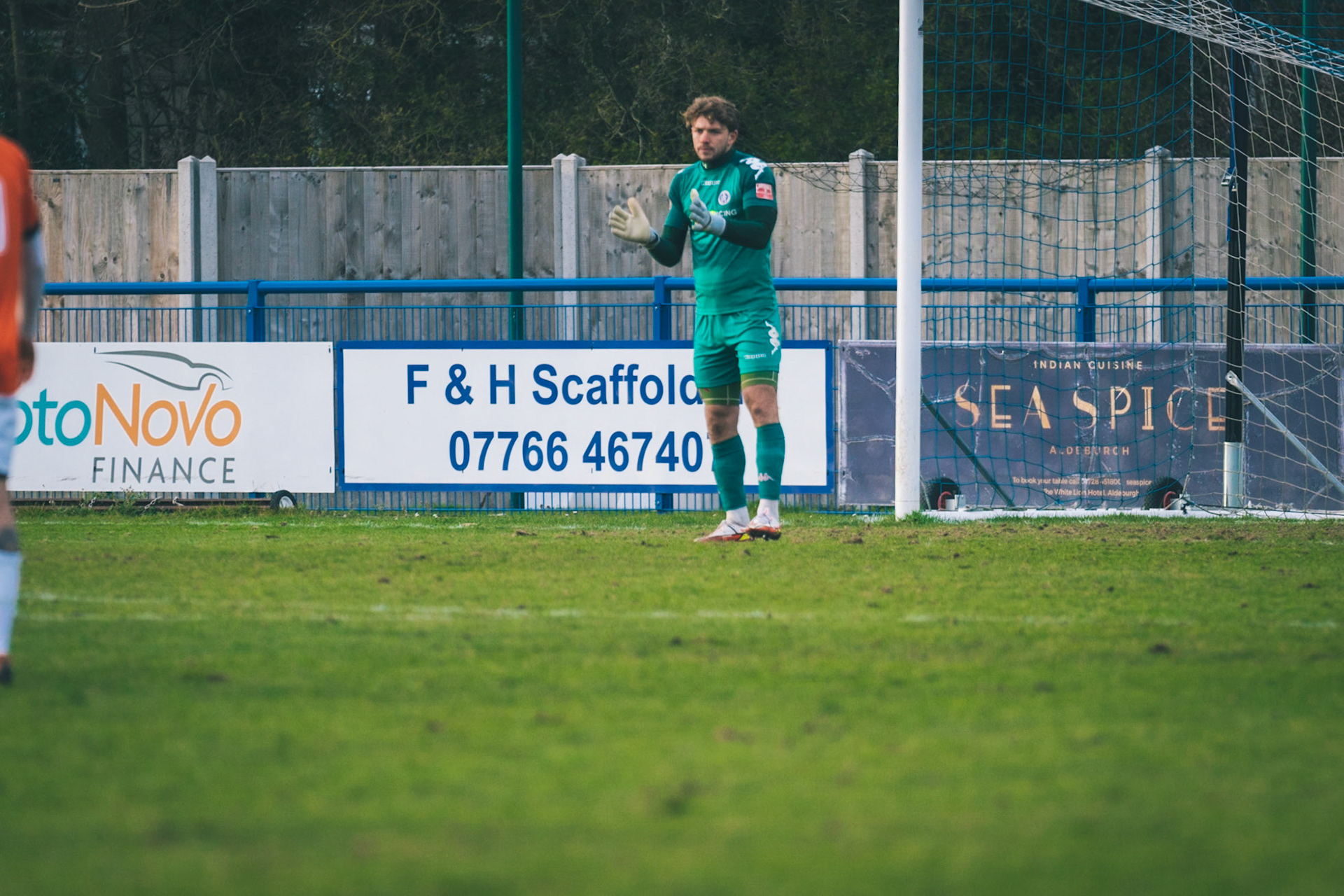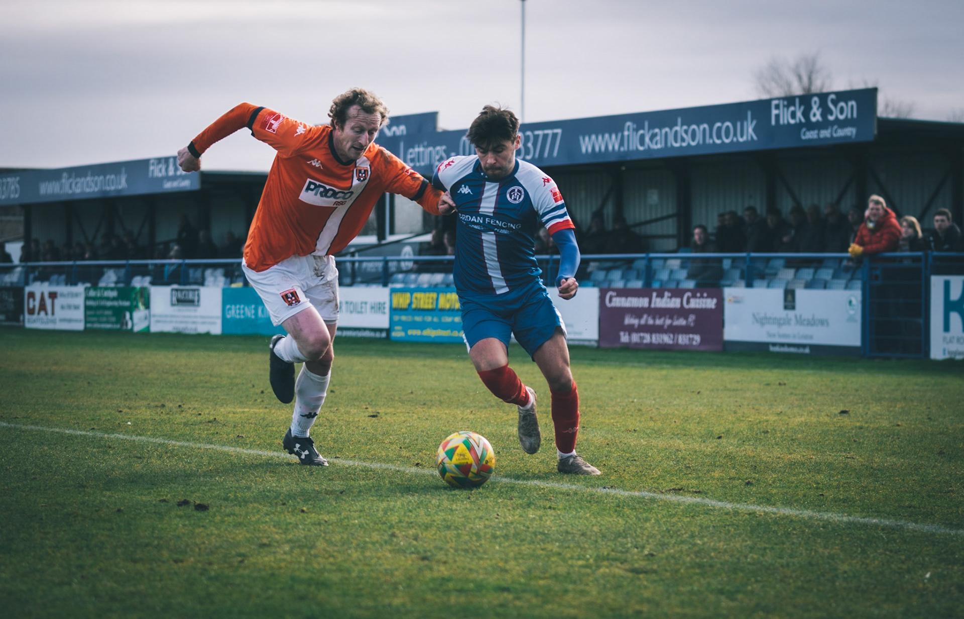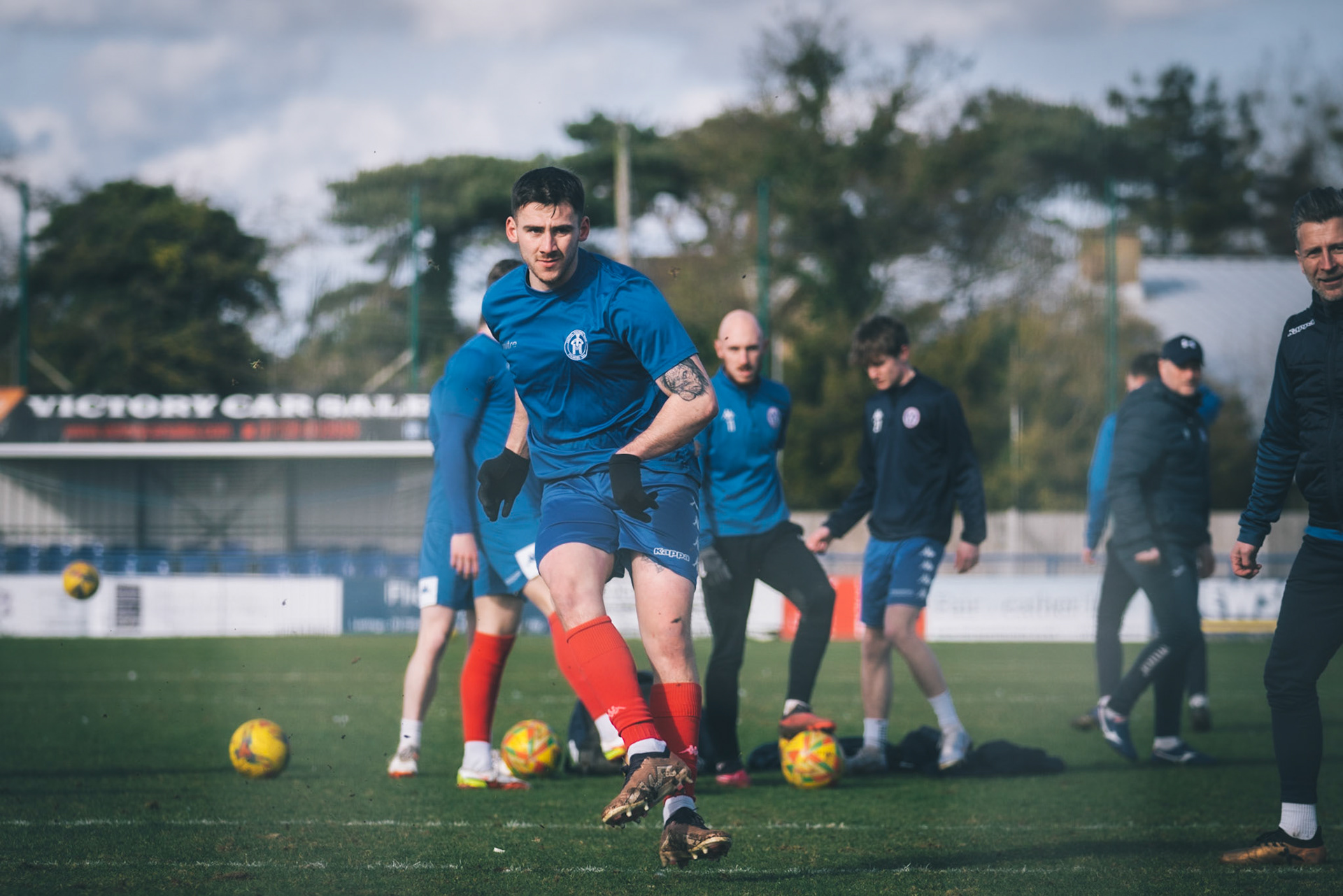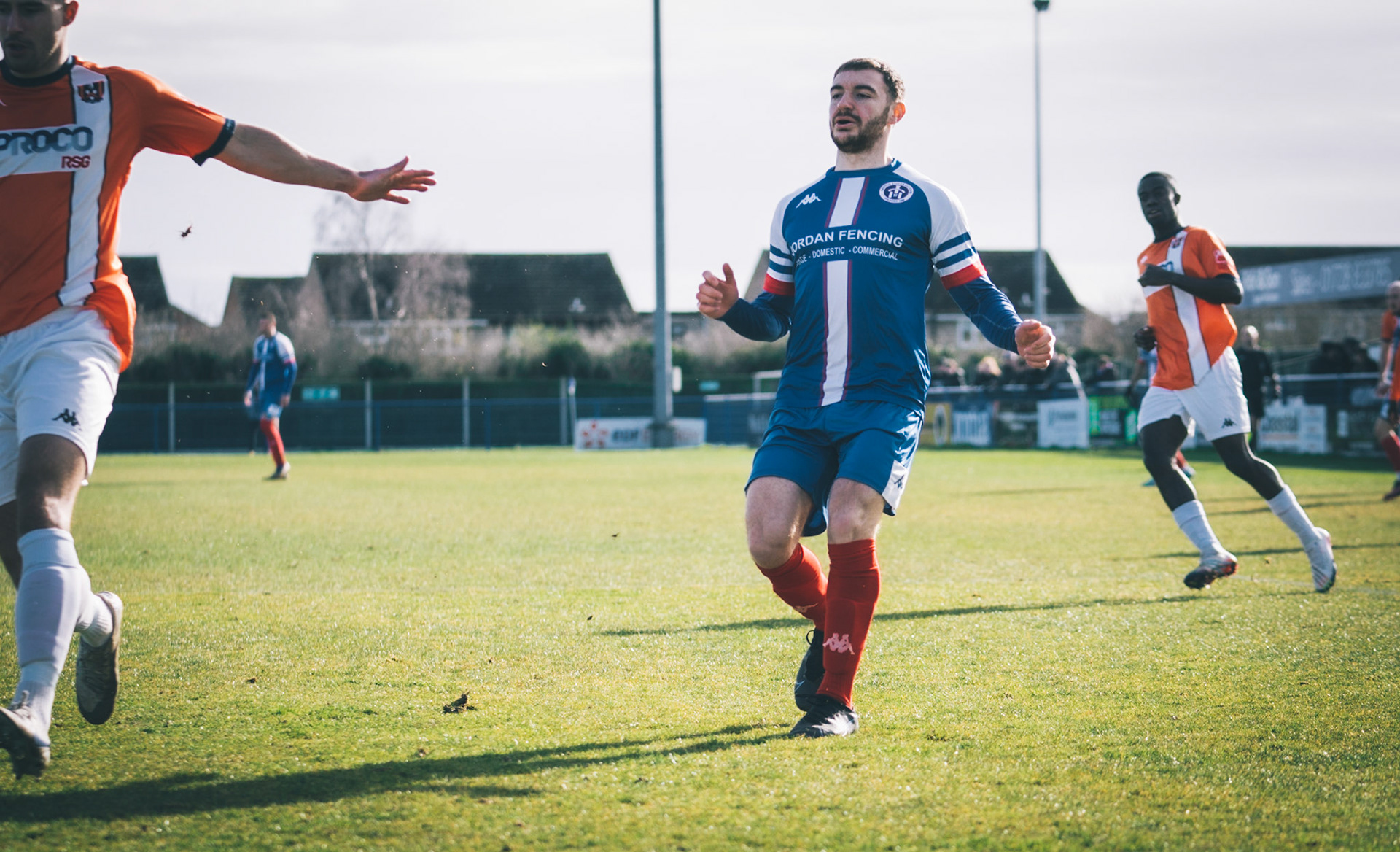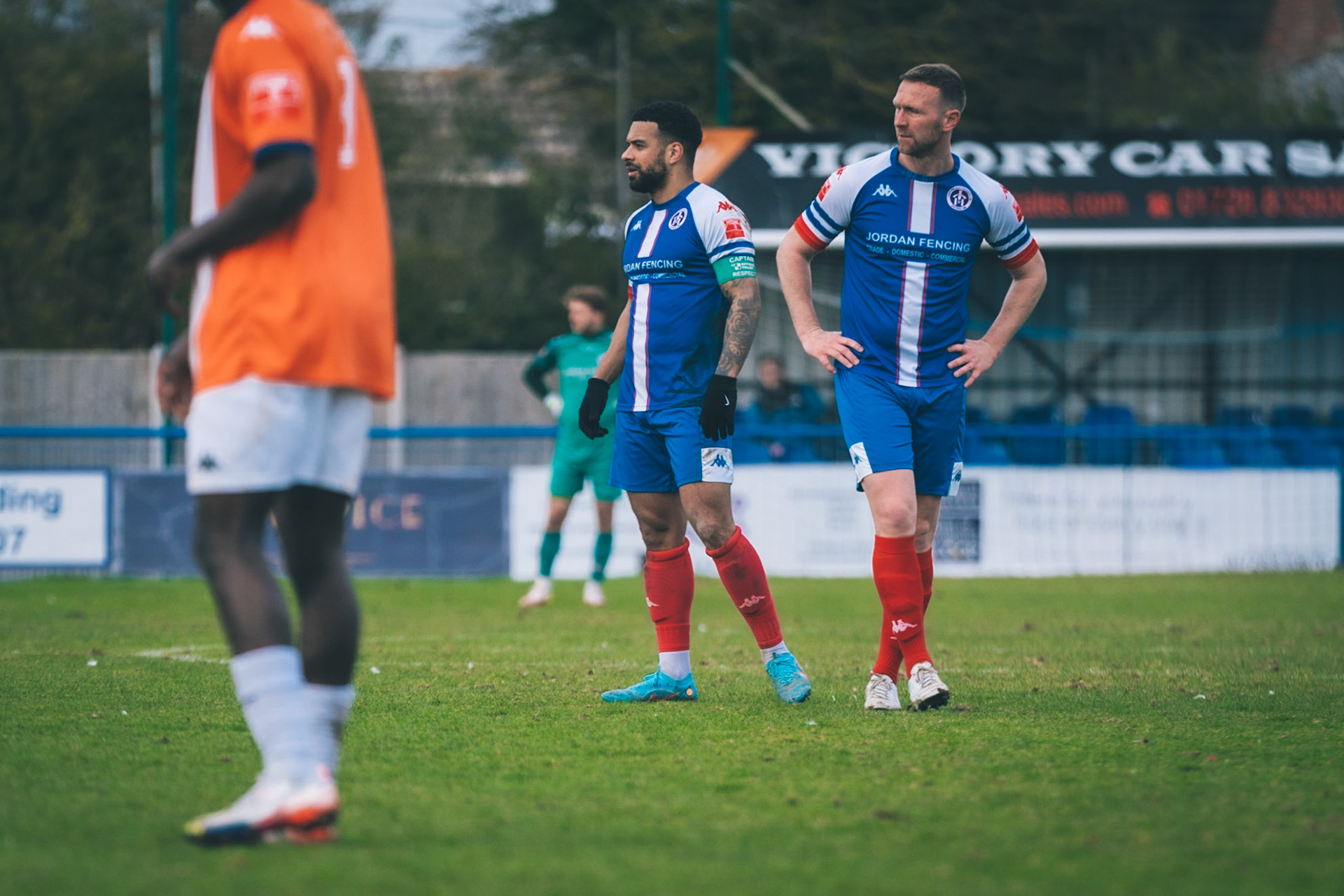 Adam Mills striking the ball with the stratford g.k pulling off a good save to keep it 0-0
