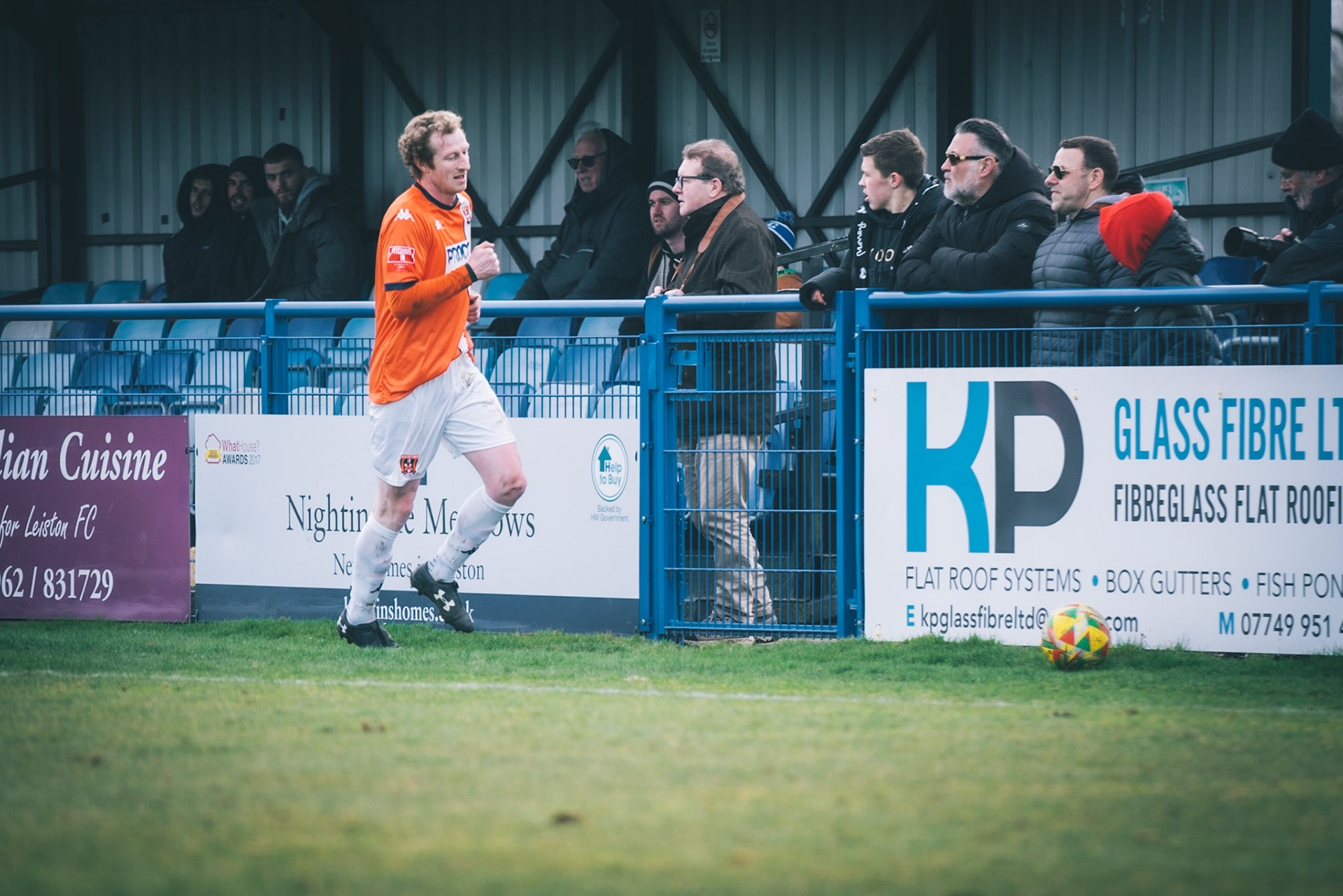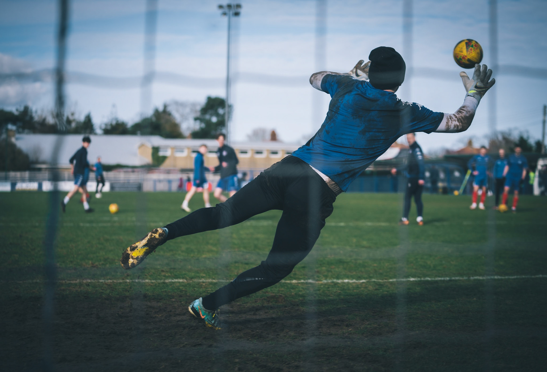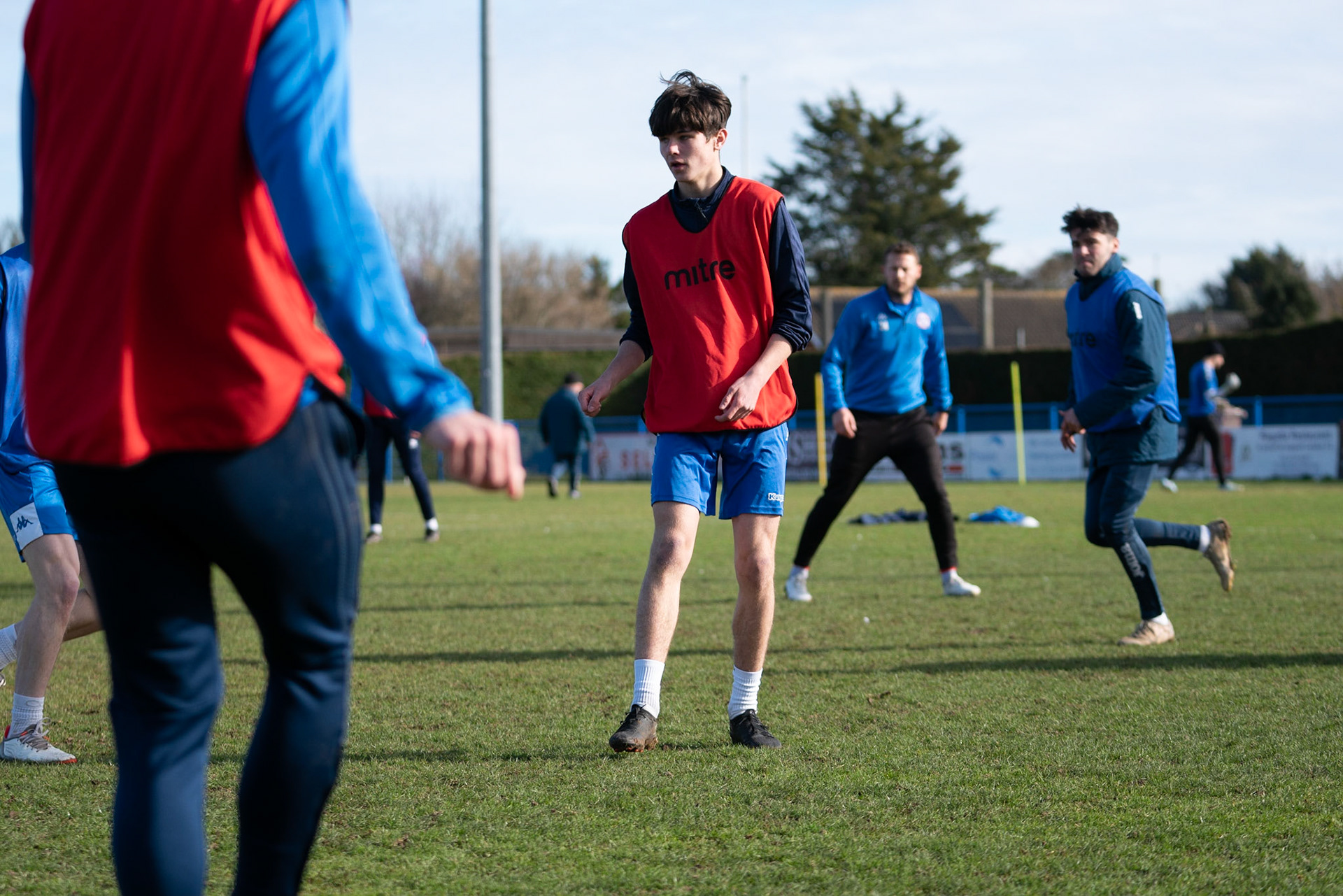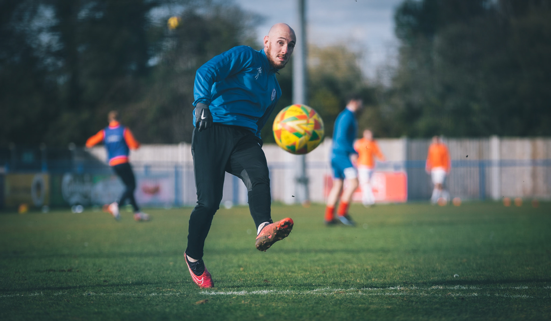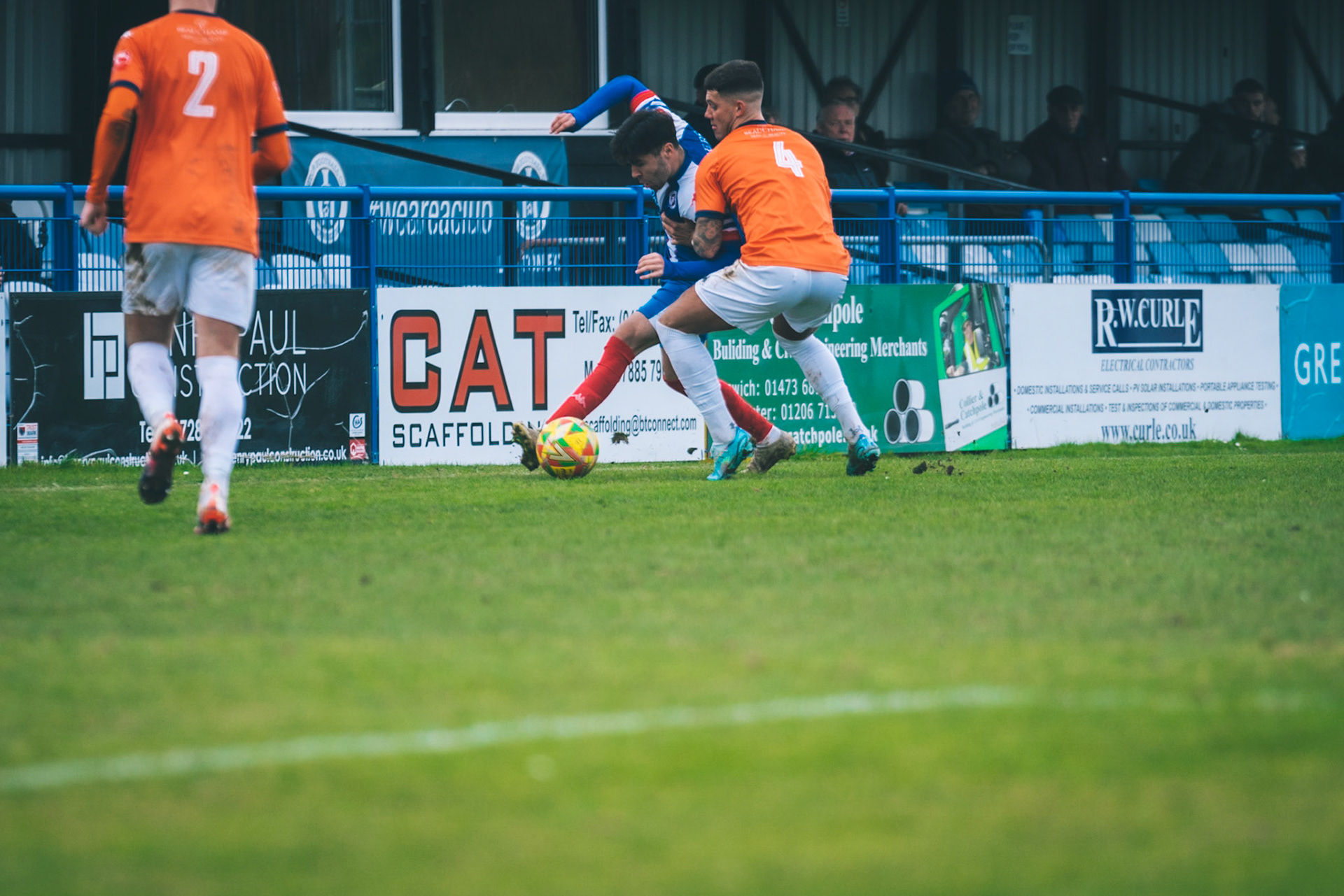 Adam Mills striking the ball with the stratford g.k pulling off a good save to keep it 0-0