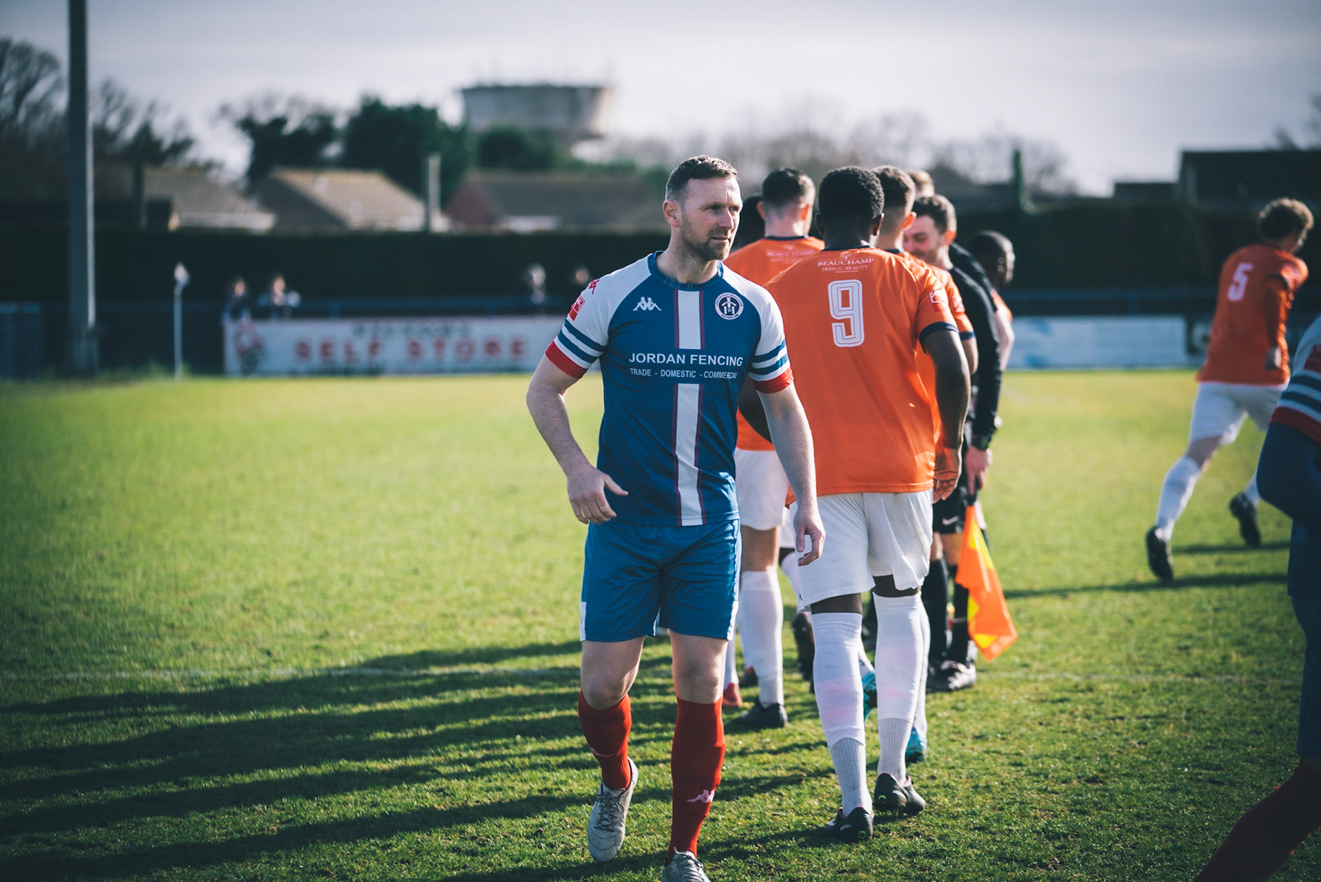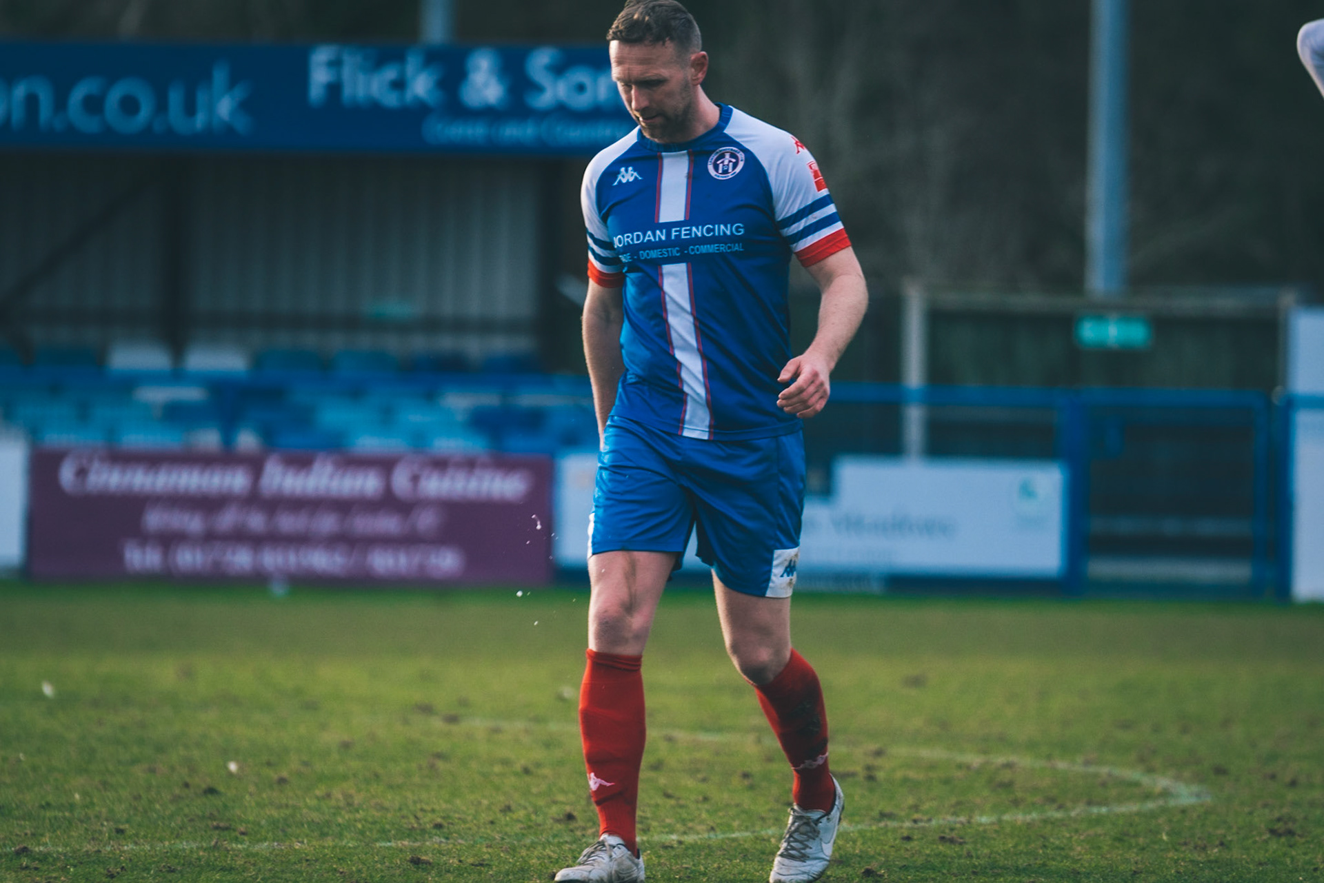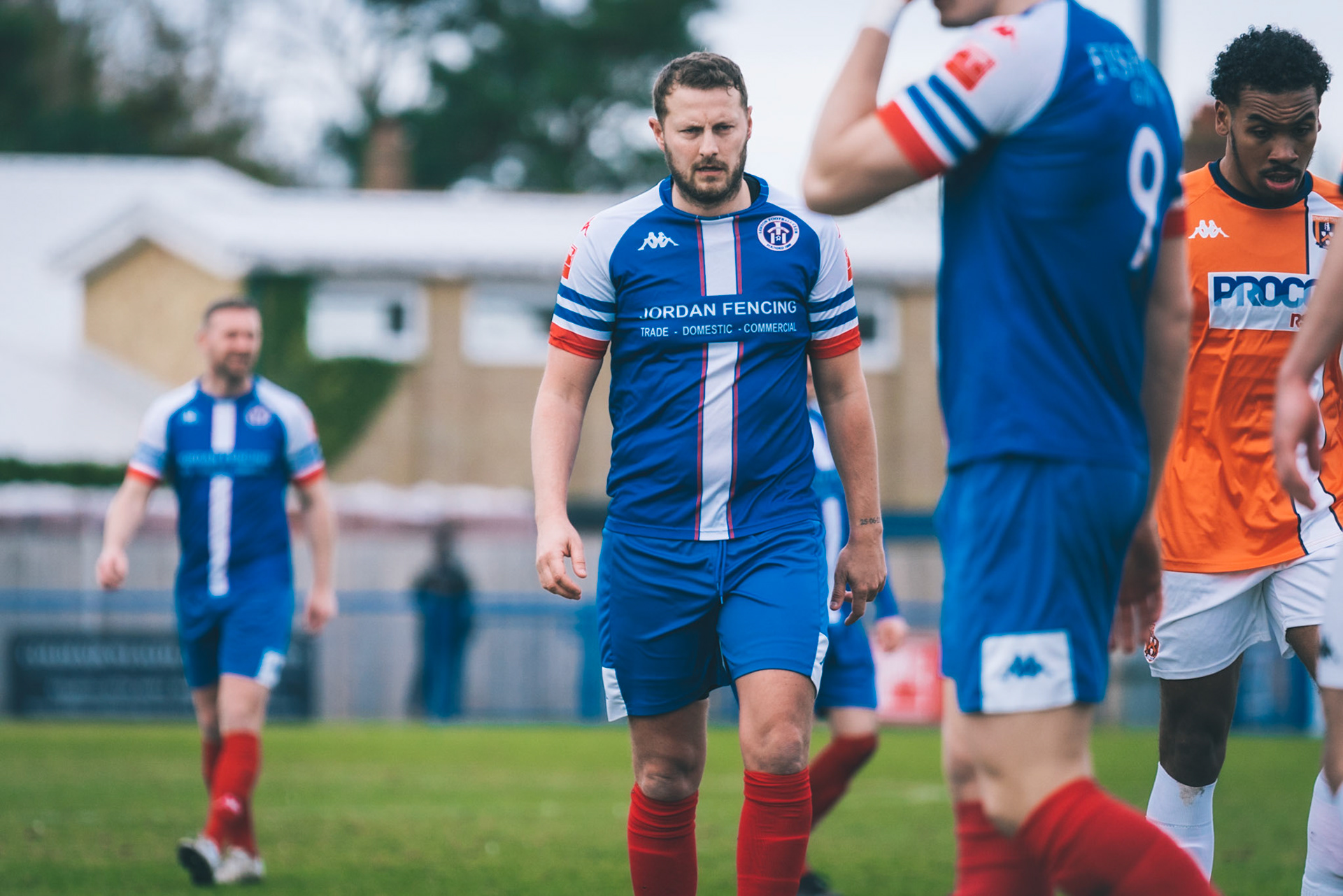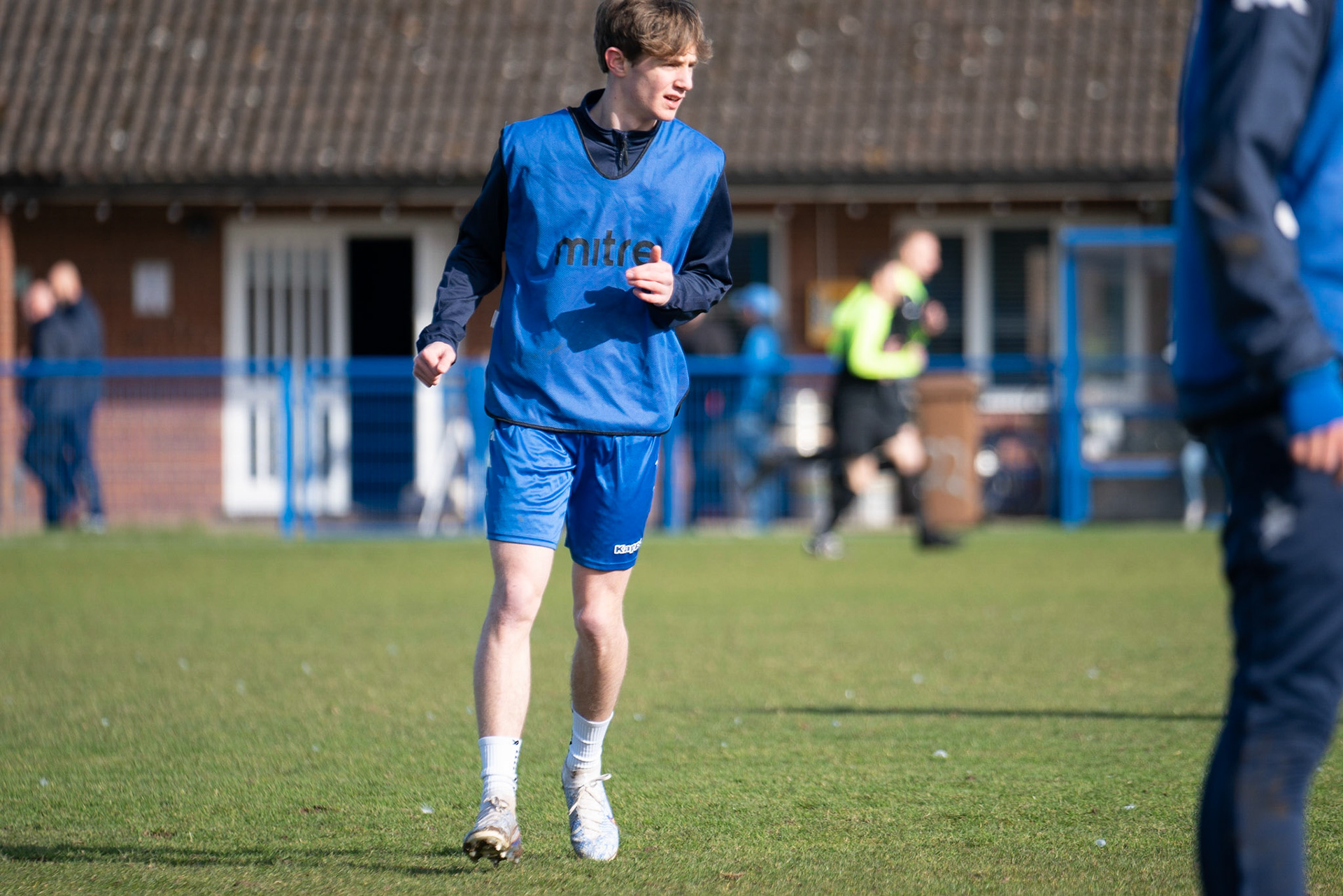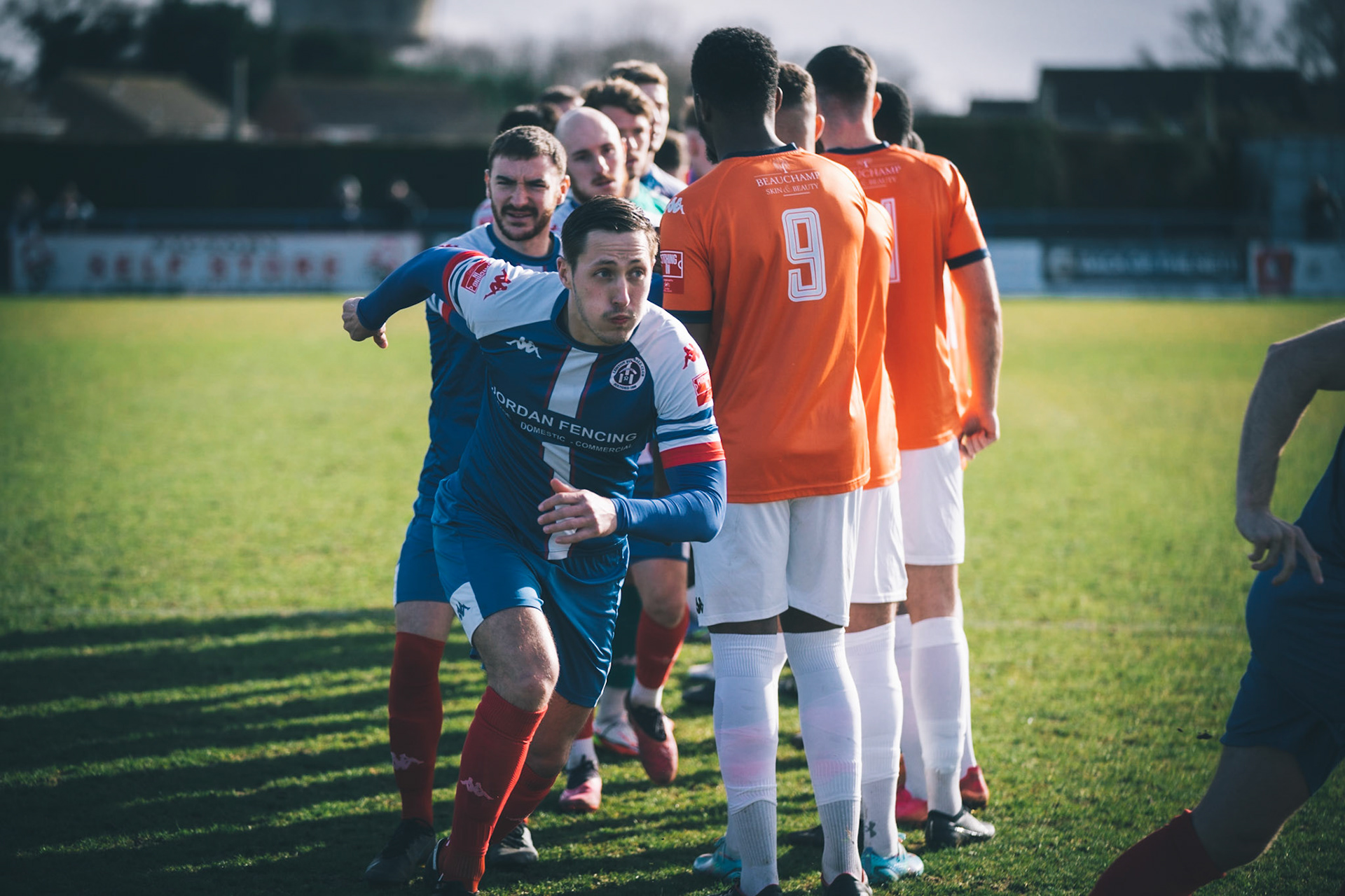 Adam Mills striking the ball with the stratford g.k pulling off a good save to keep it 0-0