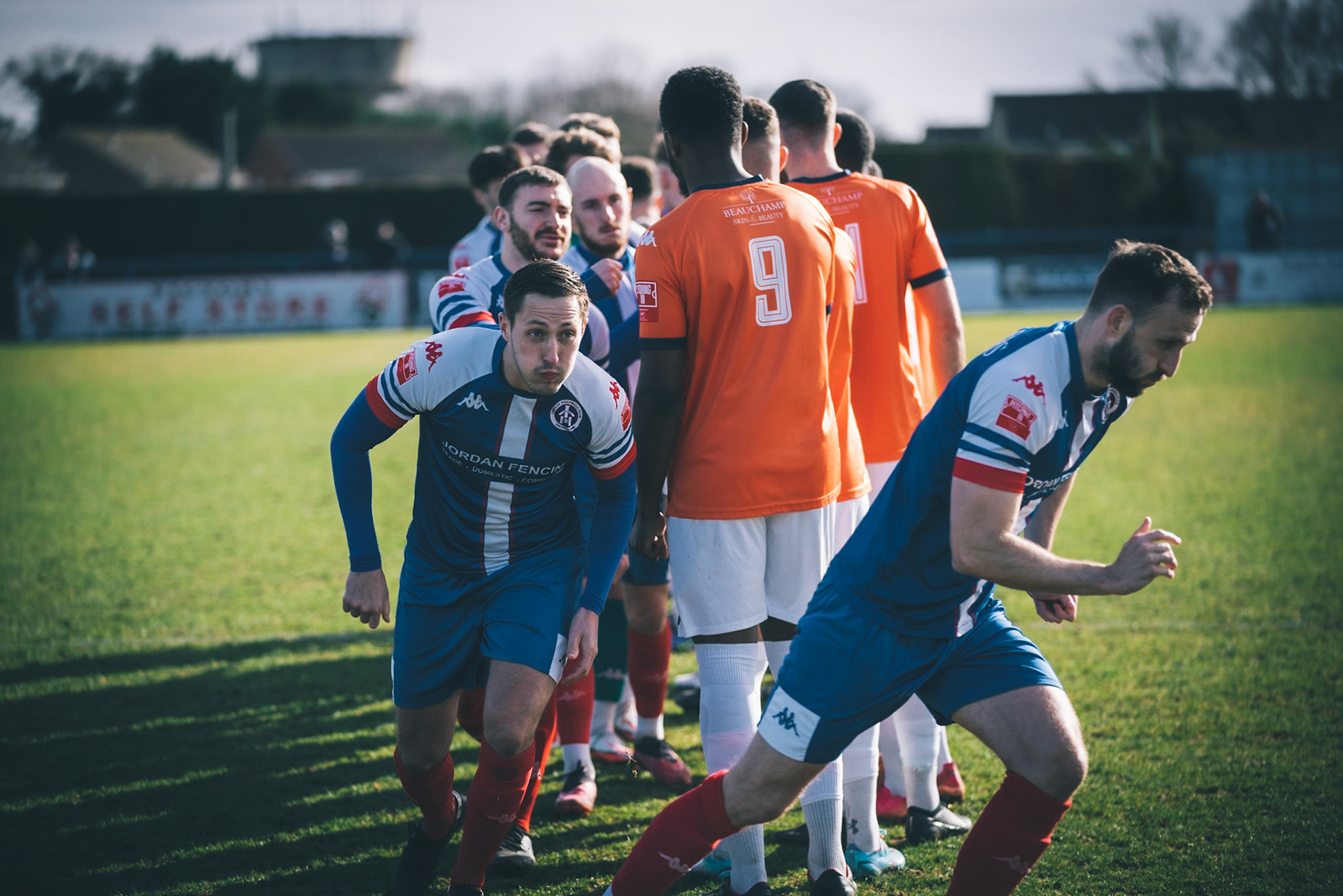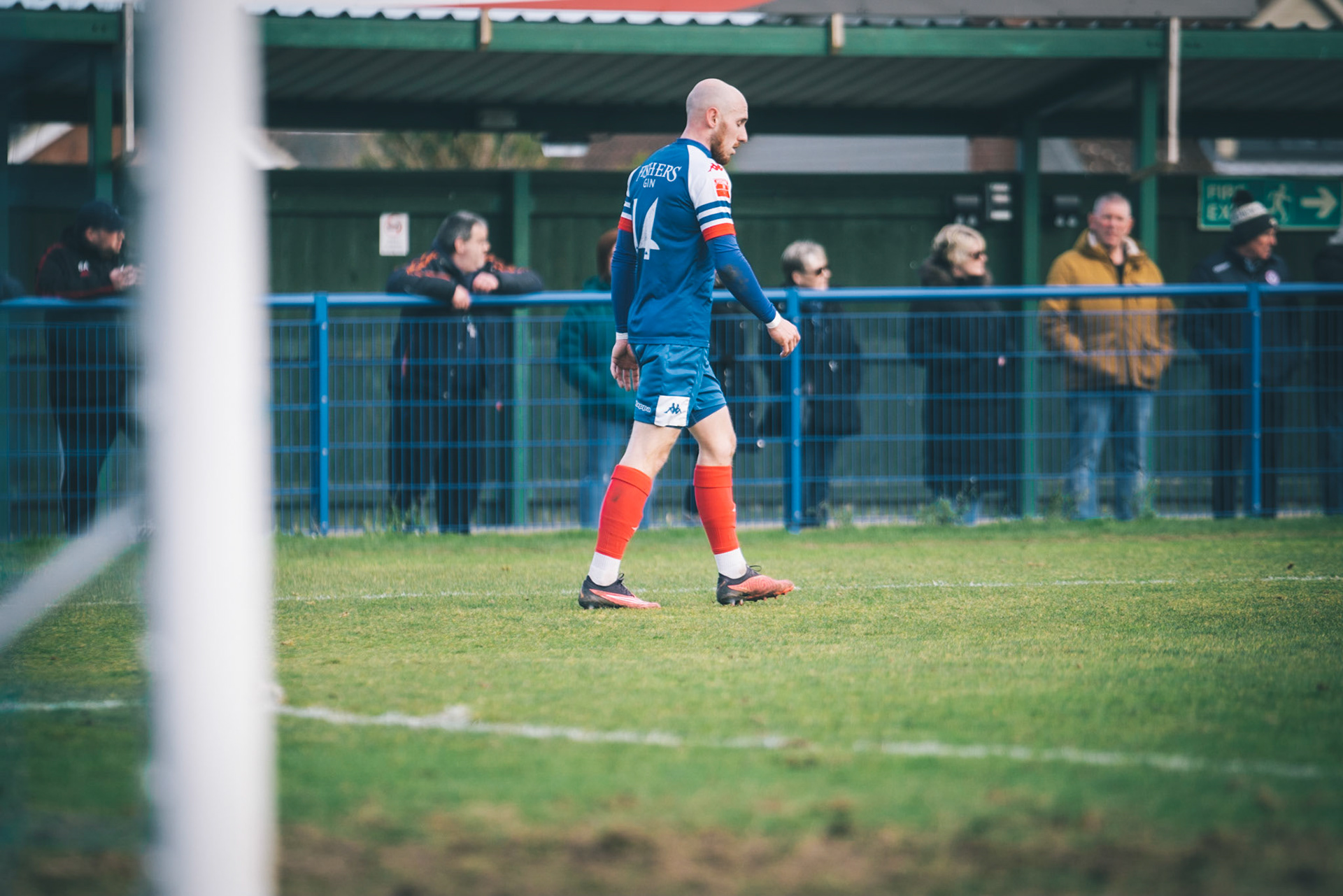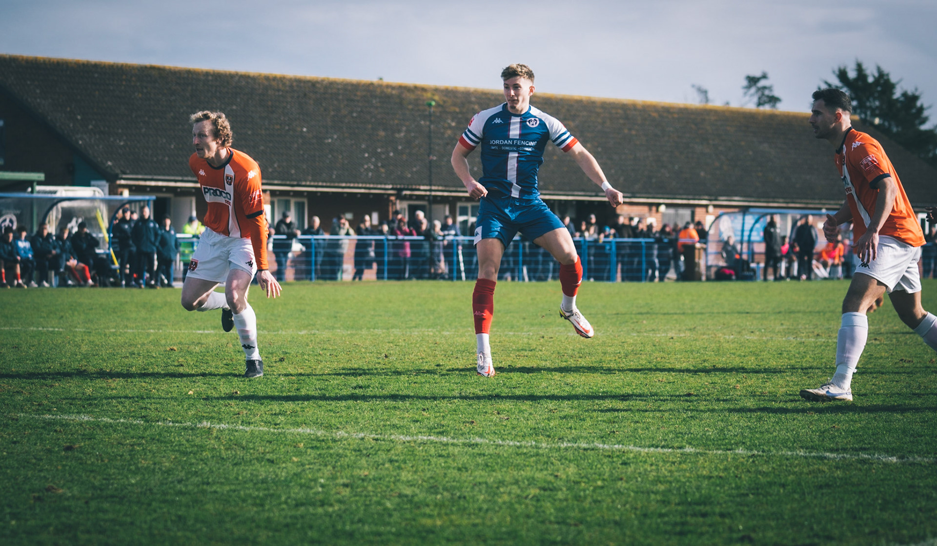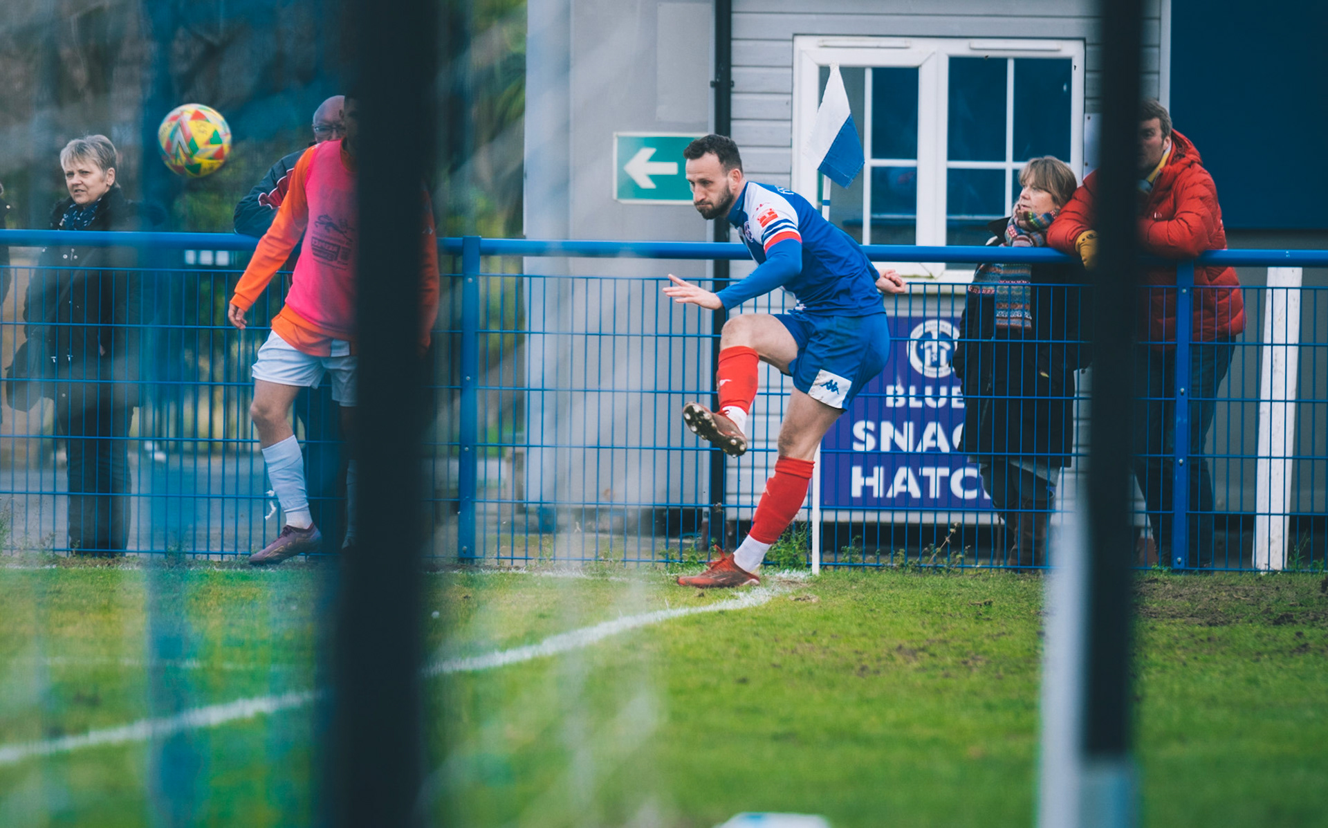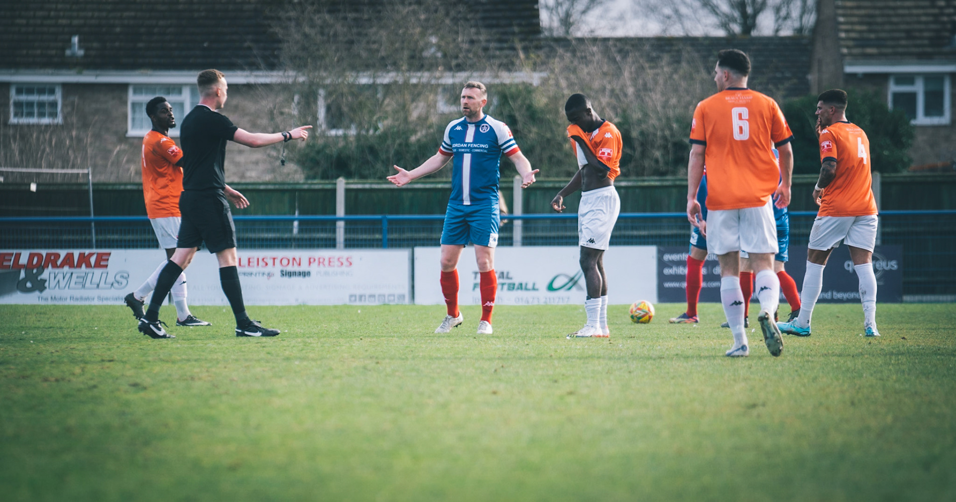 Adam Mills striking the ball with the stratford g.k pulling off a good save to keep it 0-0