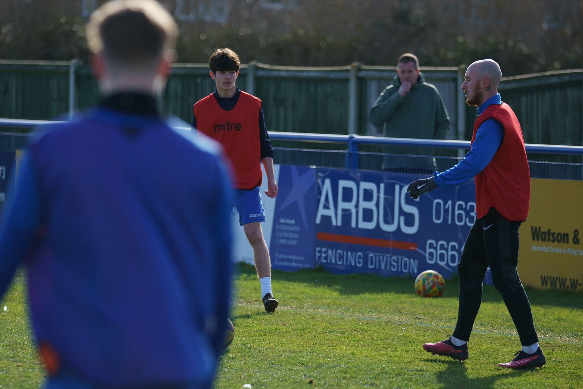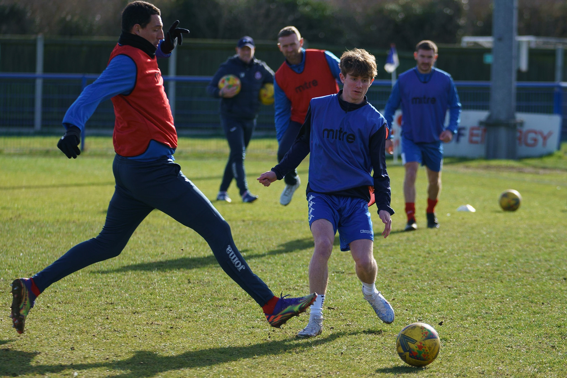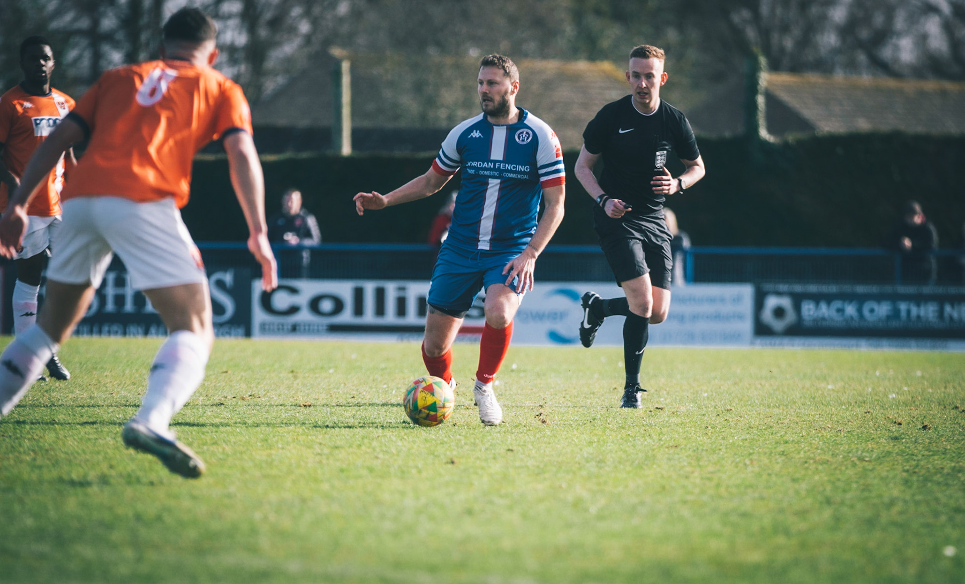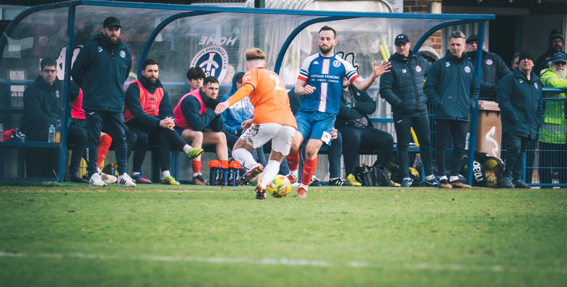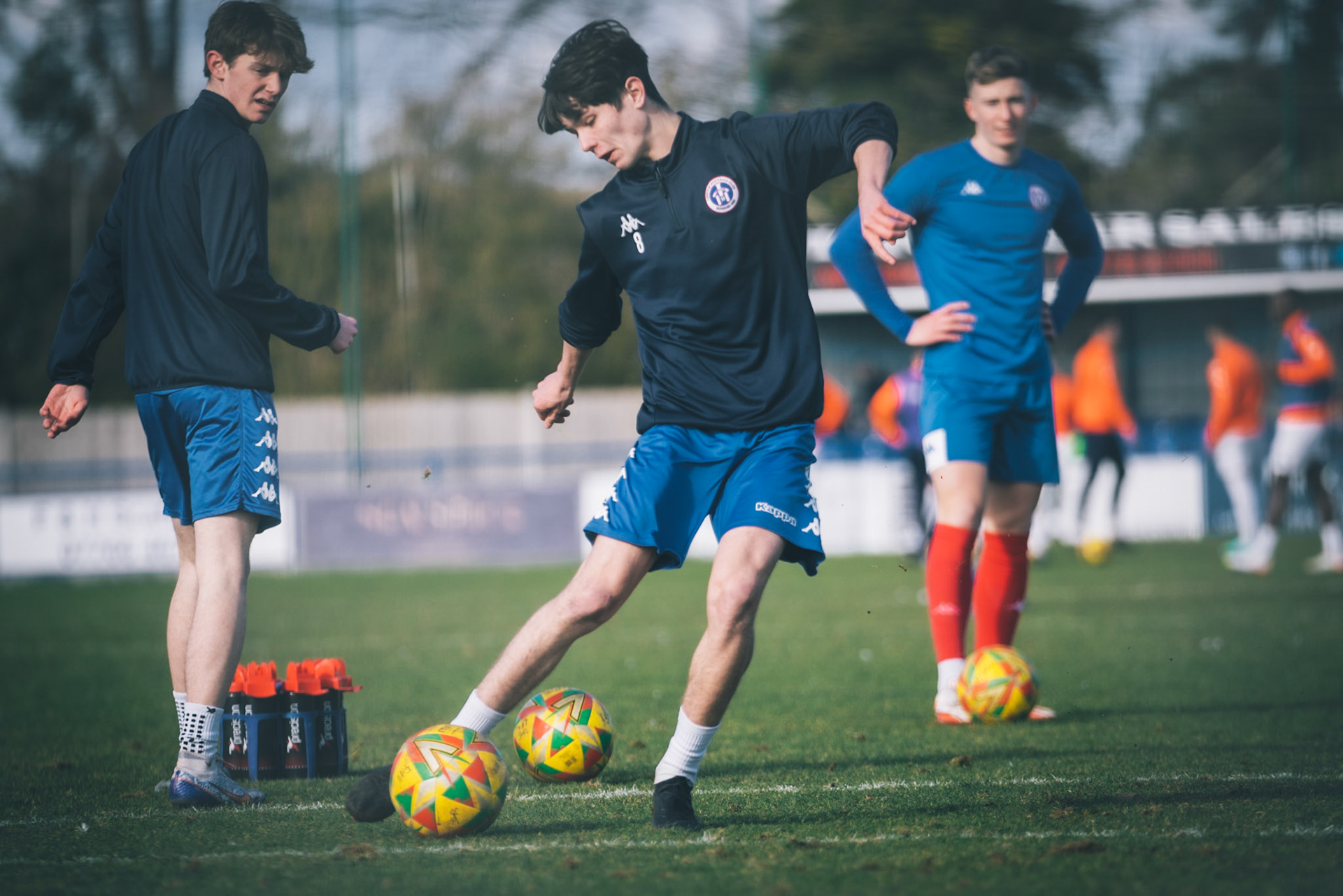 Adam Mills striking the ball with the stratford g.k pulling off a good save to keep it 0-0