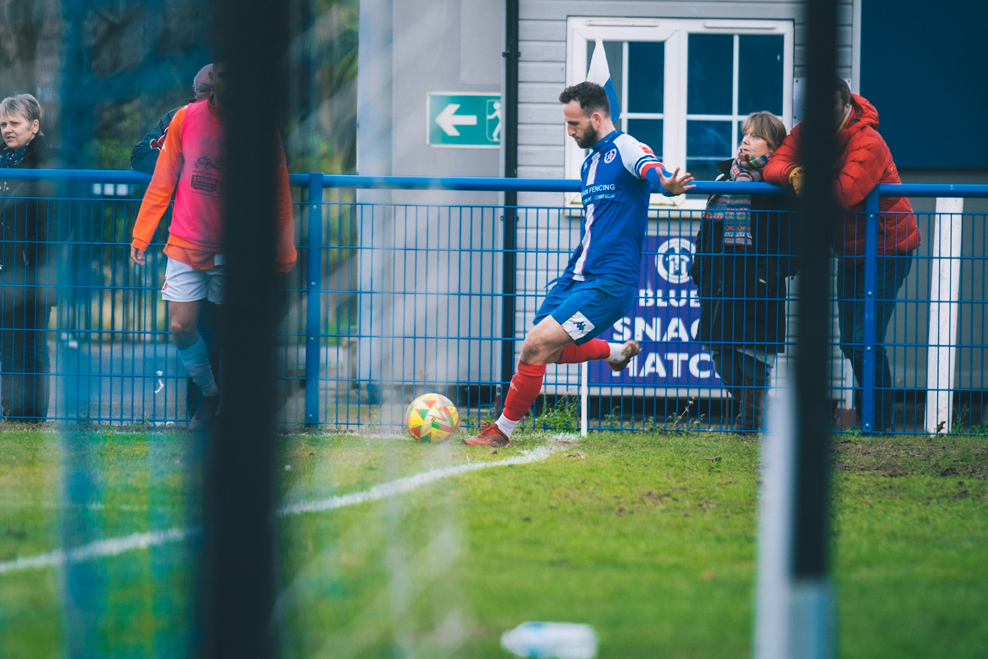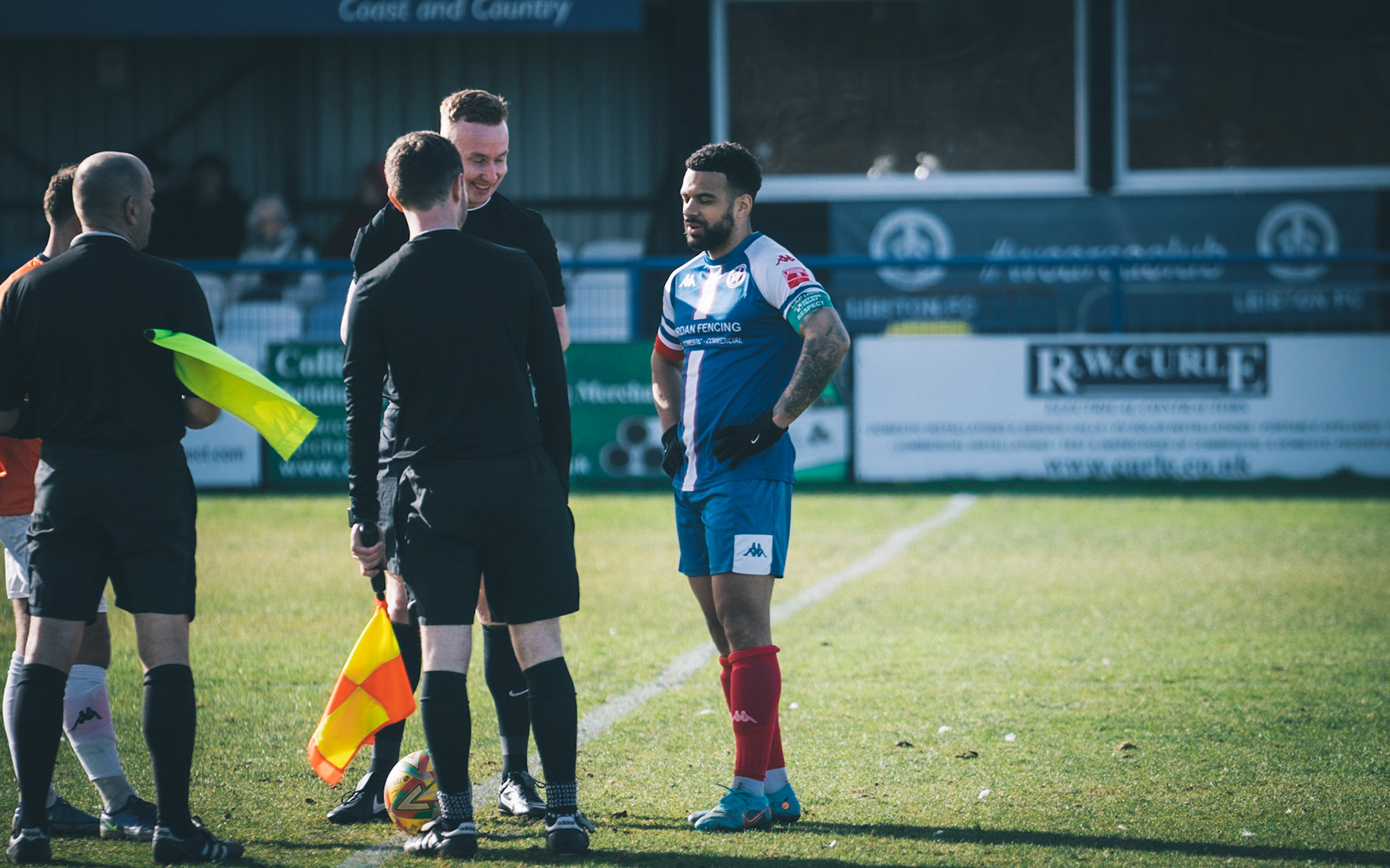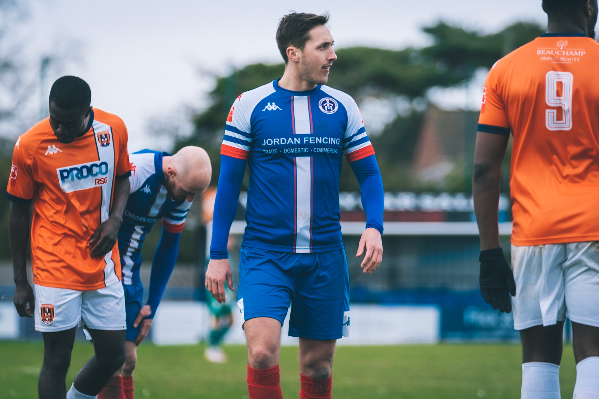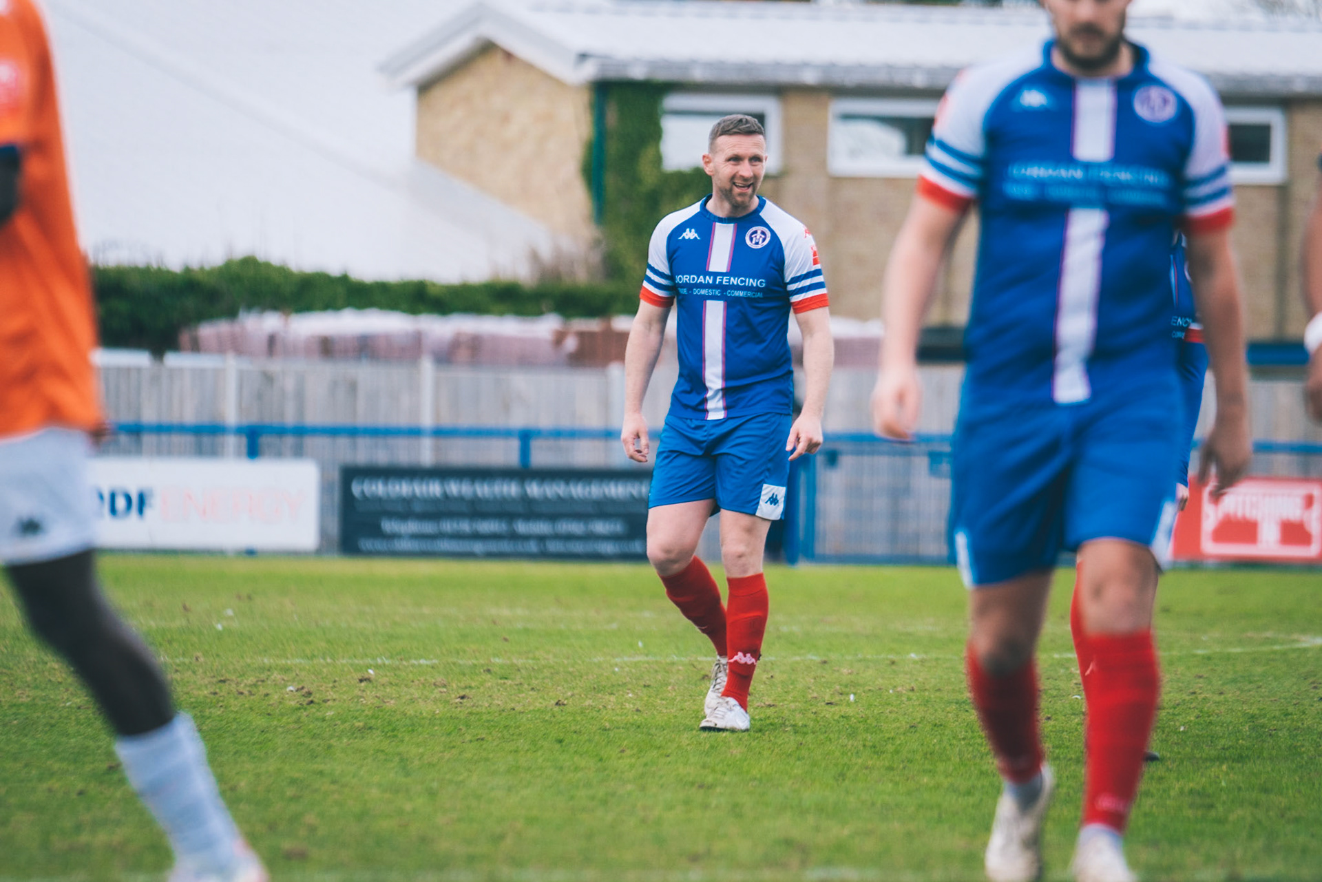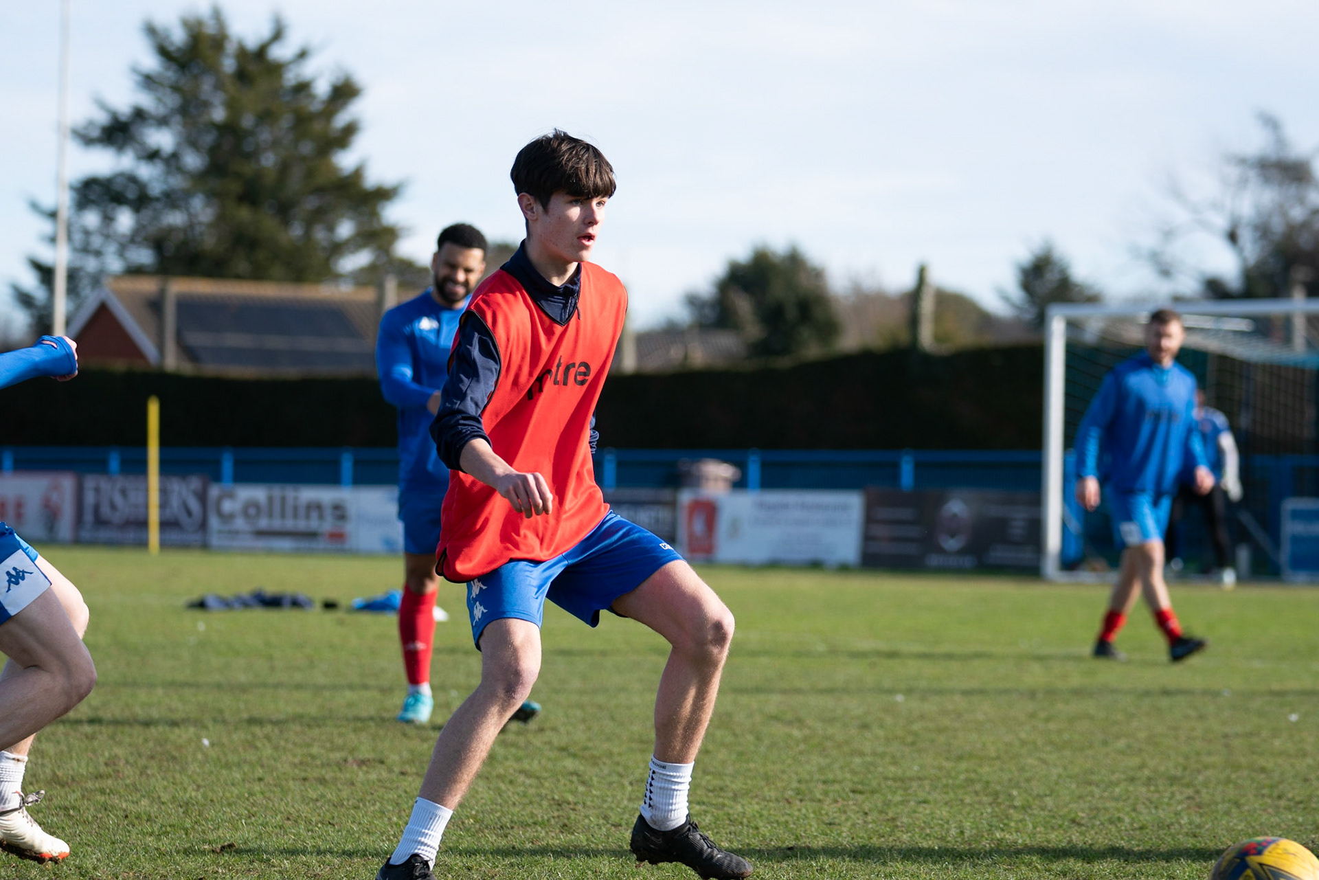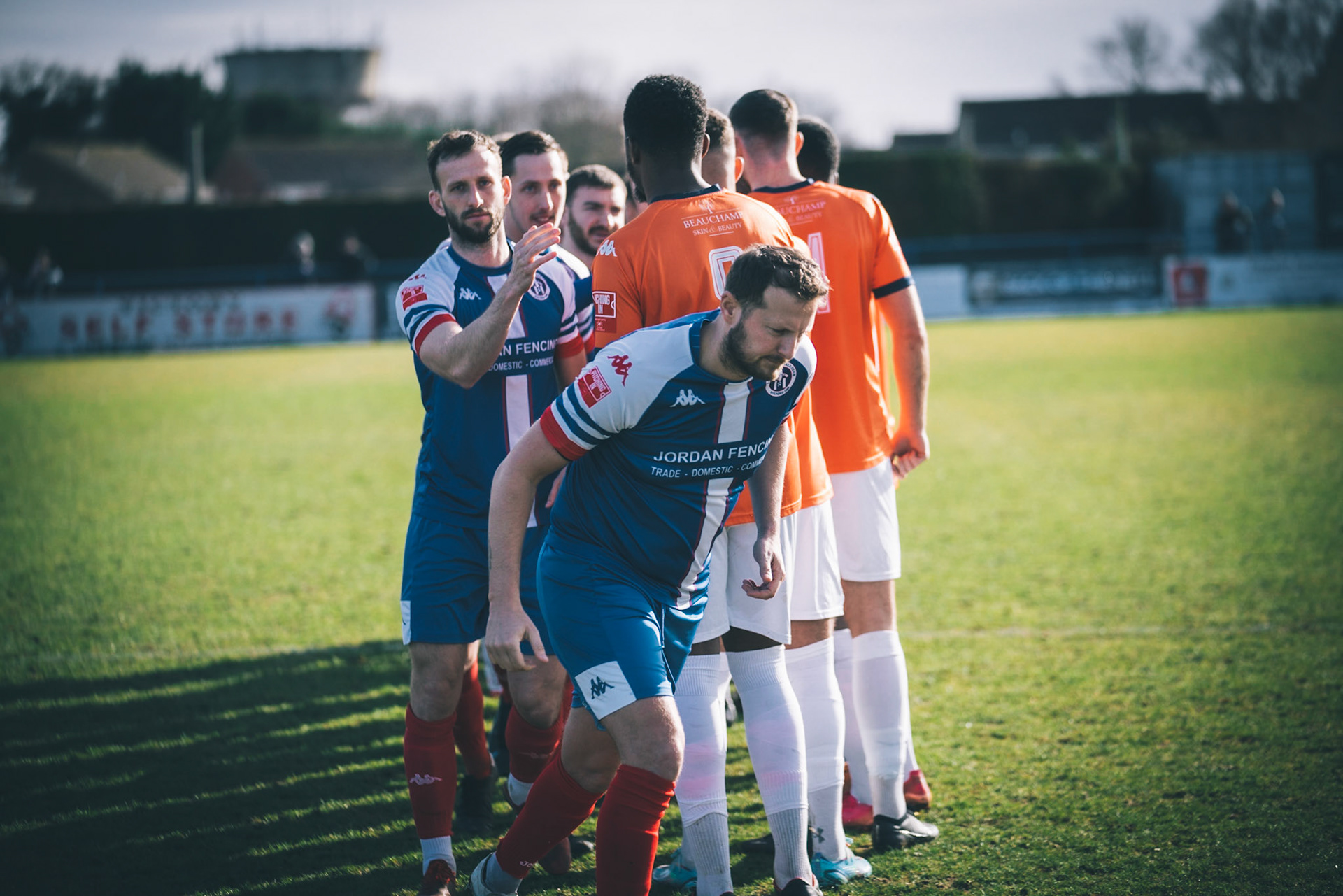 Adam Mills striking the ball with the stratford g.k pulling off a good save to keep it 0-0