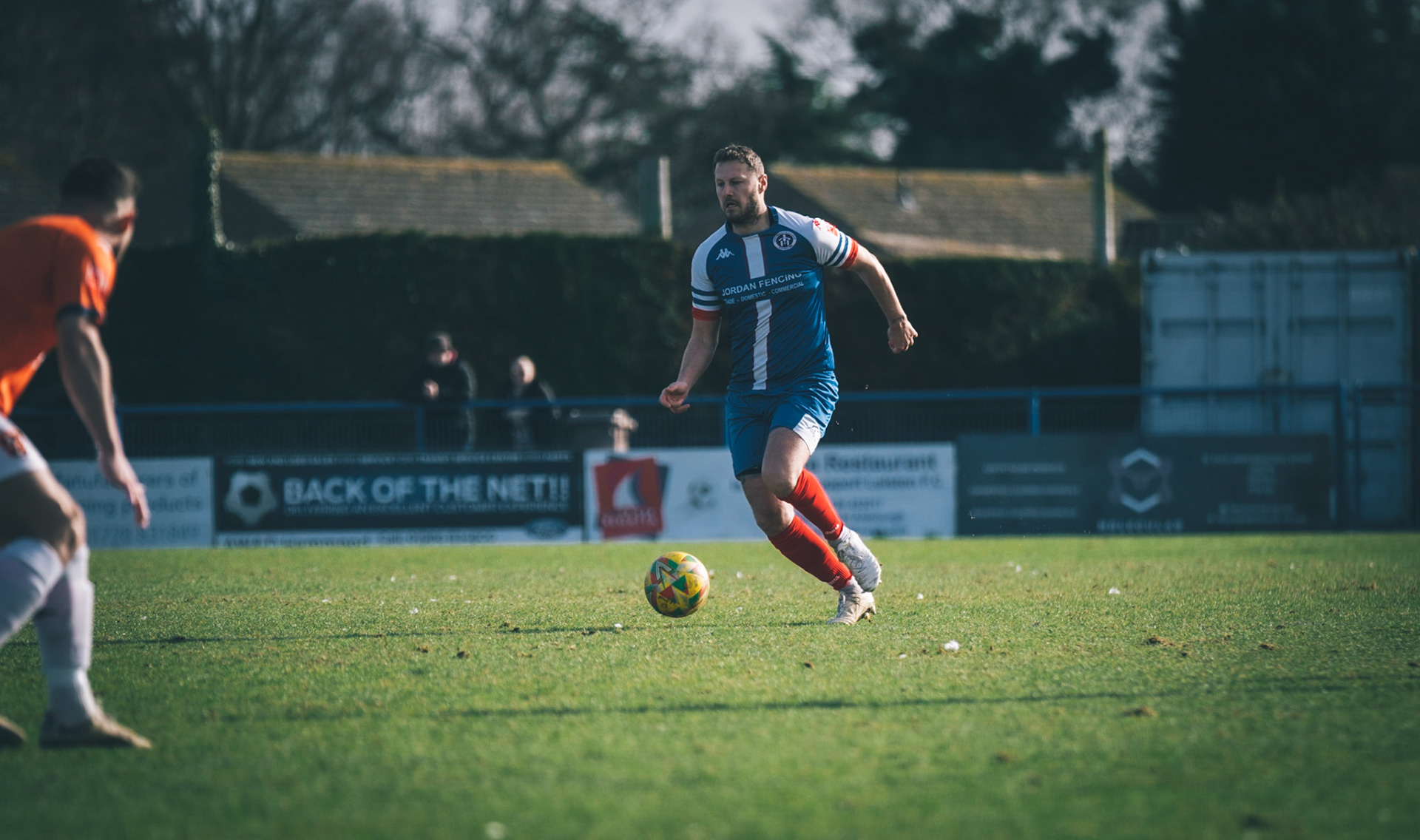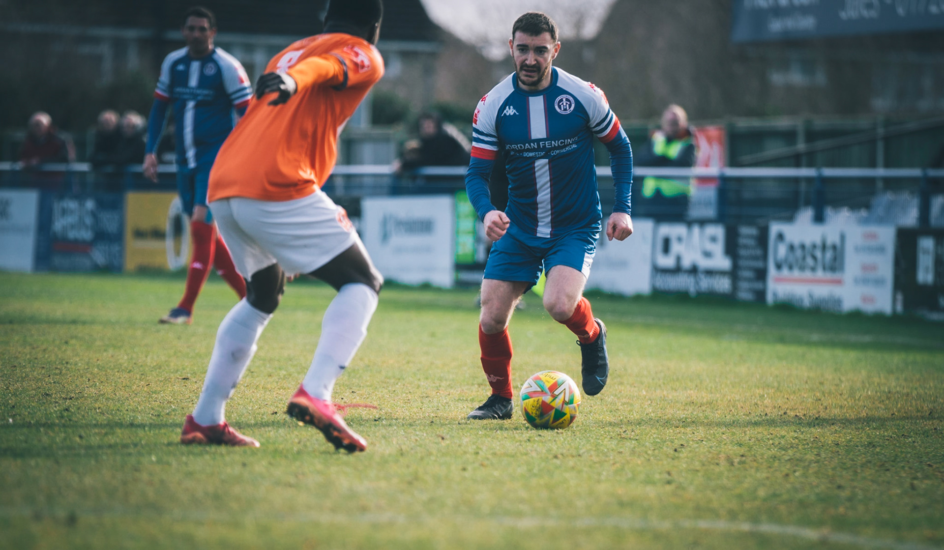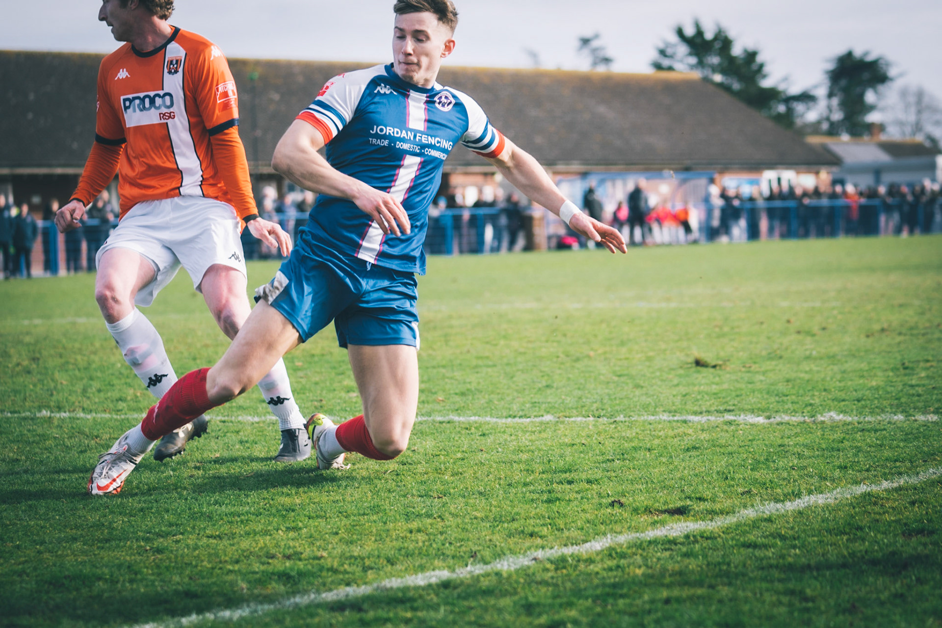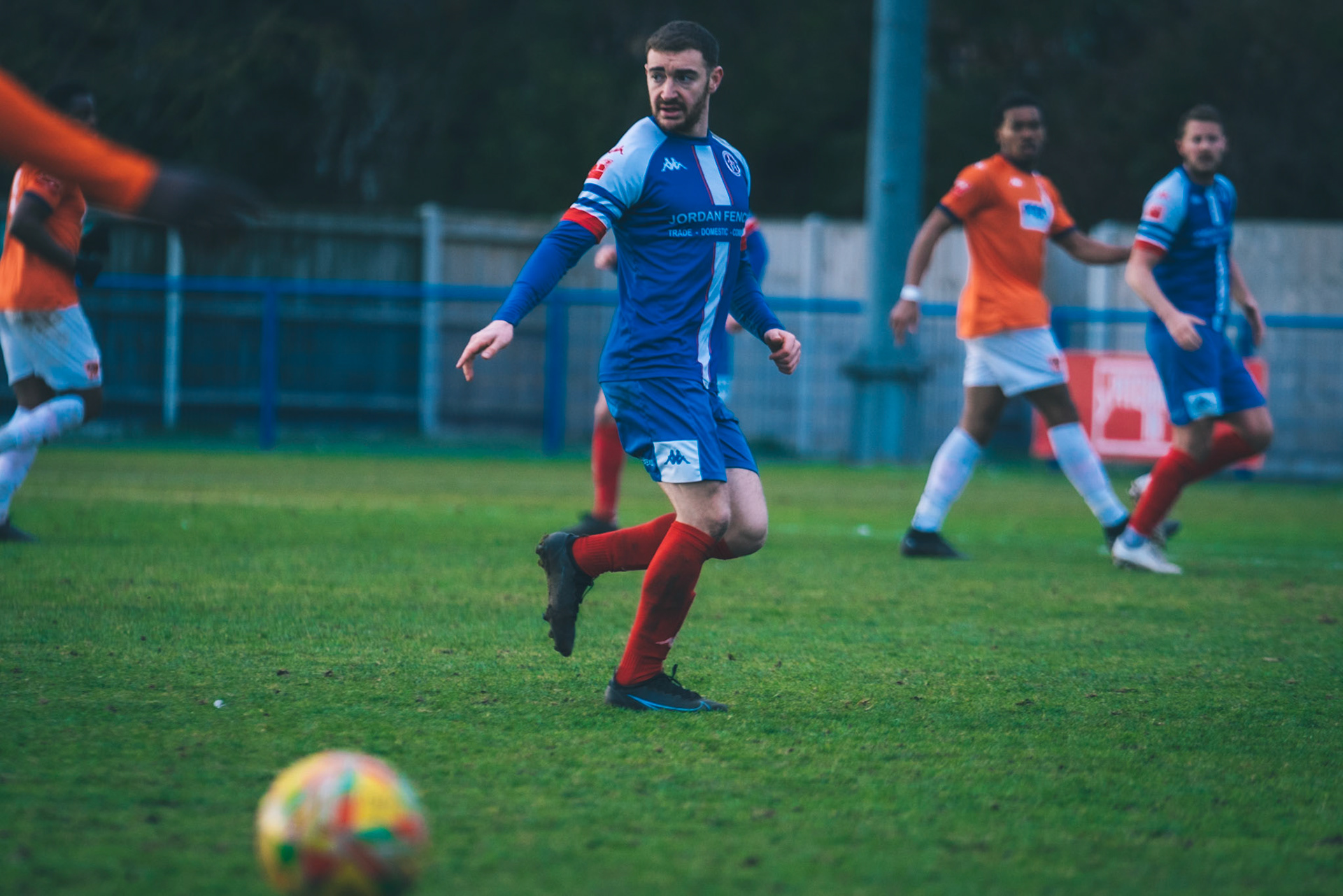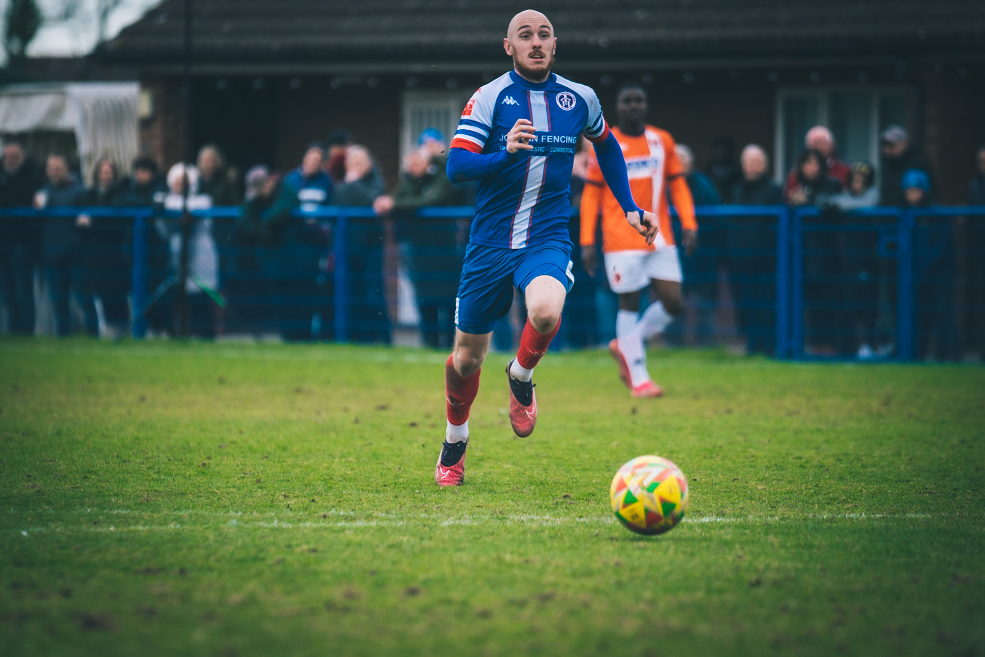 Fin Barnes taking on Stratford full back