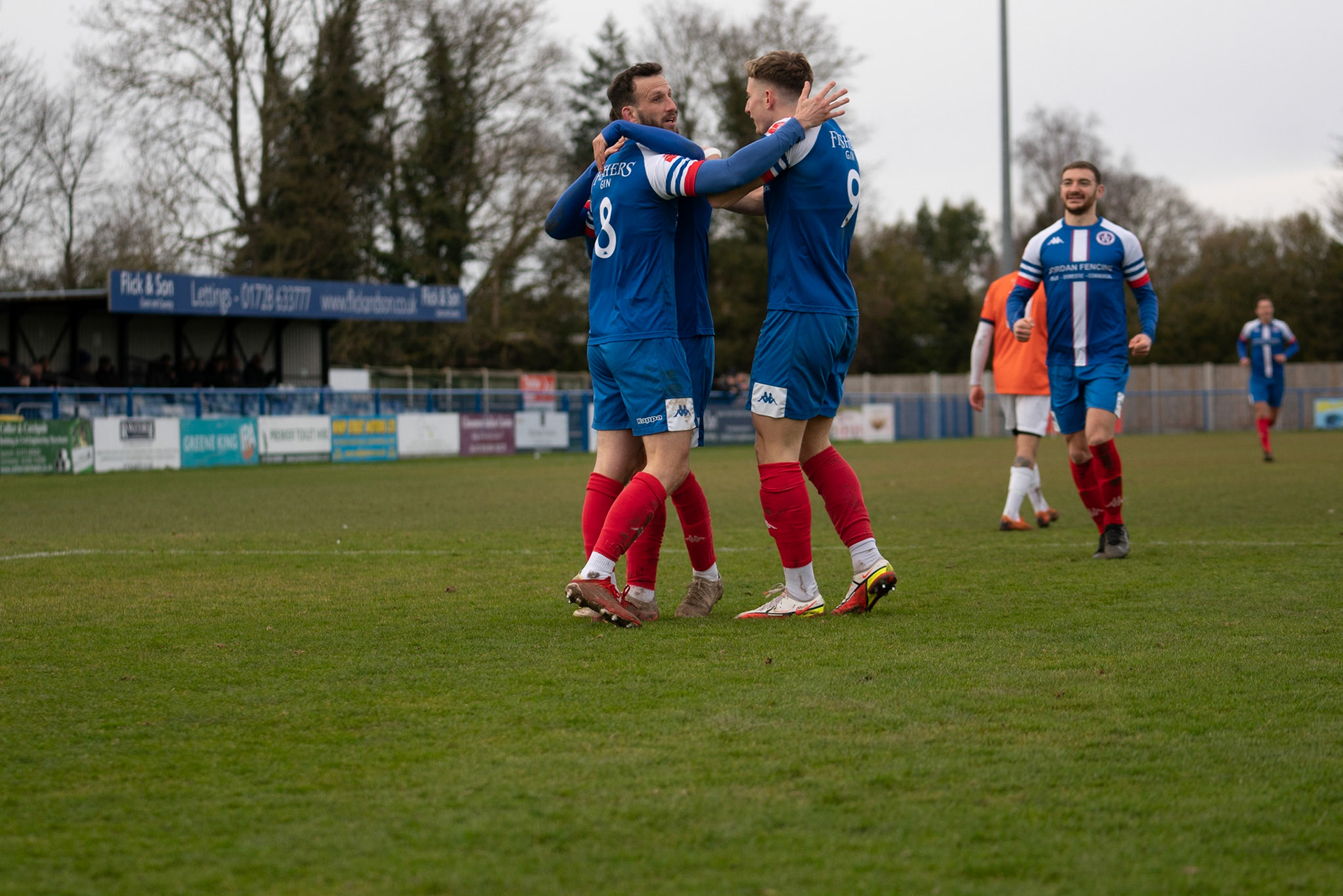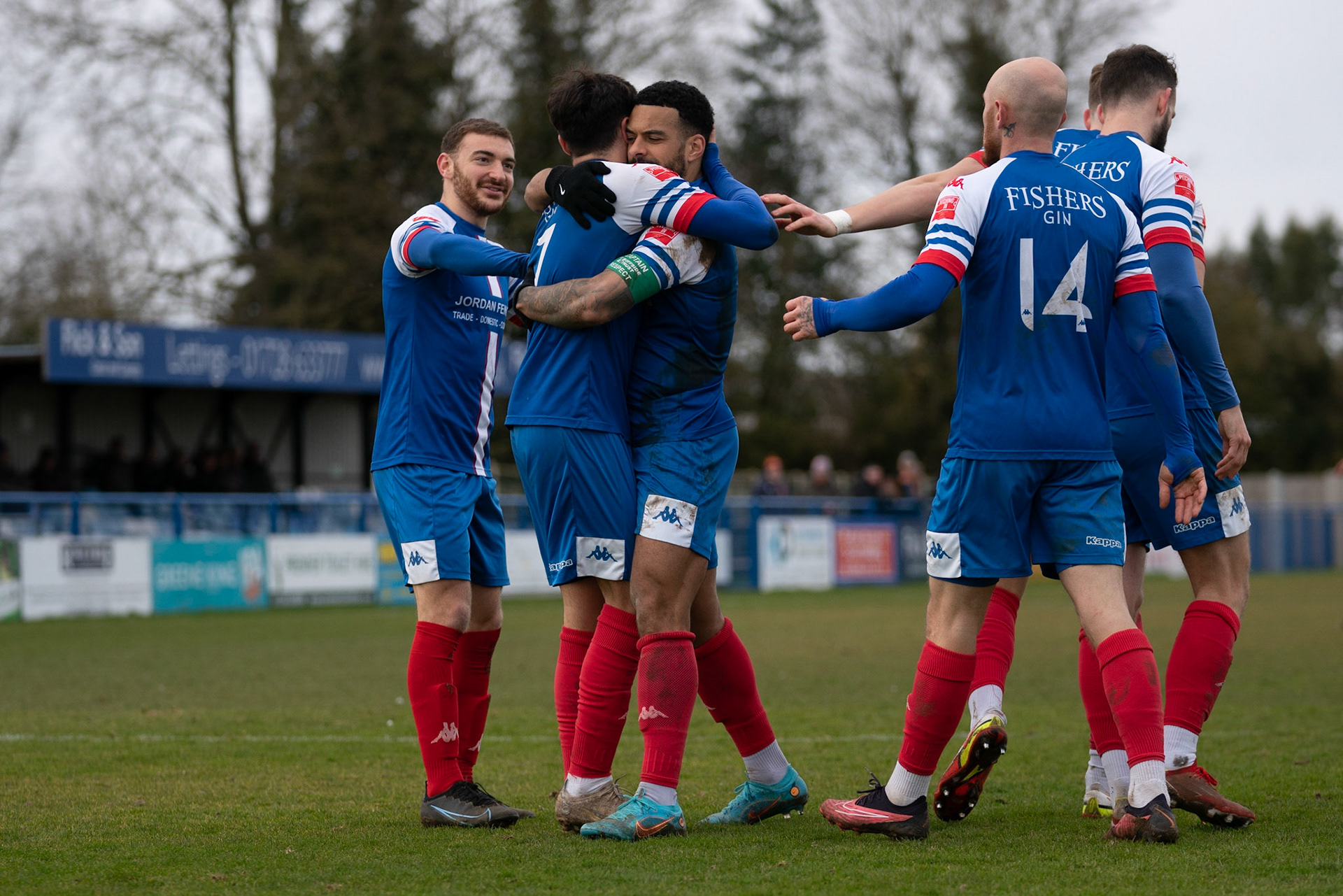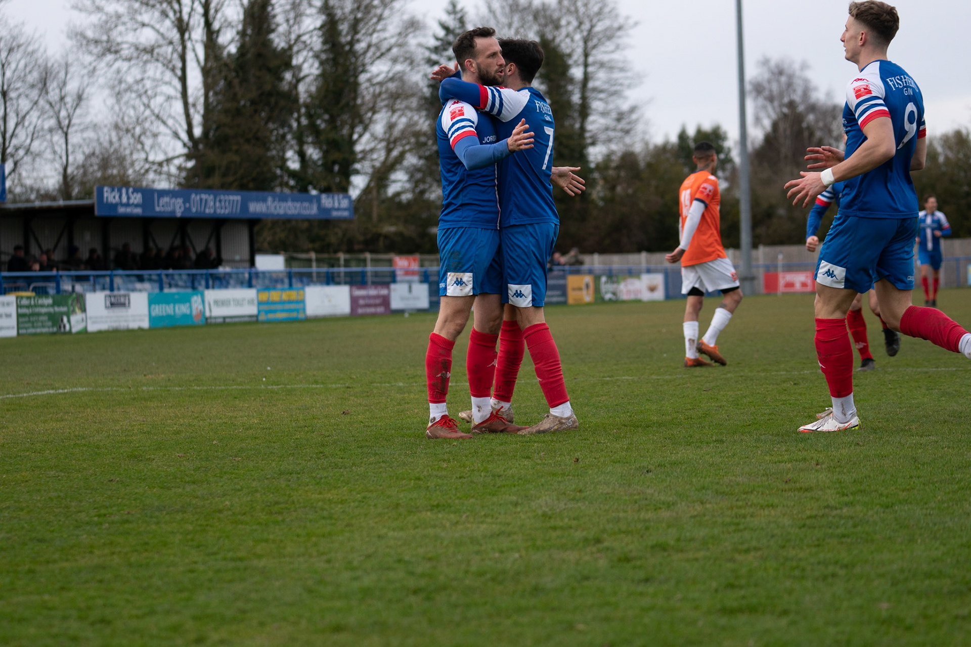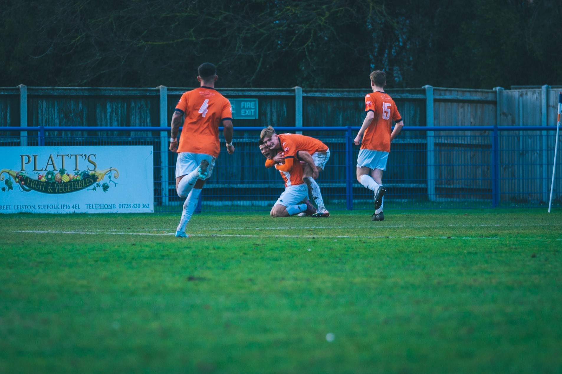 Leiston celebrating with Captain Seb Dunbar hugging goal scorer Fin Barnes