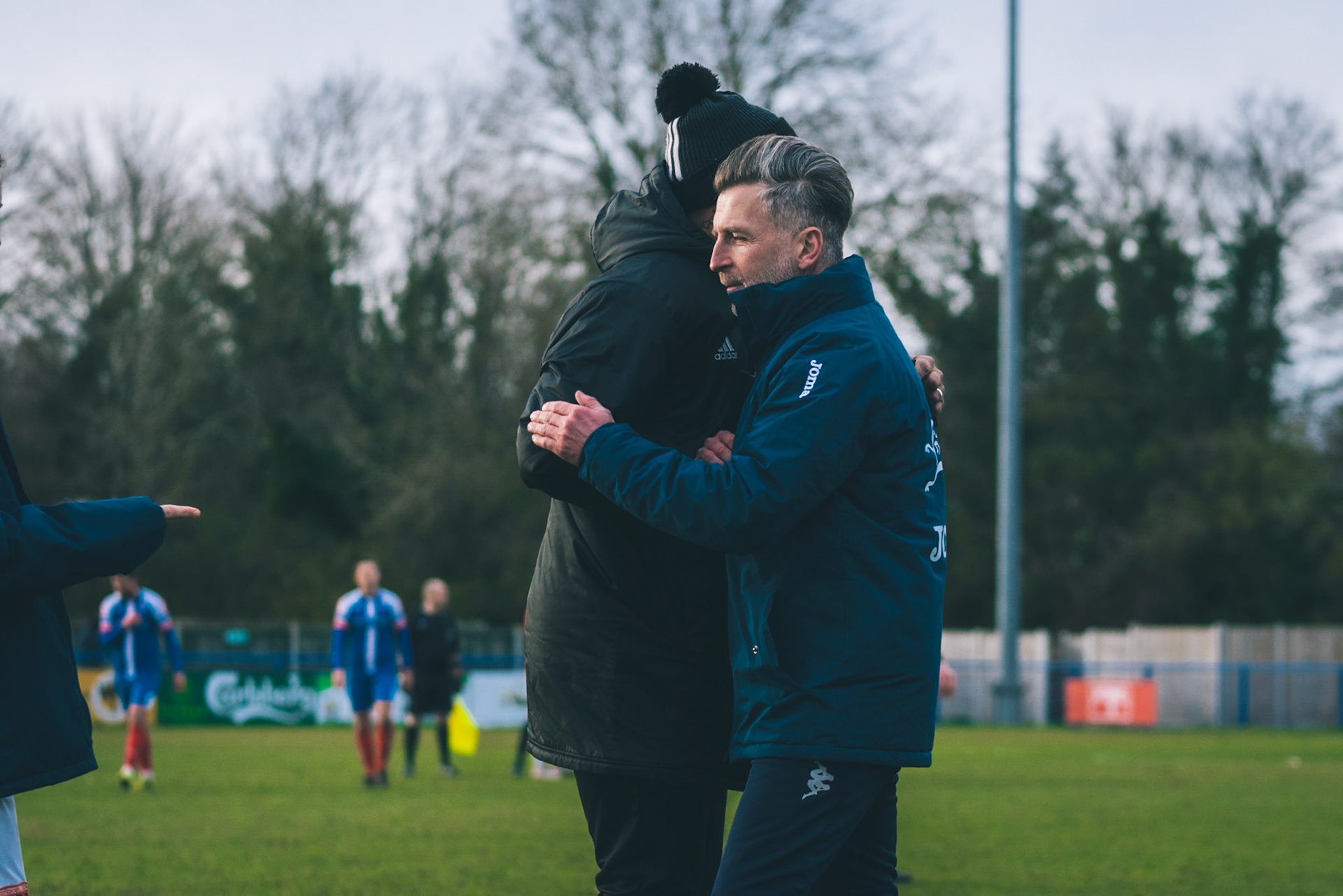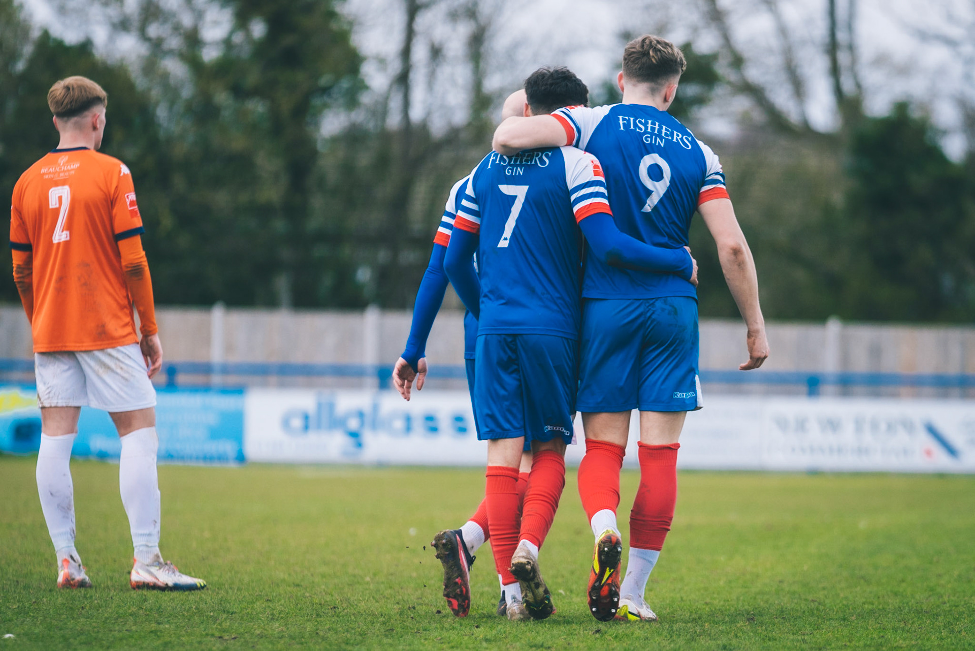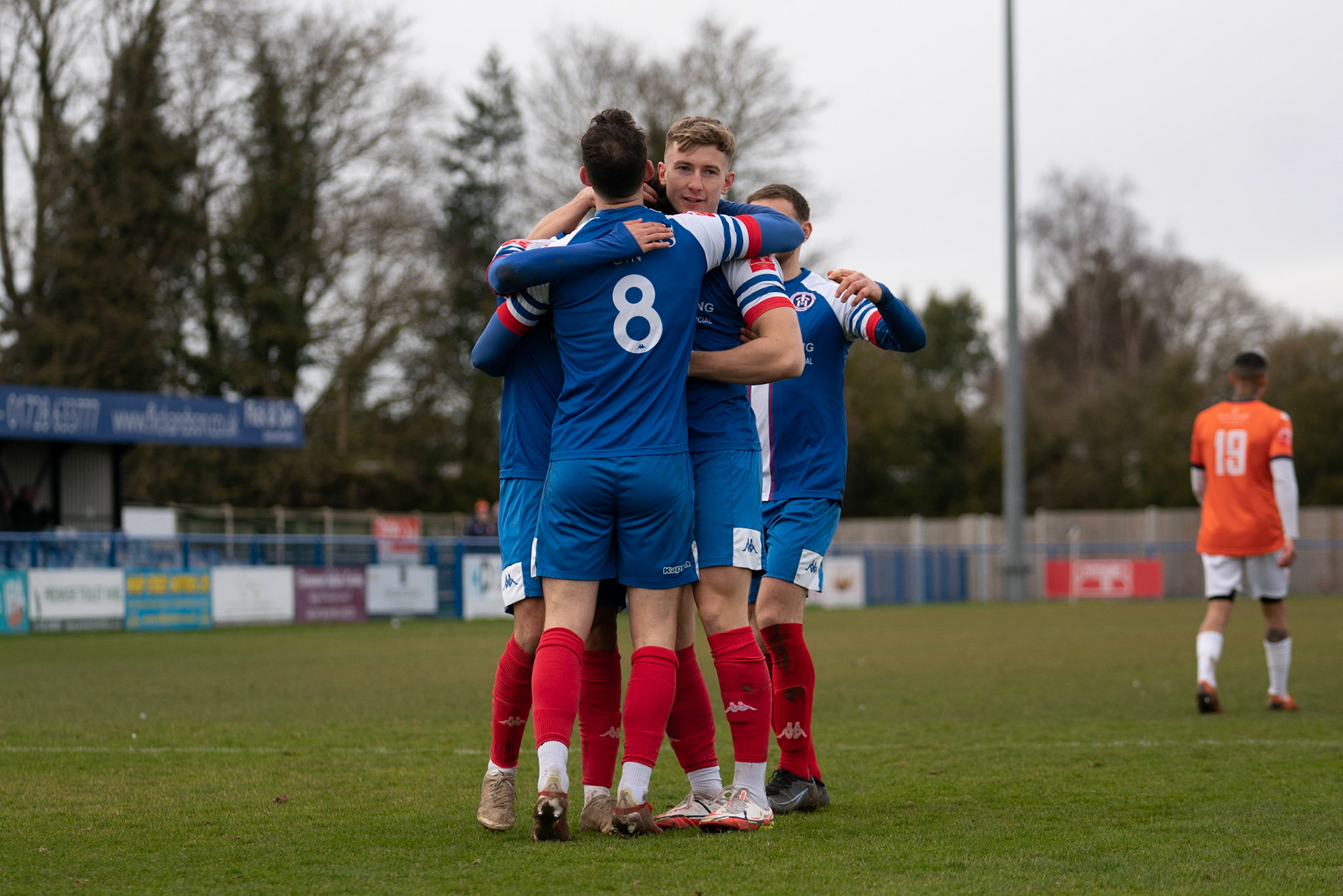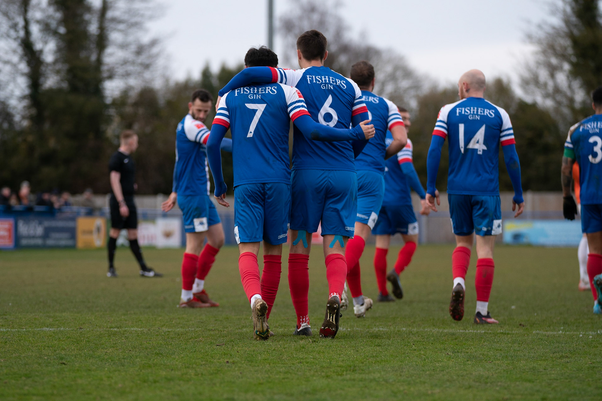 Leiston celebrating with Captain Seb Dunbar hugging goal scorer Fin Barnes